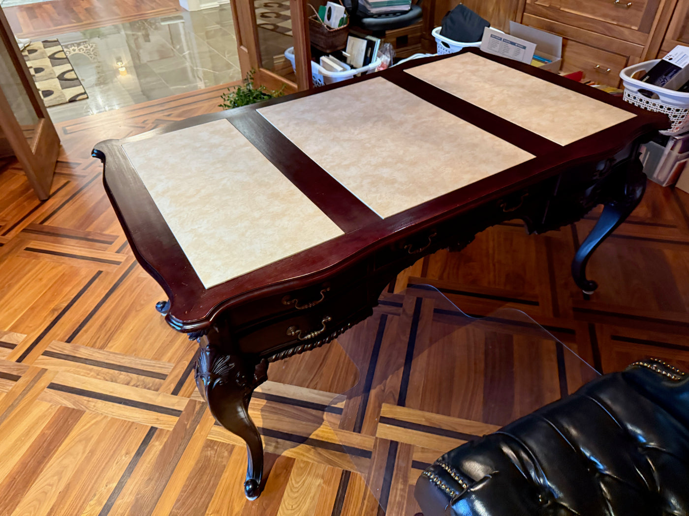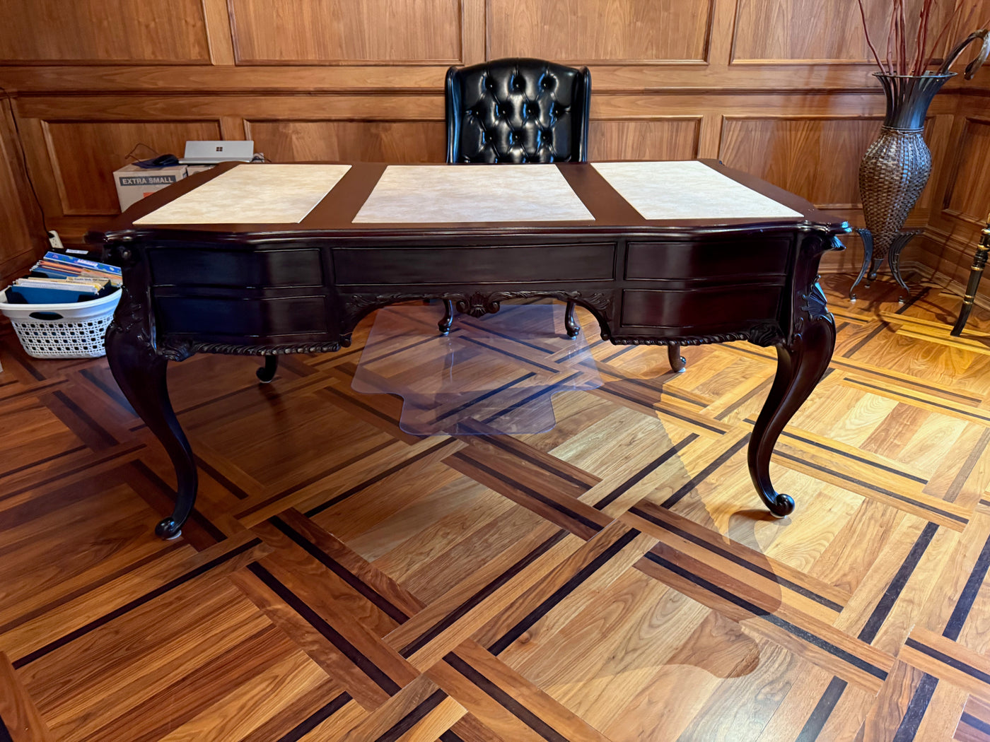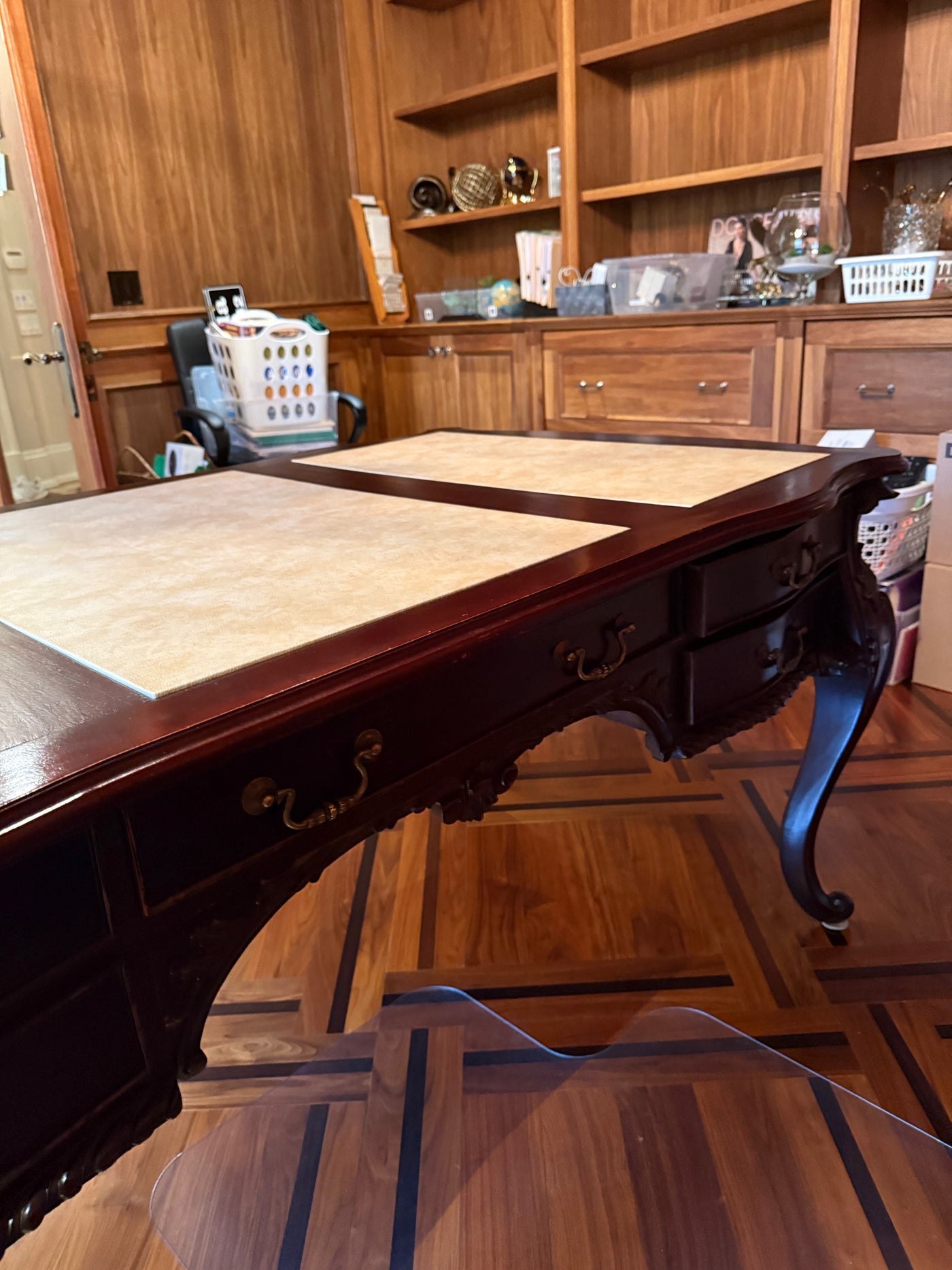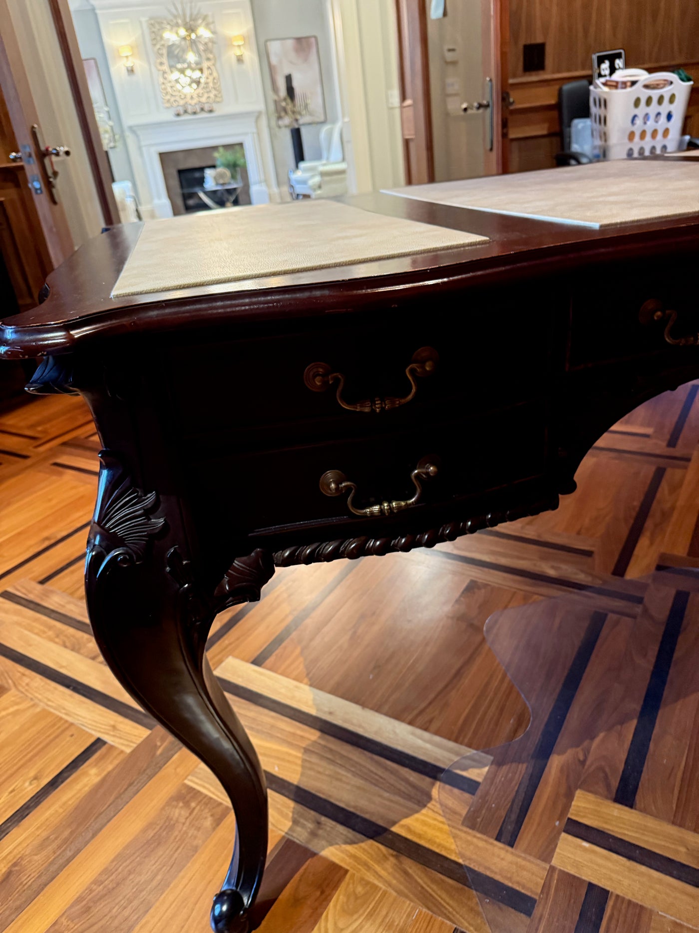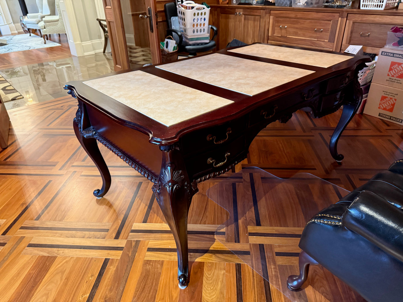 Executive Leather Top Partners Desk. 3 leather panels on the top with a carved wood frame.