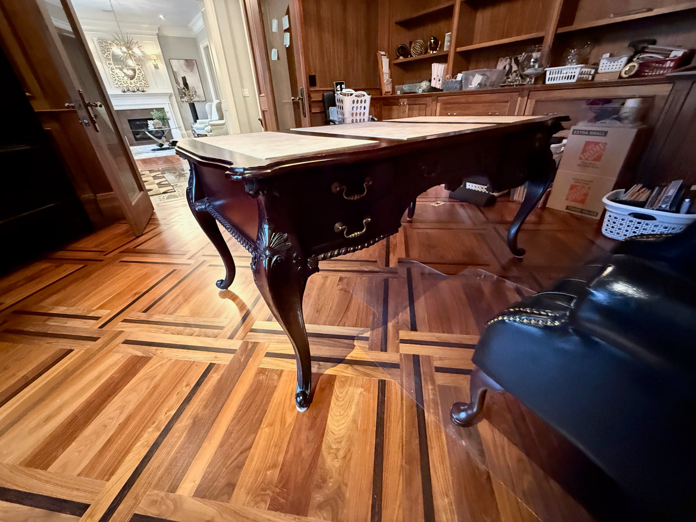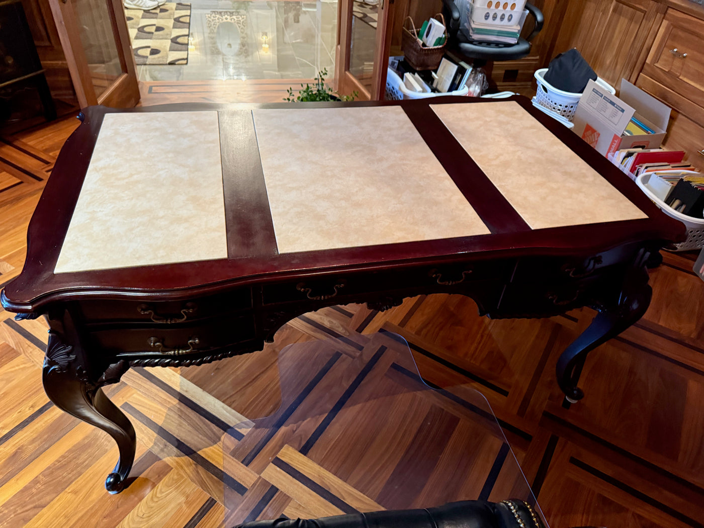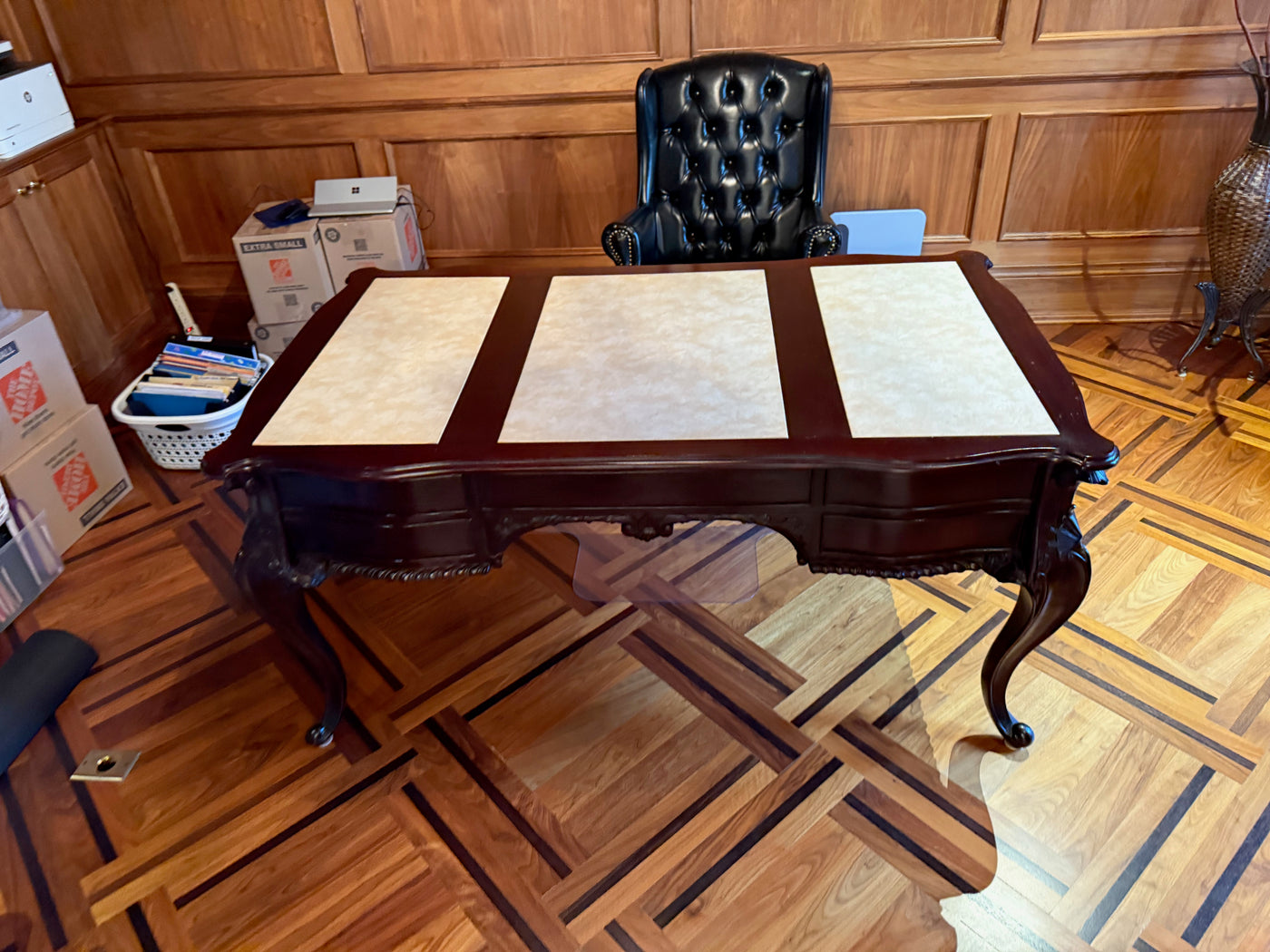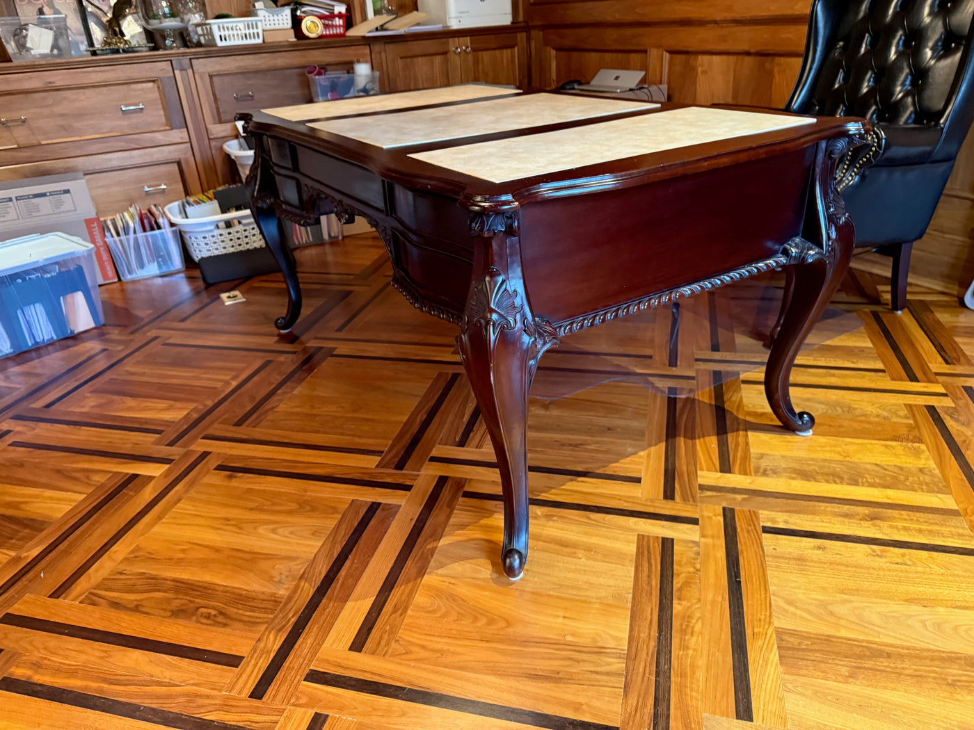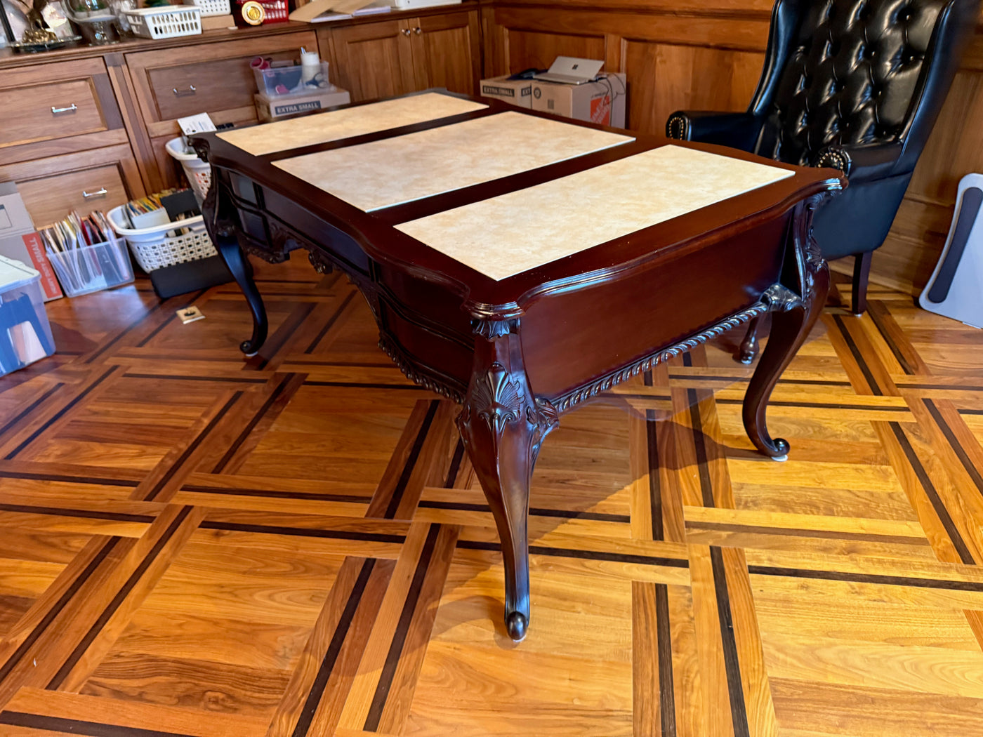Executive Leather Top Partners Desk. 3 leather panels on the top with a carved wood frame.