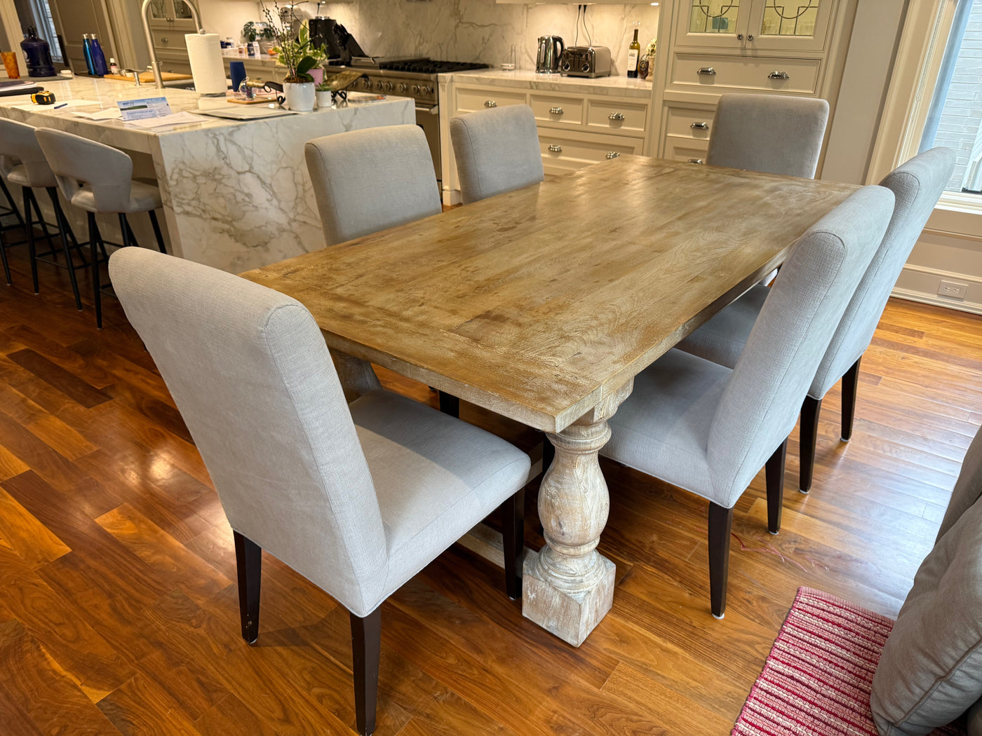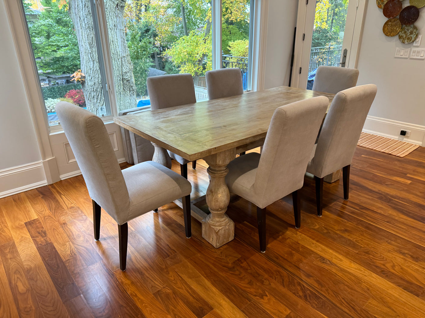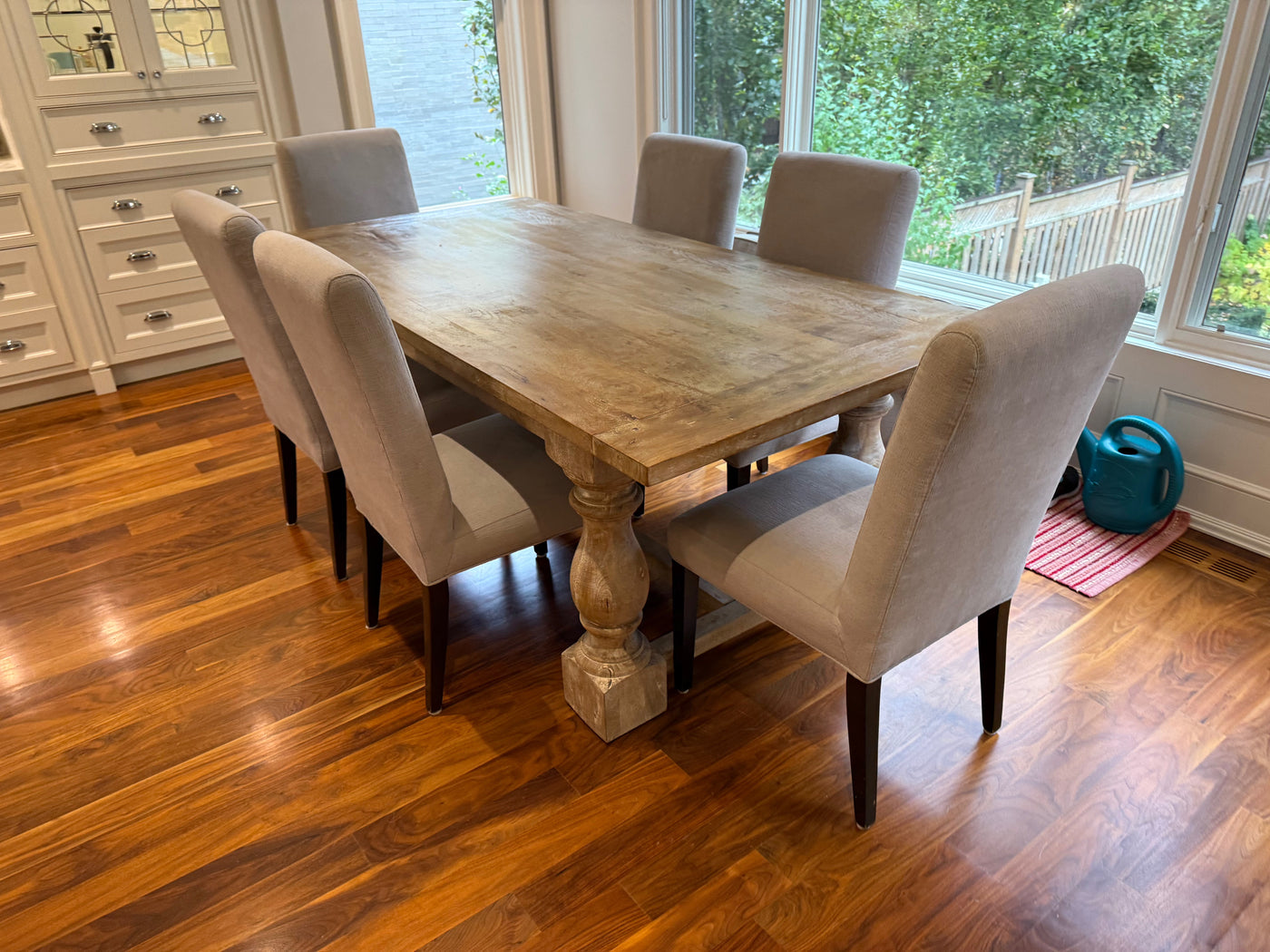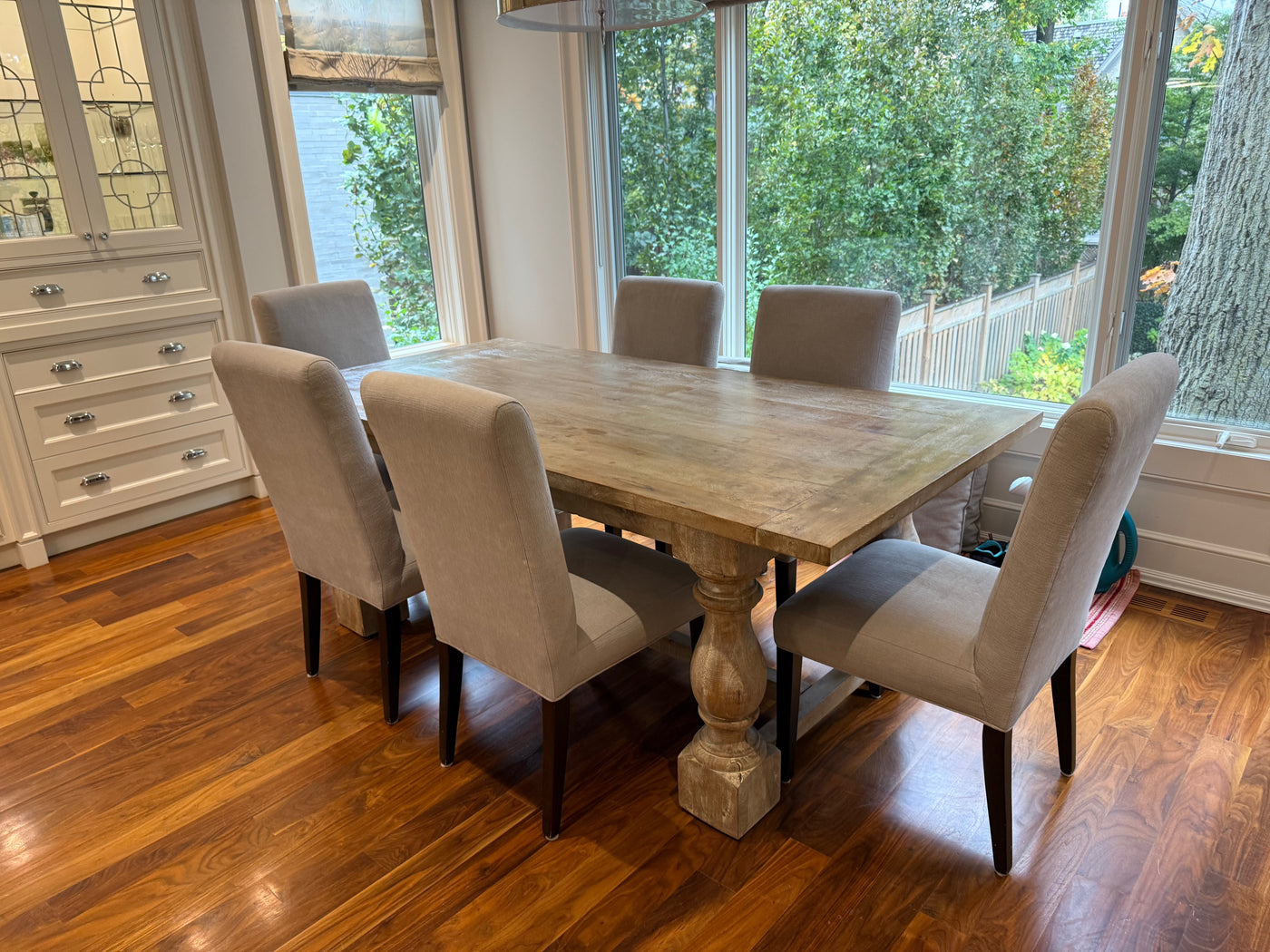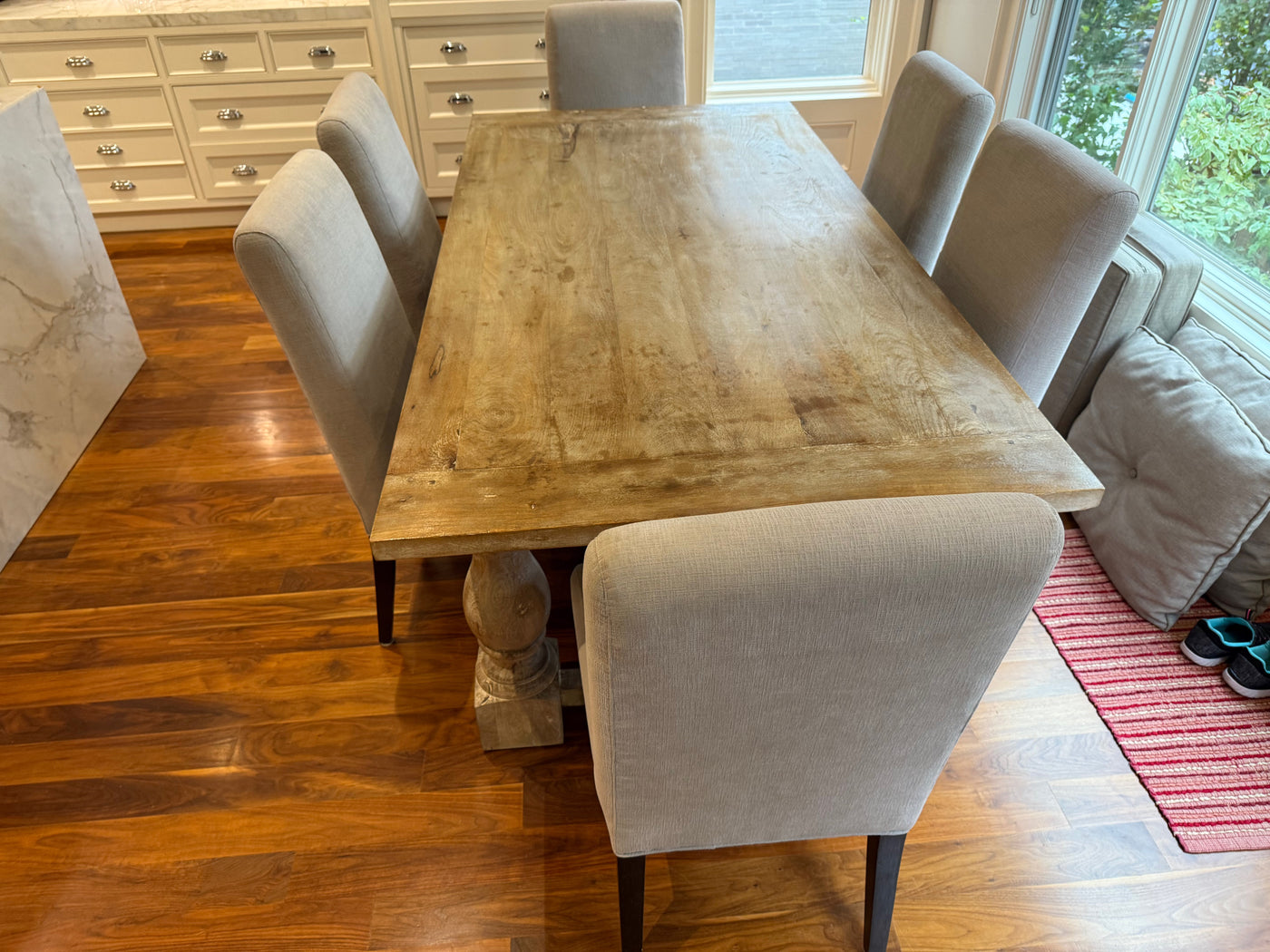 Salvaged Wood Style Dining Table + 8 Custom Grey Fabric Chairs.