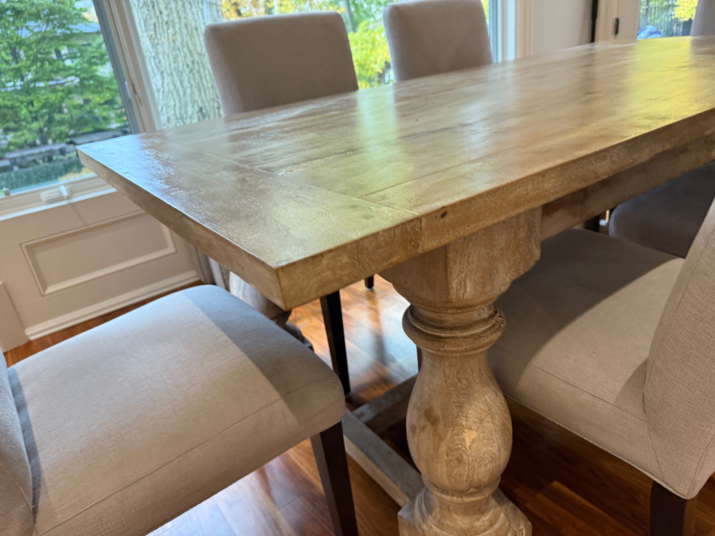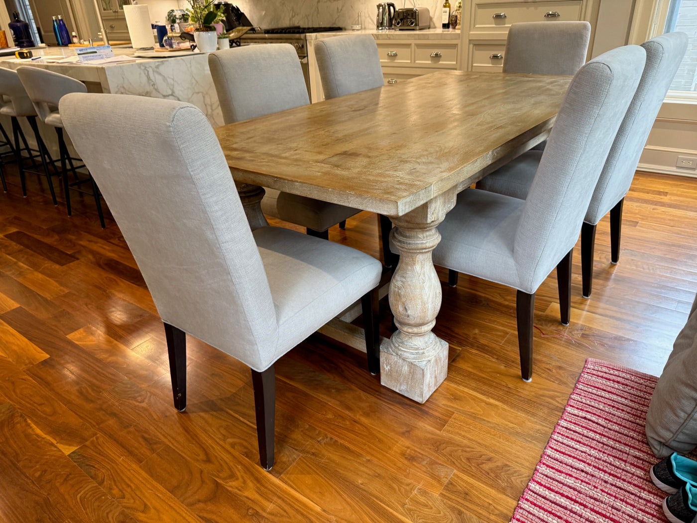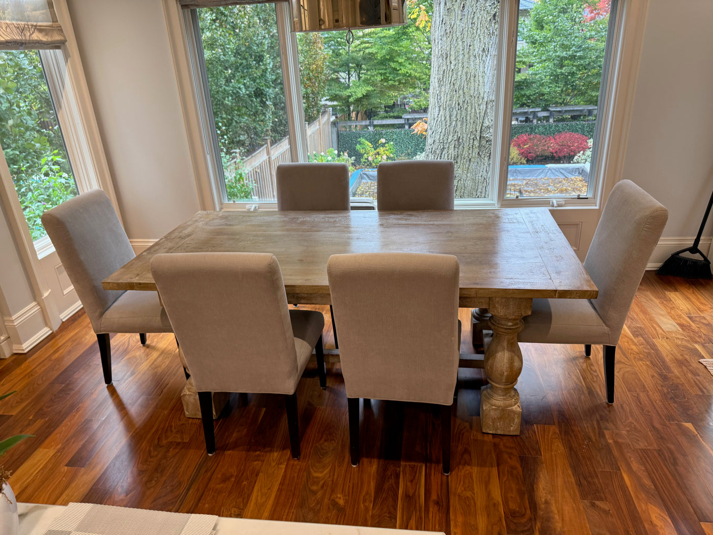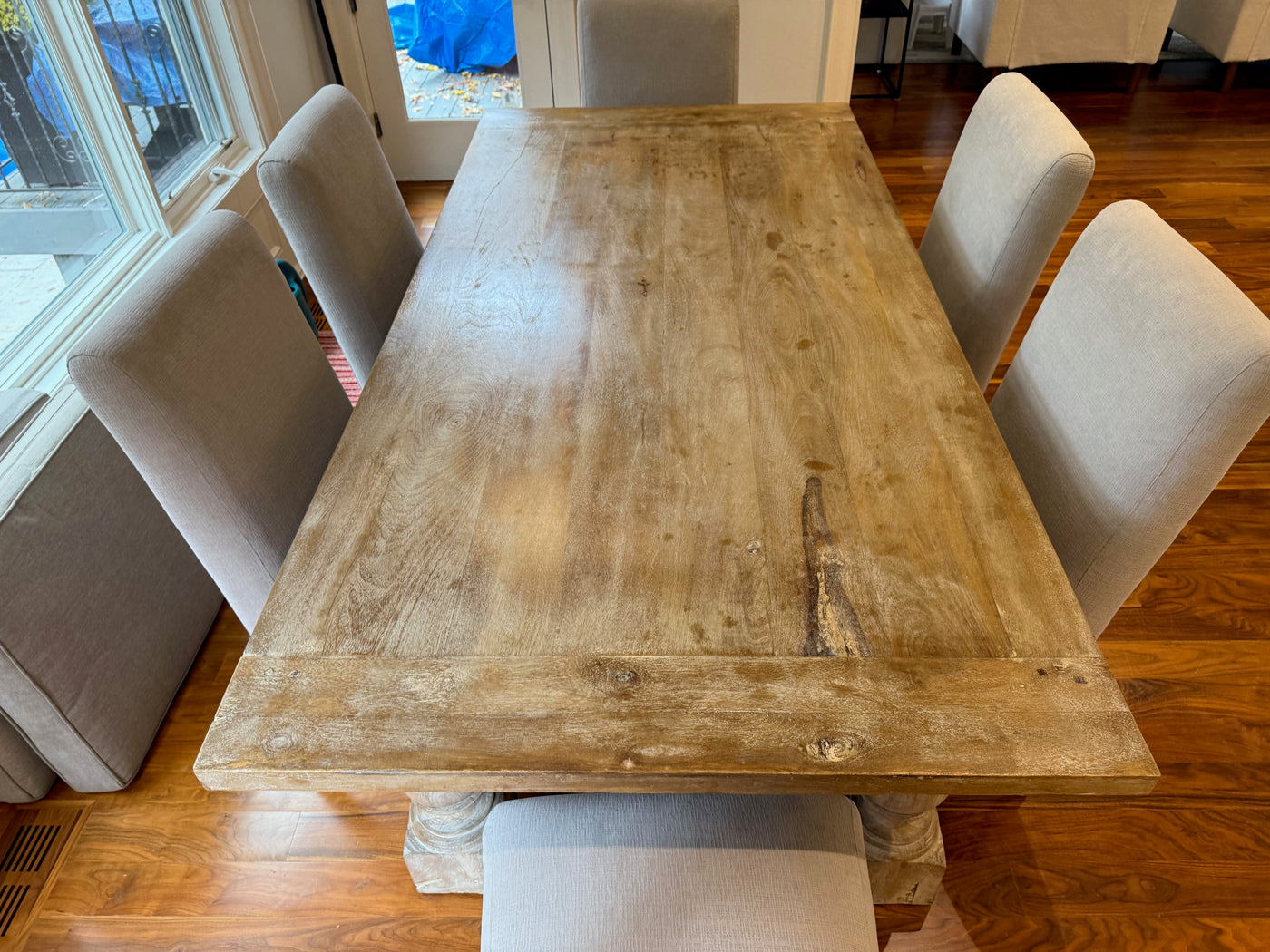 Salvaged Wood Style Dining Table + 8 Custom Grey Fabric Chairs.