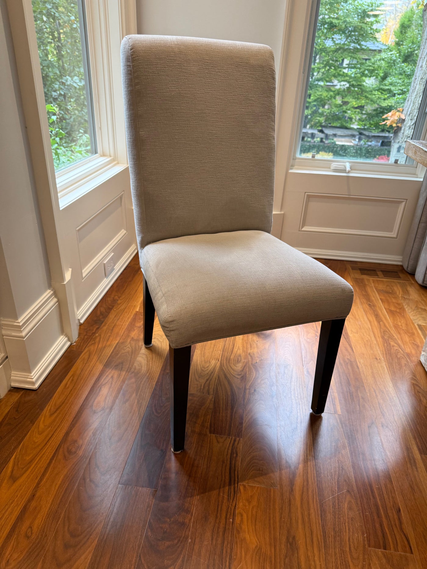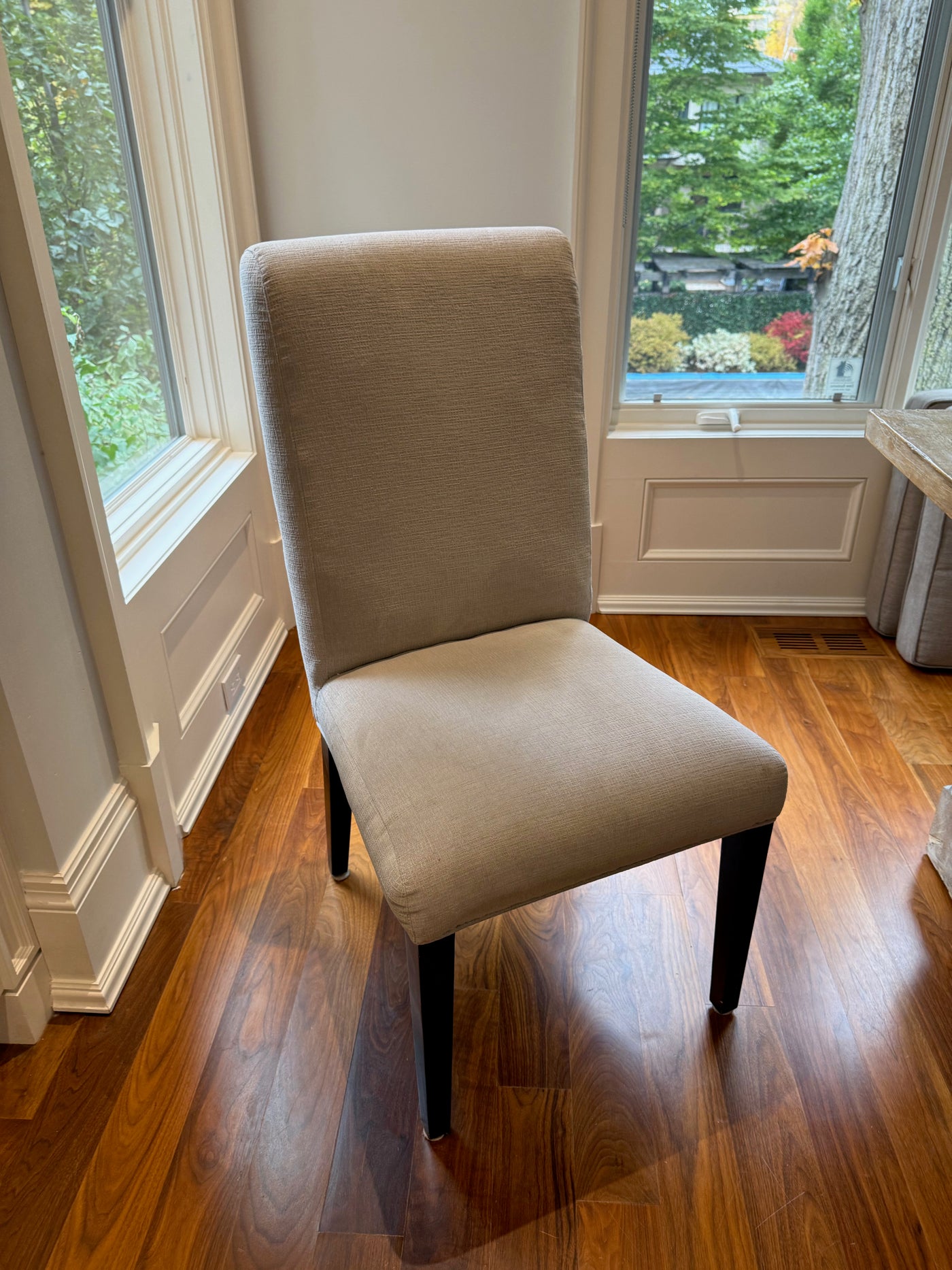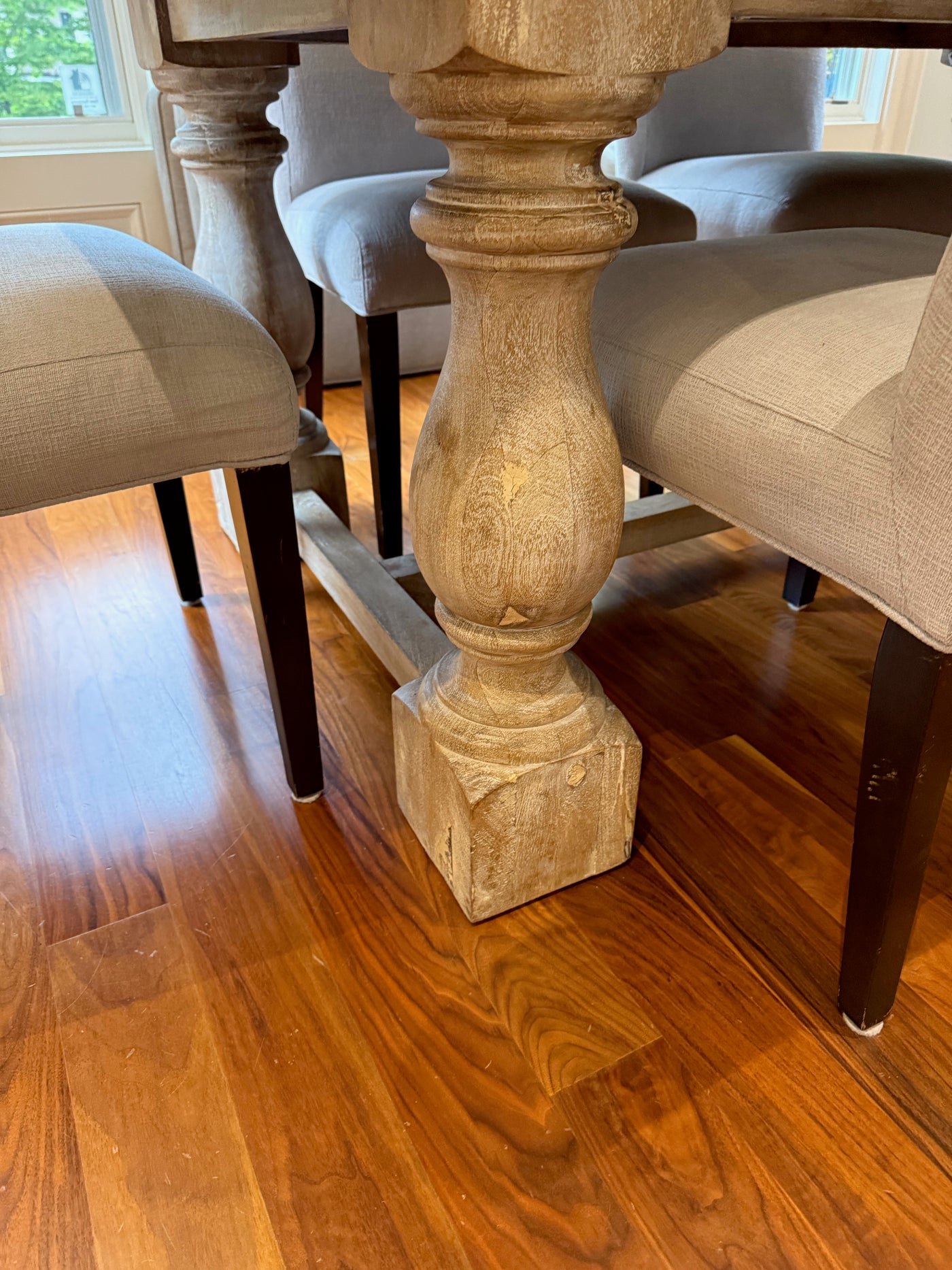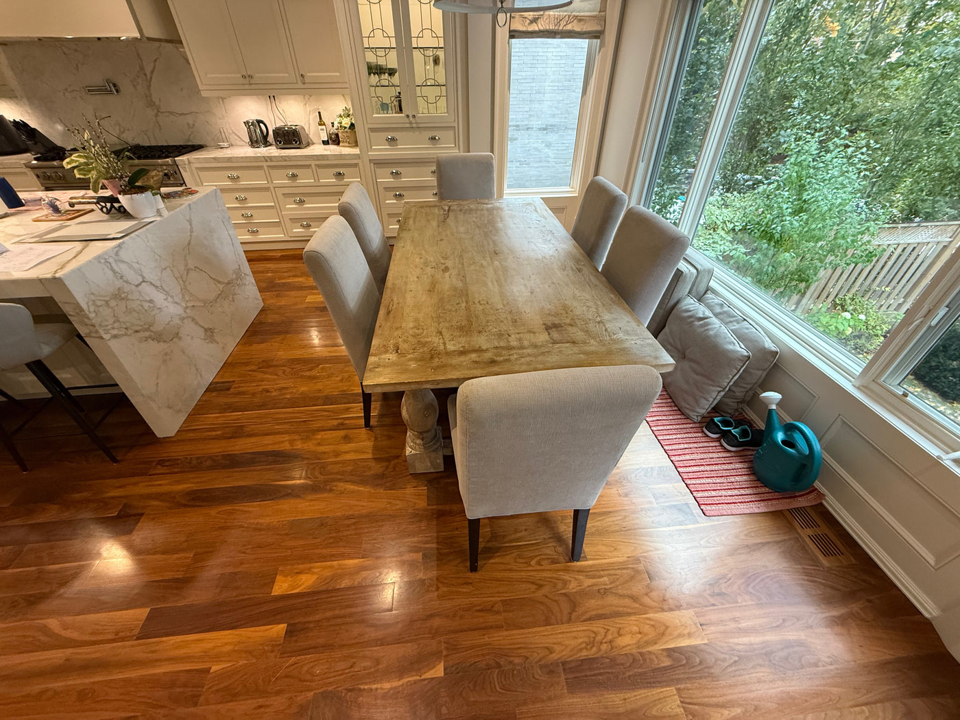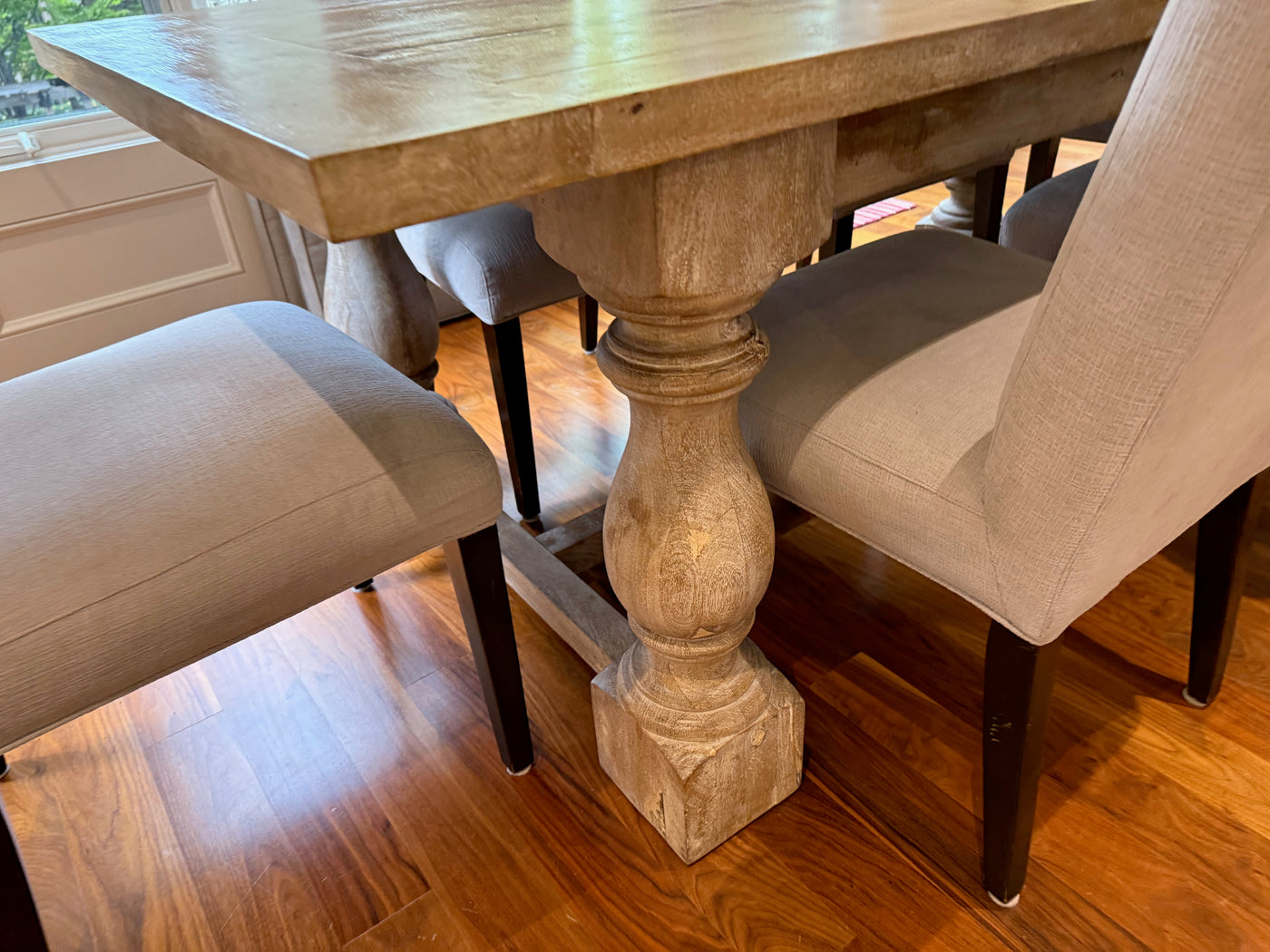 Salvaged Wood Style Dining Table + 8 Custom Grey Fabric Chairs.
