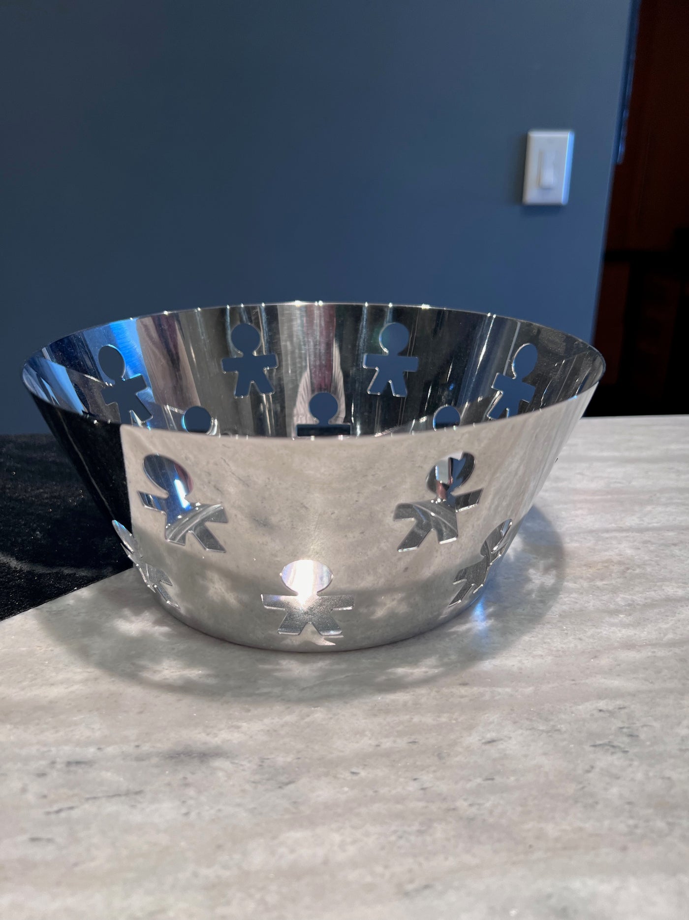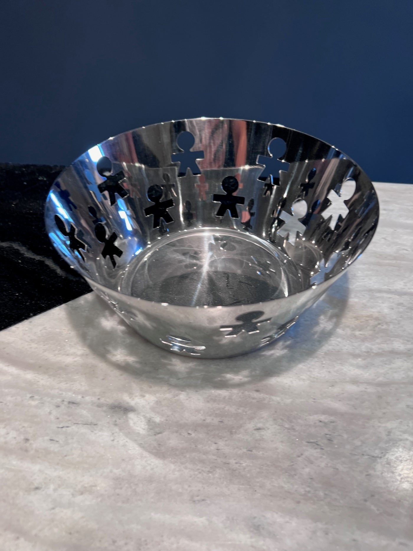 Fruit basket with pierced edge in coloured steel. The cartoon men created by the King-Kong team are a symbol and icon of mirror polished design based on the use of "affective codes", so much so that they are one of its most oft-cited examples. The "standing men" have appeared on objects from the farthest corners of Alessi tradition, like trays and baskets, and then they multiplied, invaded and conquered other groups of objects - and not just in the kitchen and at the table