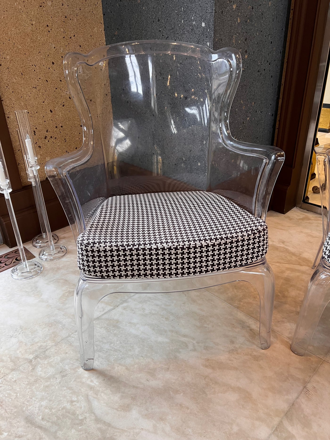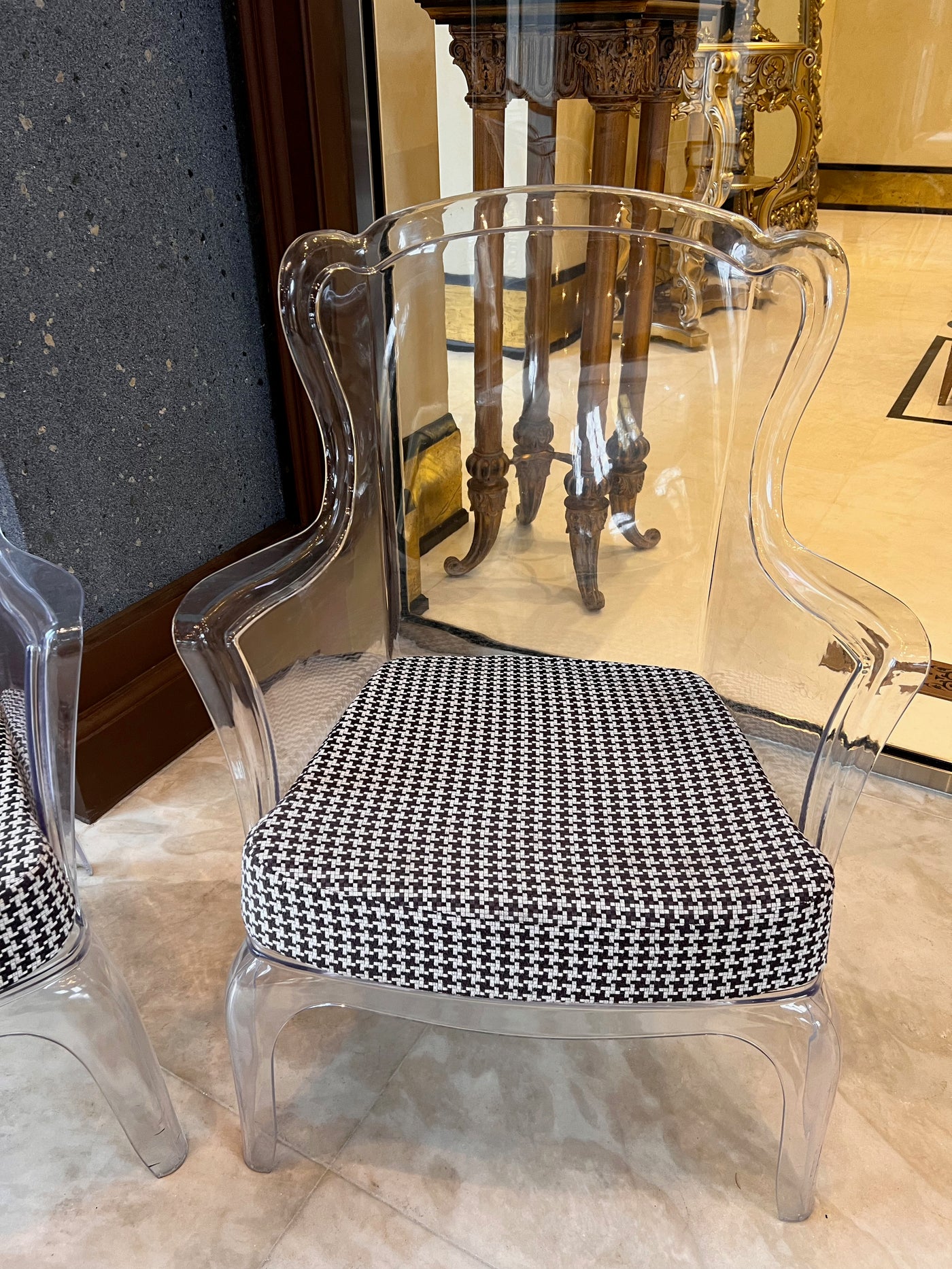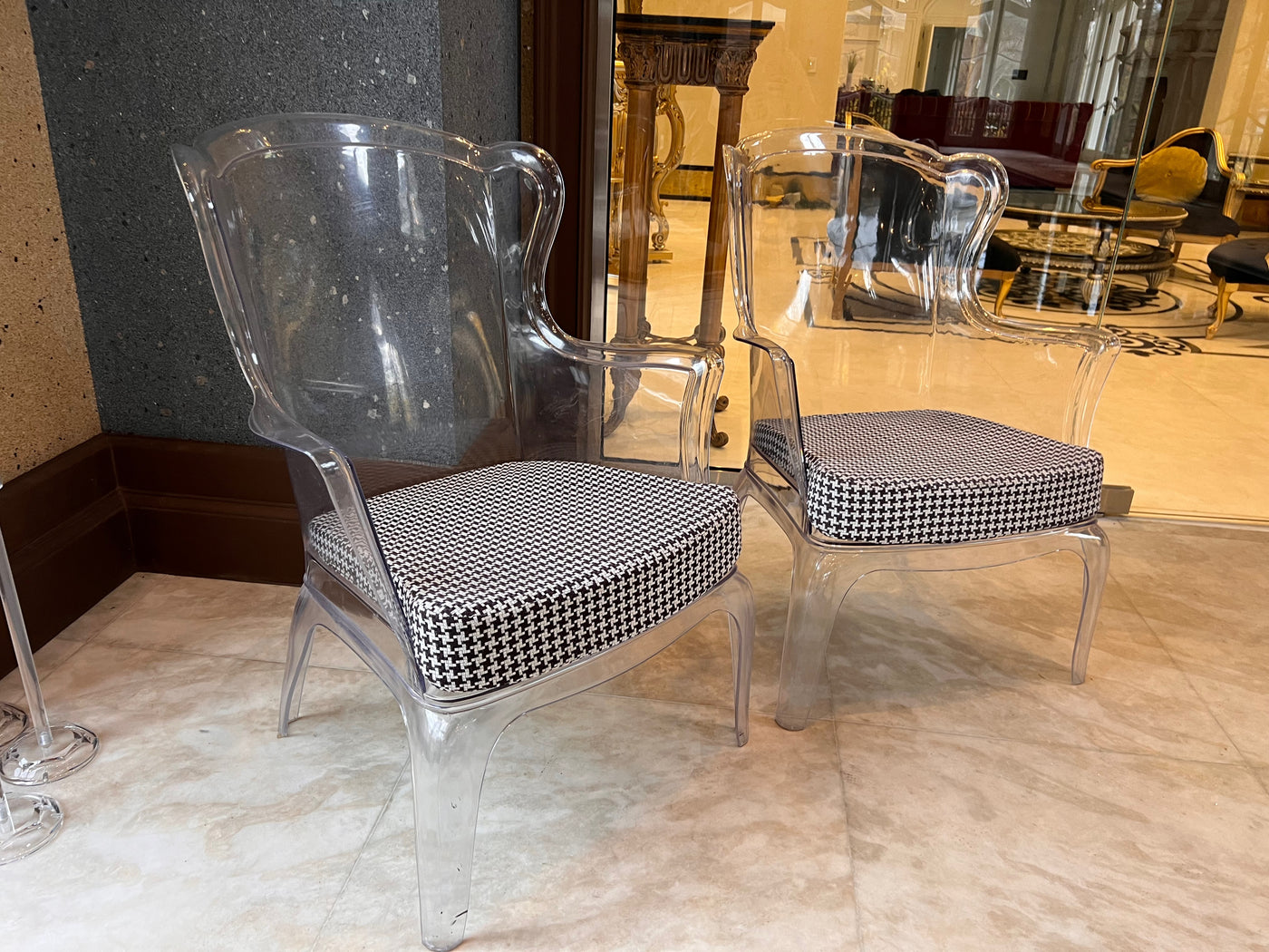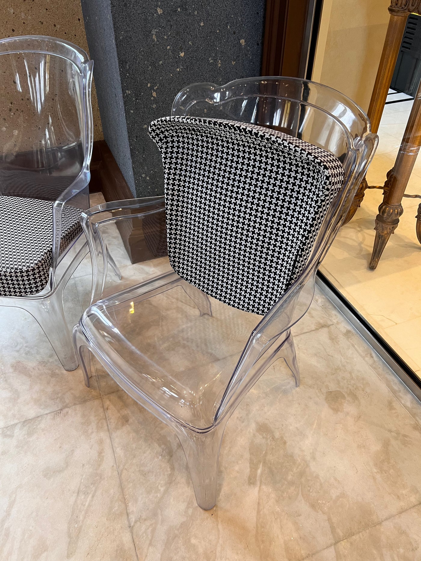 Transparent with a black and white removable cushion. Chairs have a few minor marks consistent with use.
