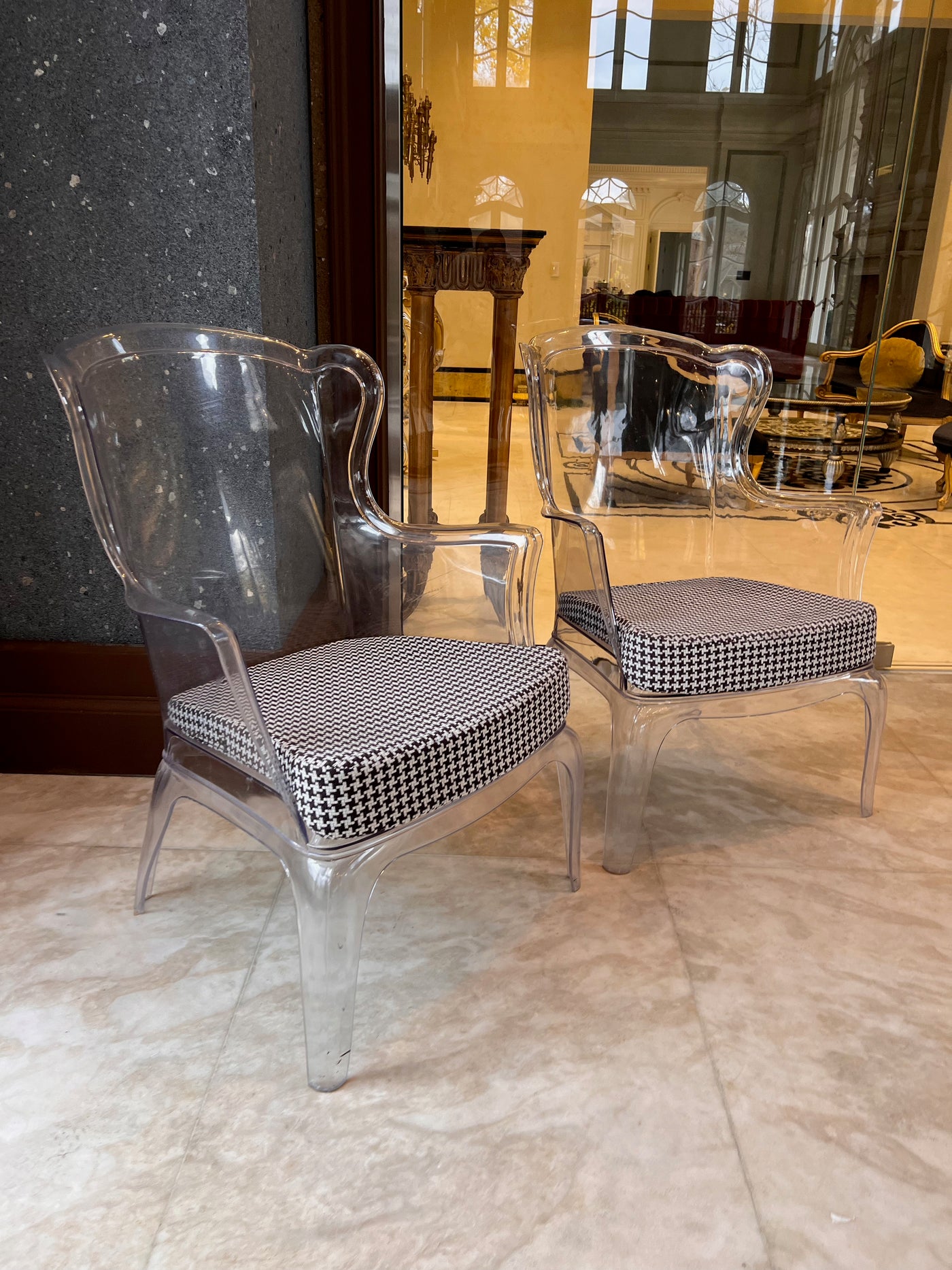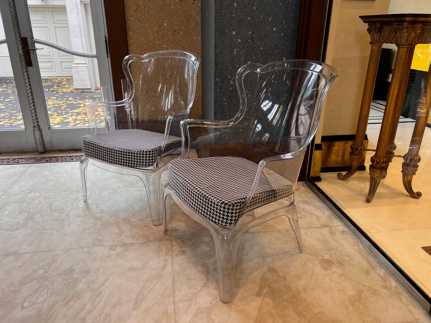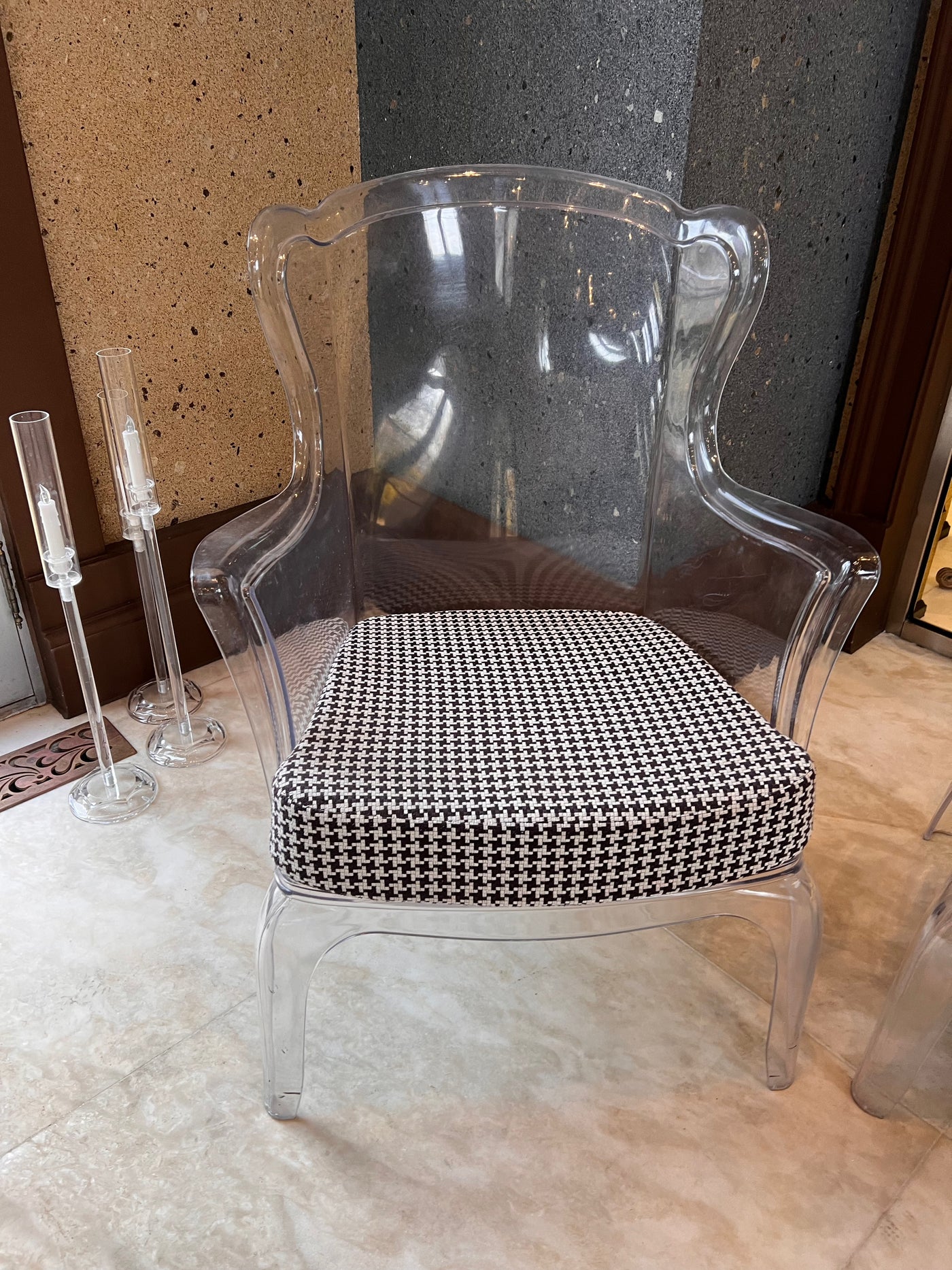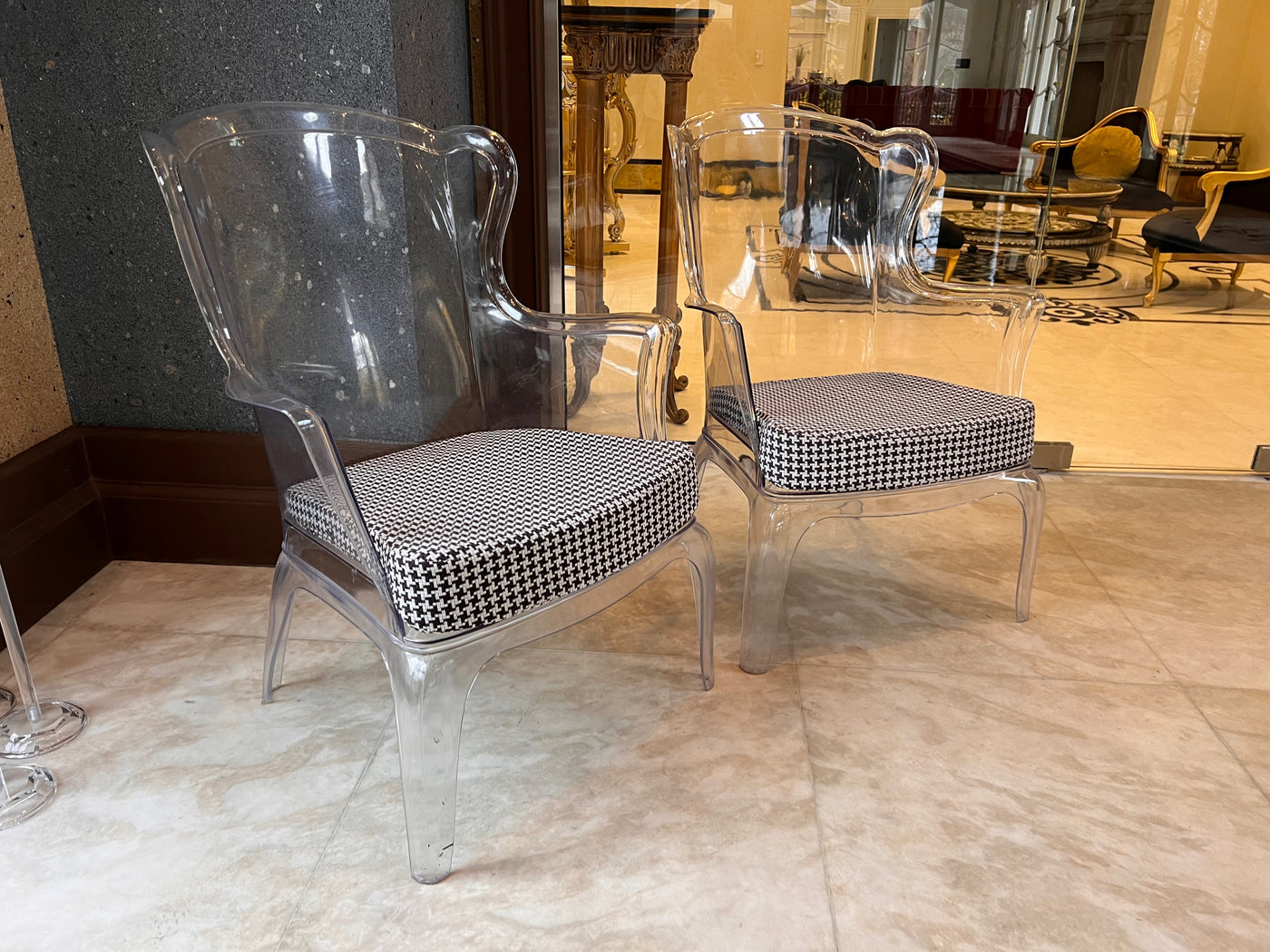 Transparent with a black and white removable cushion. Chairs have a few minor marks consistent with use.