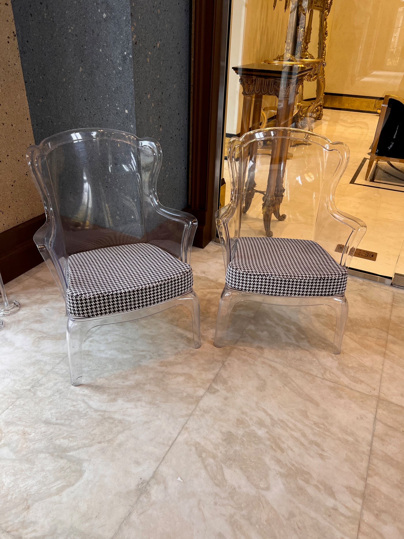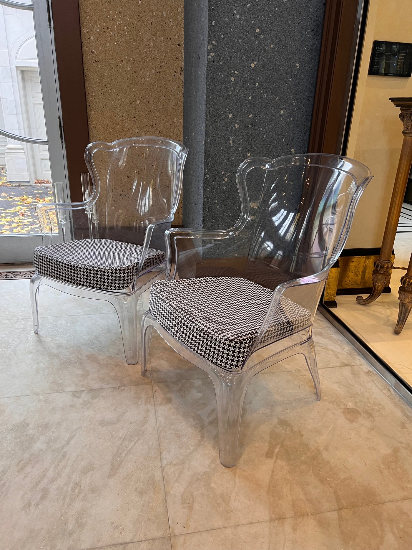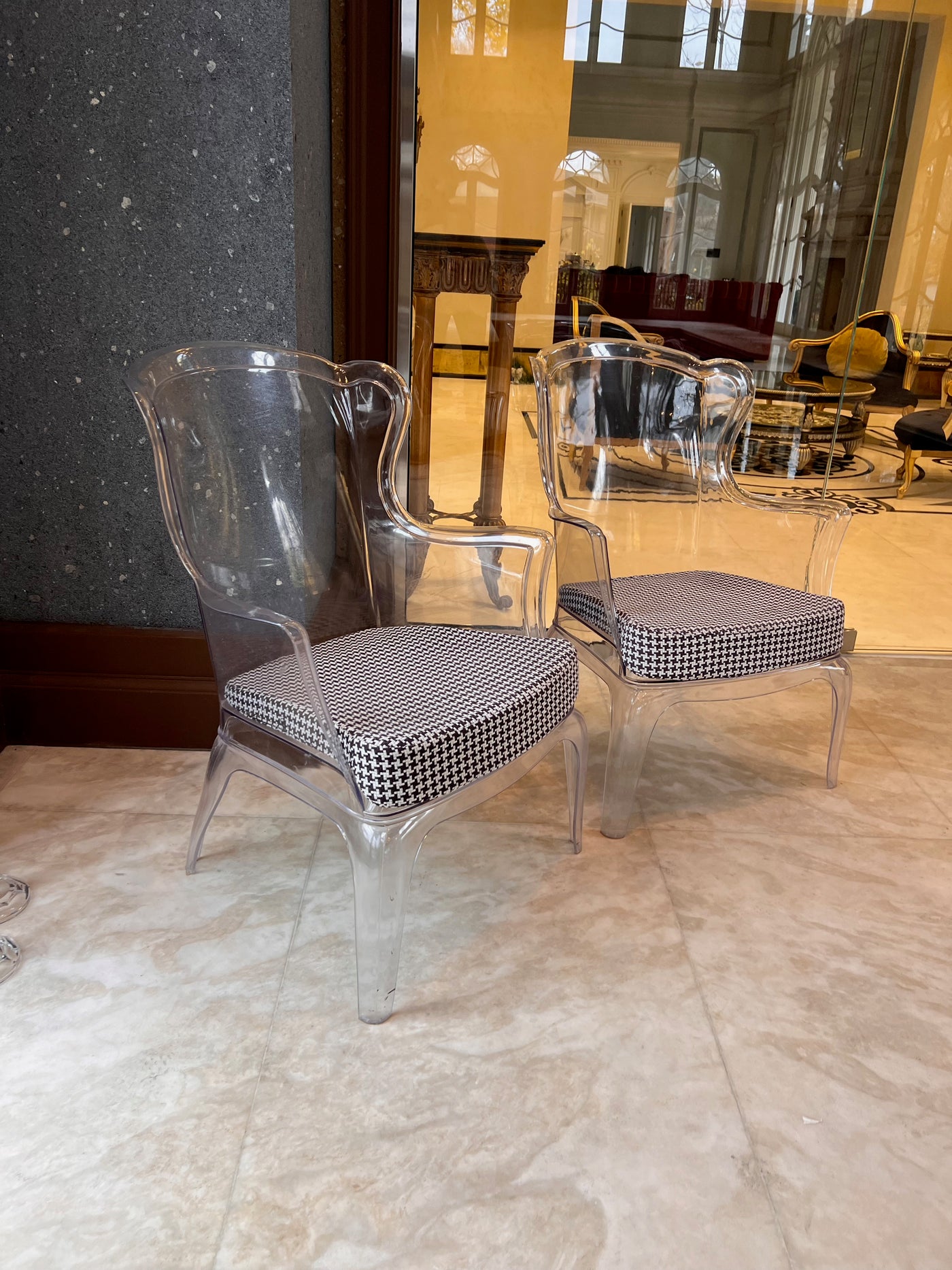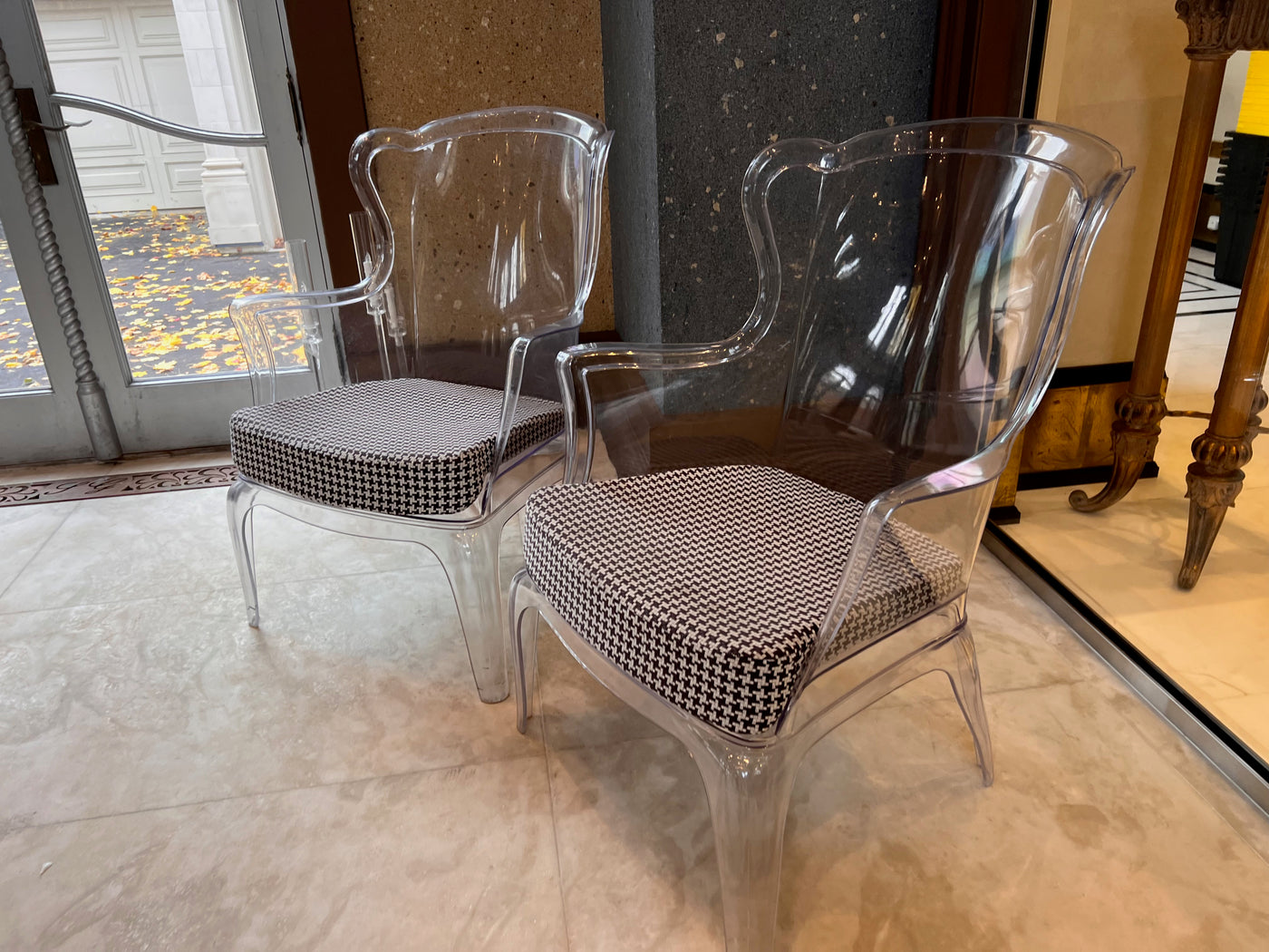 Transparent with a black and white removable cushion. Chairs have a few minor marks consistent with use.