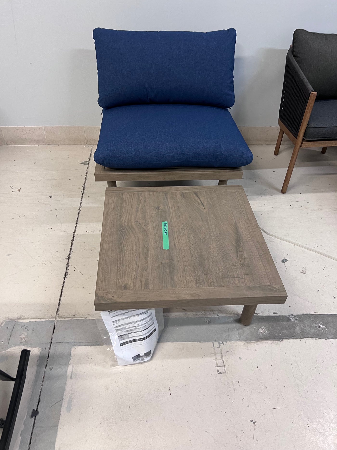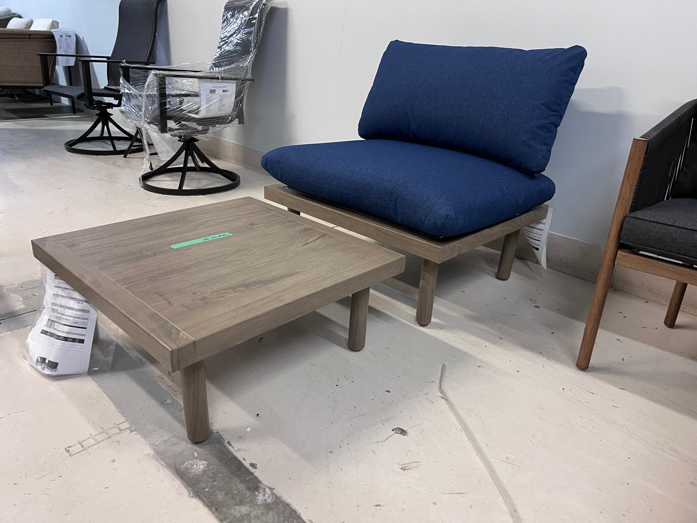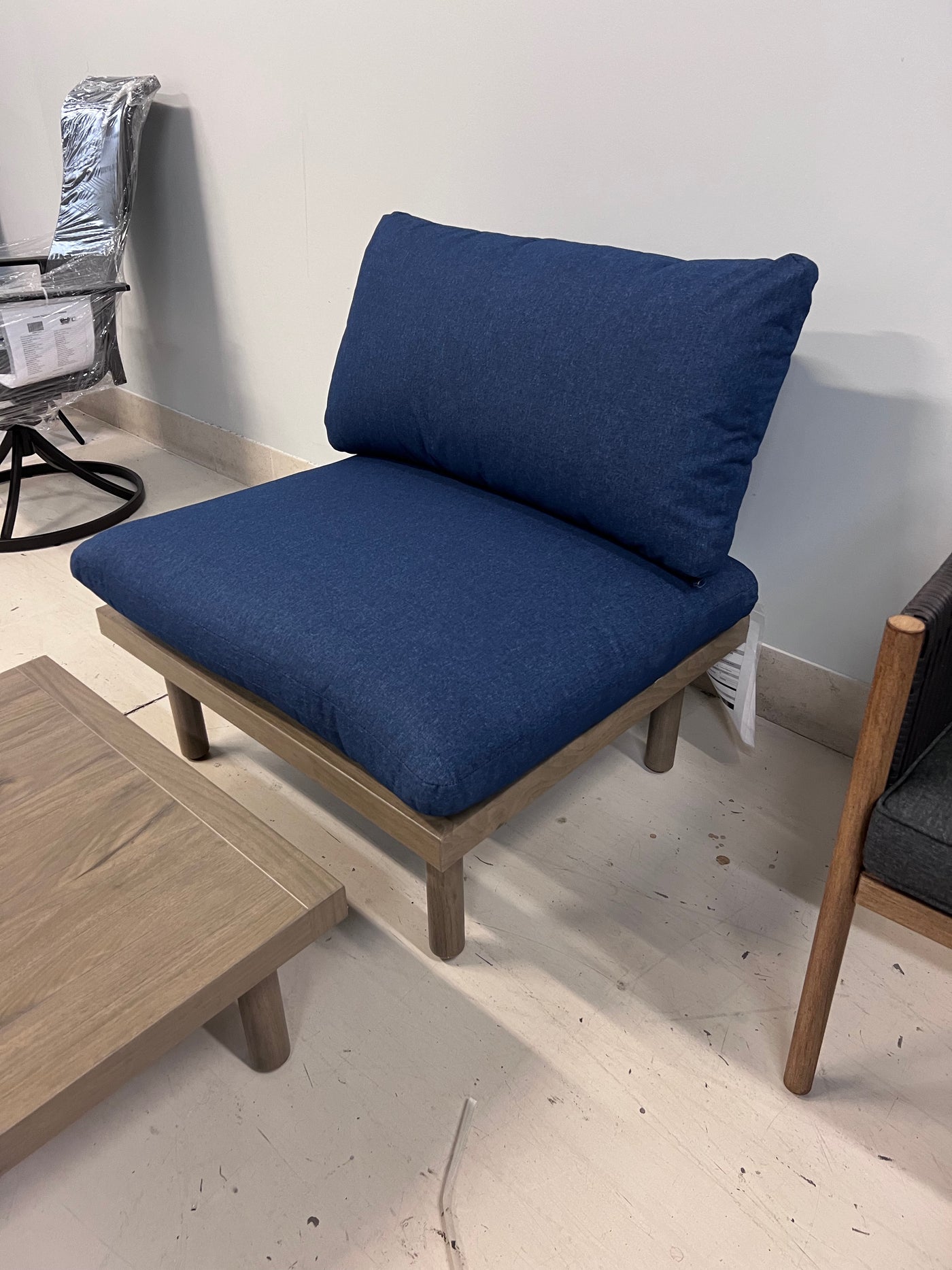 Low Profile Large Armless Lounge Chair with Blue Cushions + Coffee Table