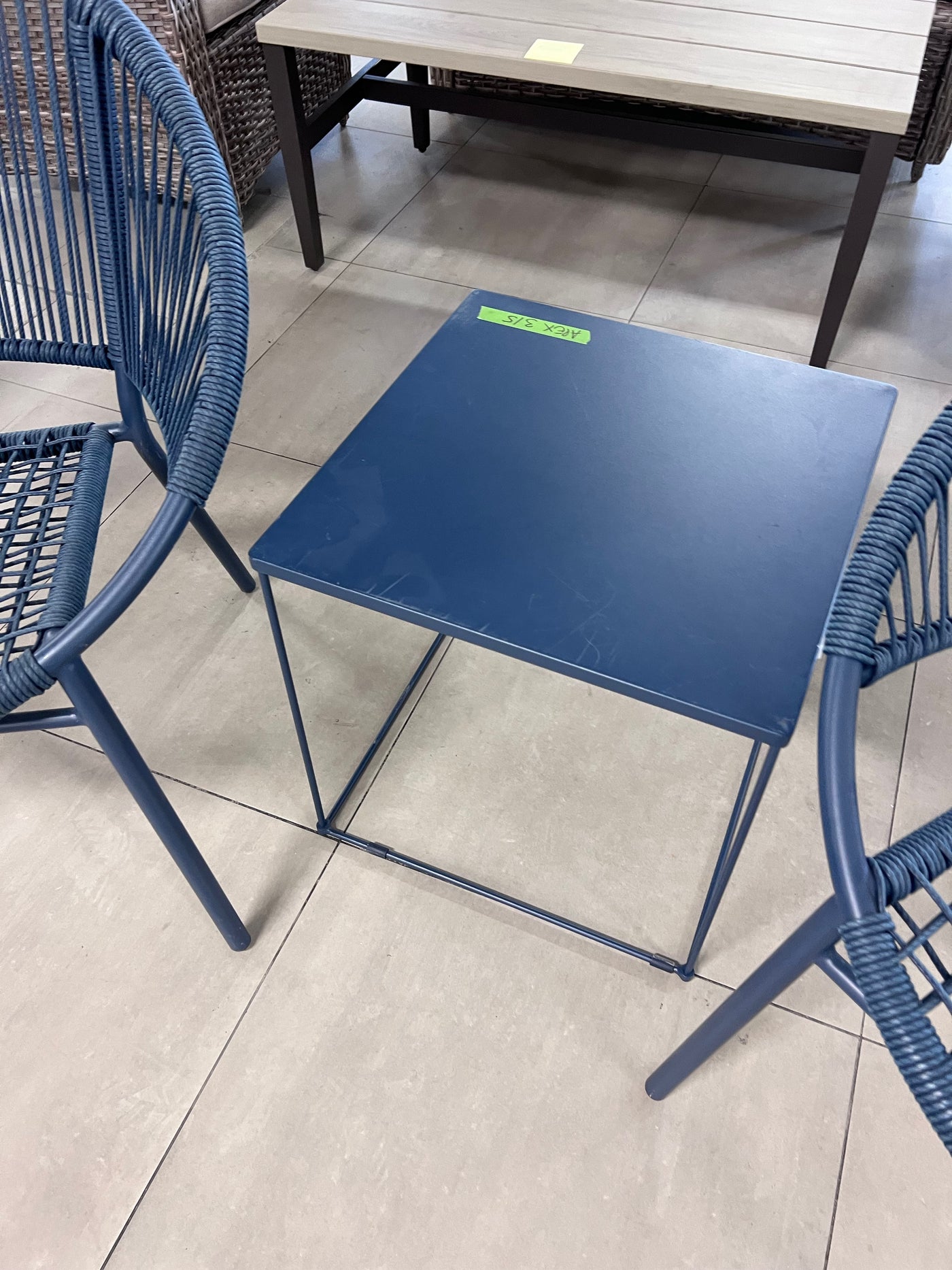 2 Blue Wicker Egg Chairs + Side Table.