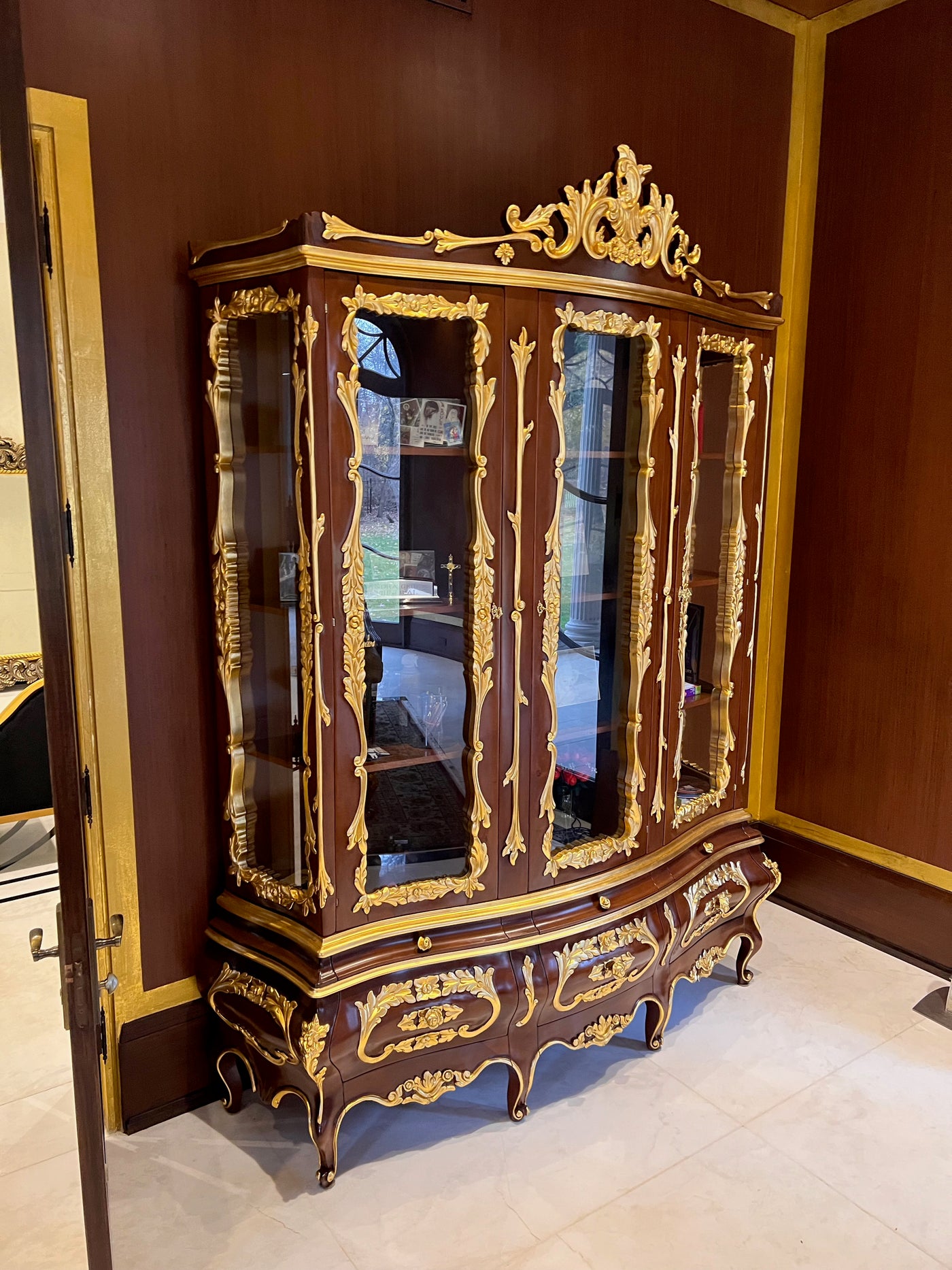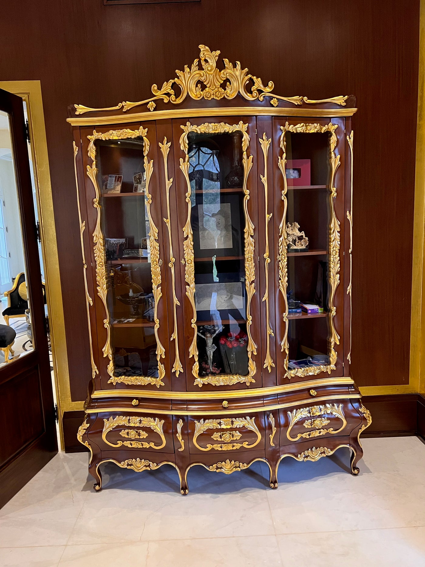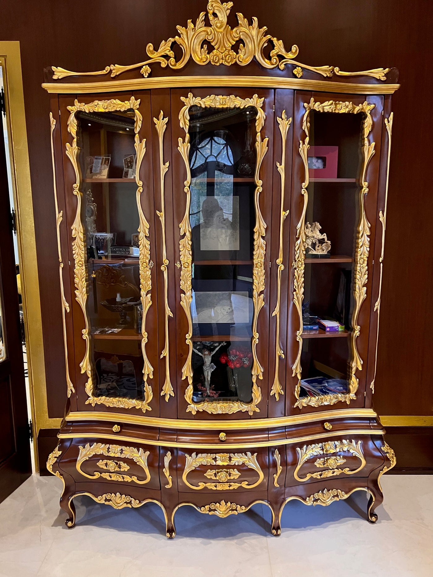 'Modenese Gastone Luxury Interiors' Baroque Display Cabinet, Walnut Finish with Gold Leaf Details, Made in Italy.