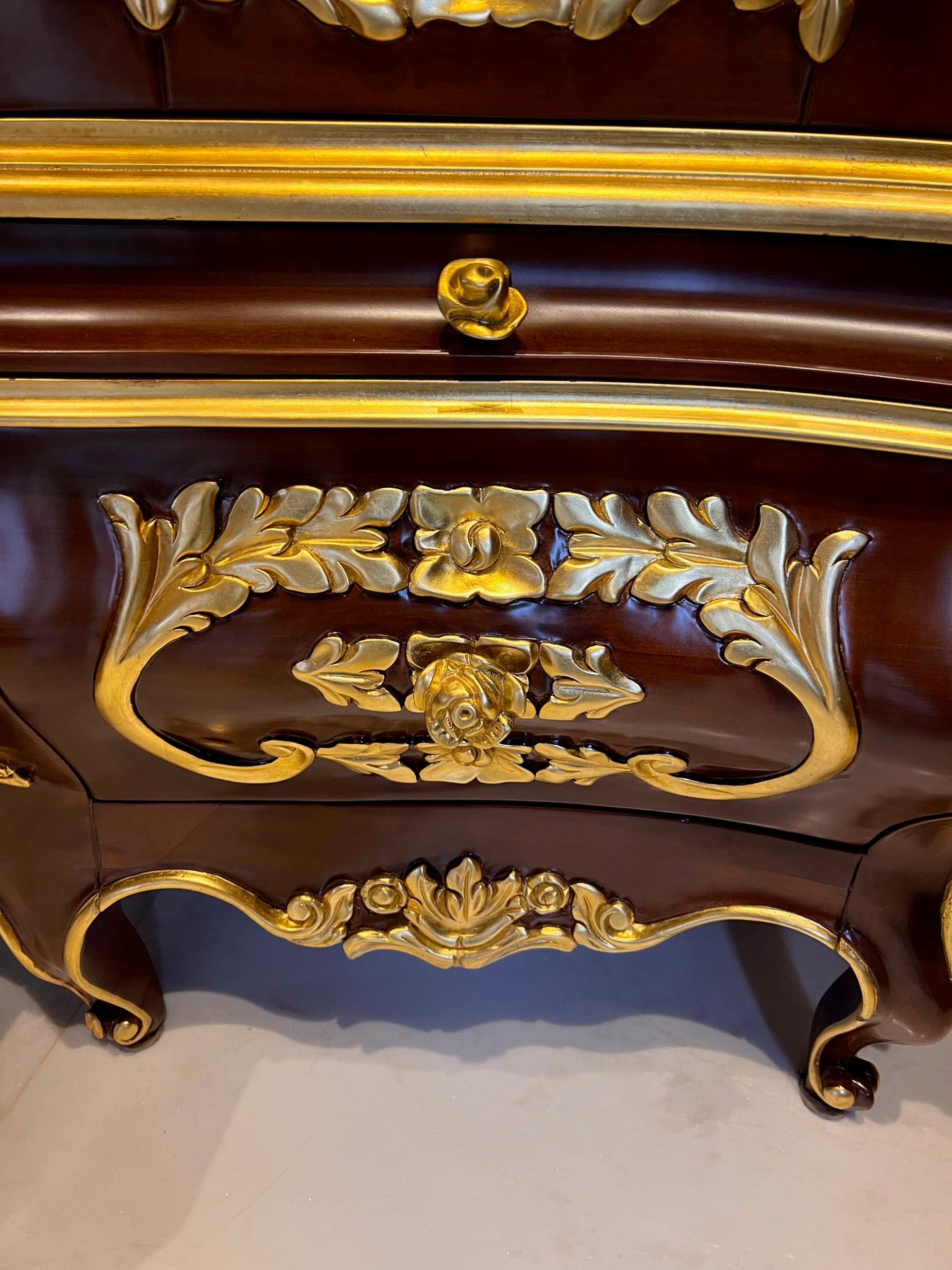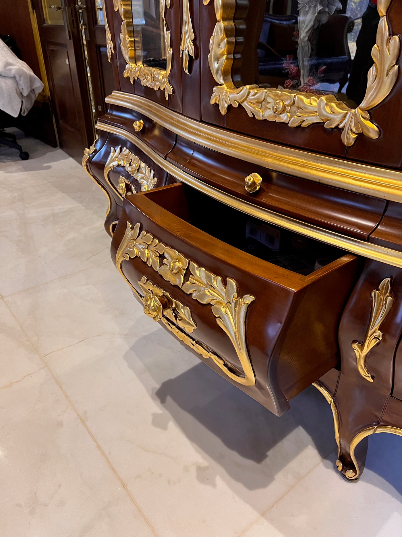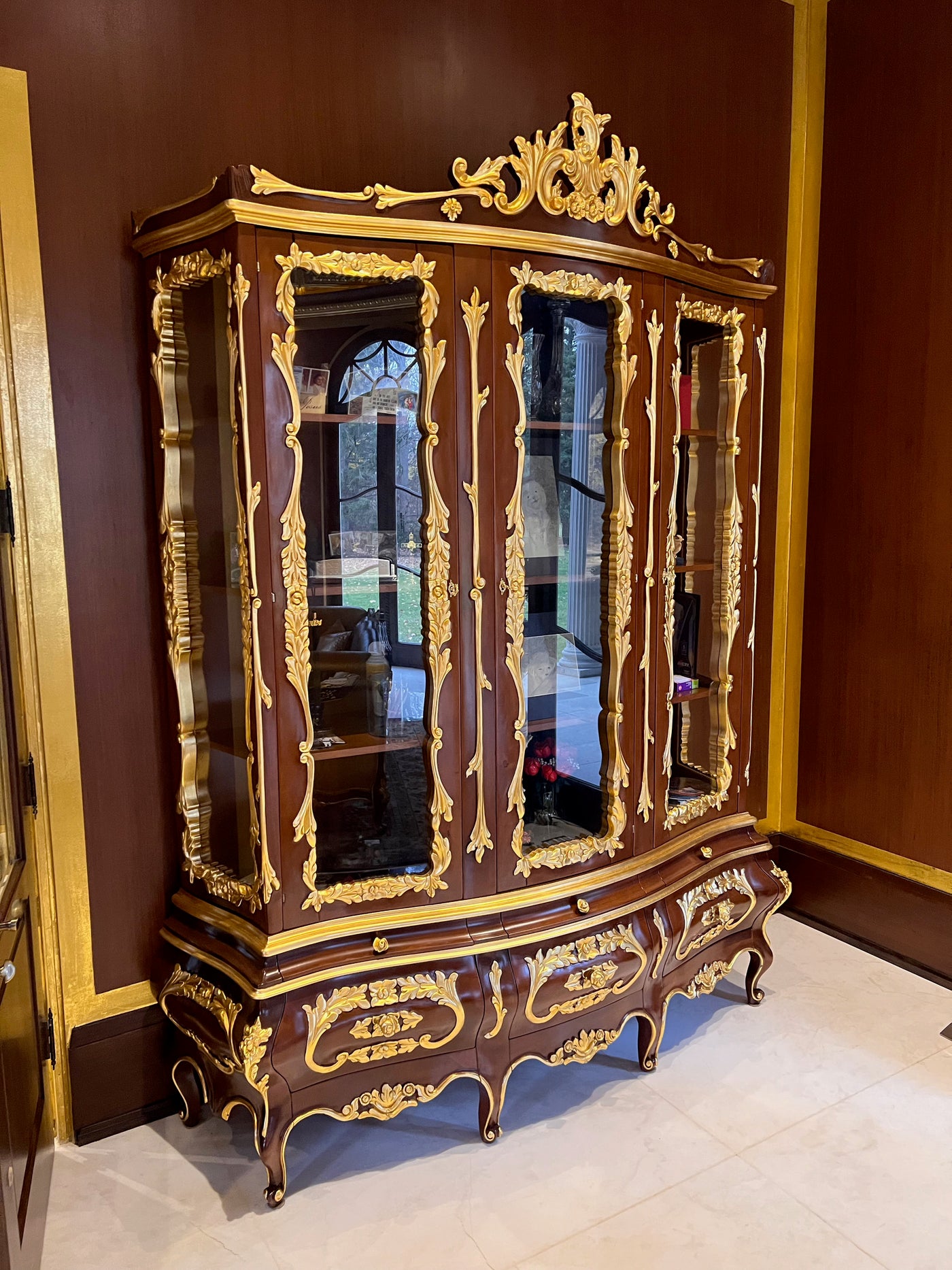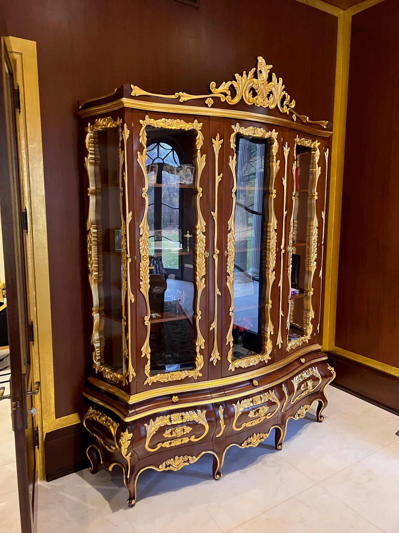 'Modenese Gastone Luxury Interiors' Baroque Display Cabinet, Walnut Finish with Gold Leaf Details, Made in Italy.