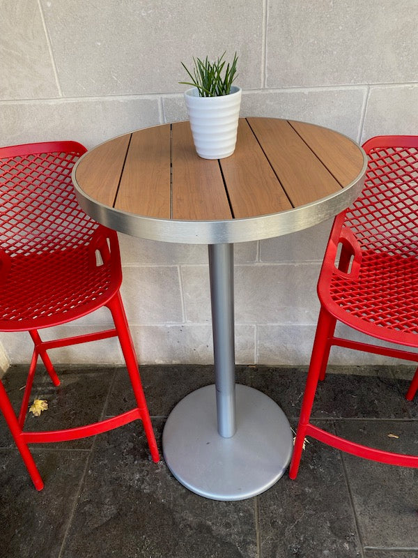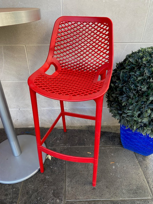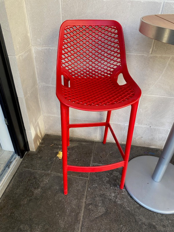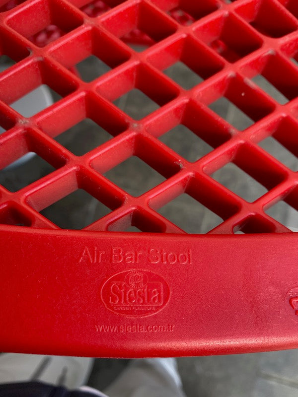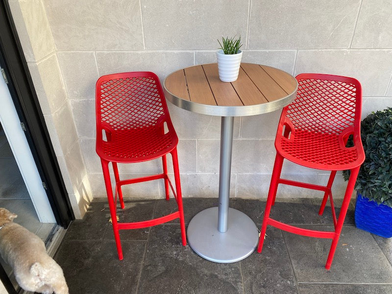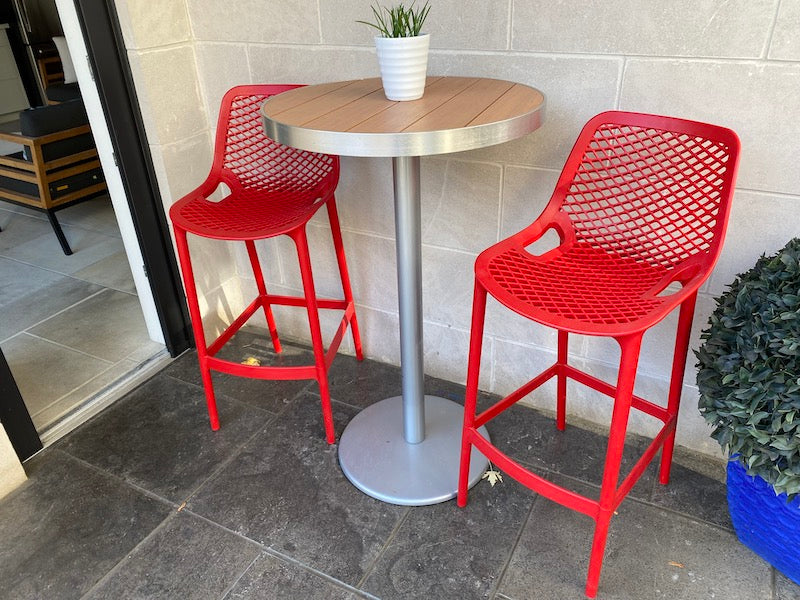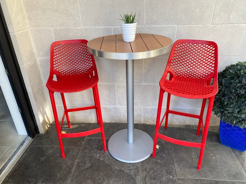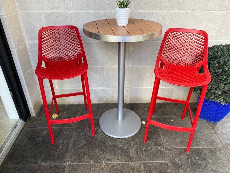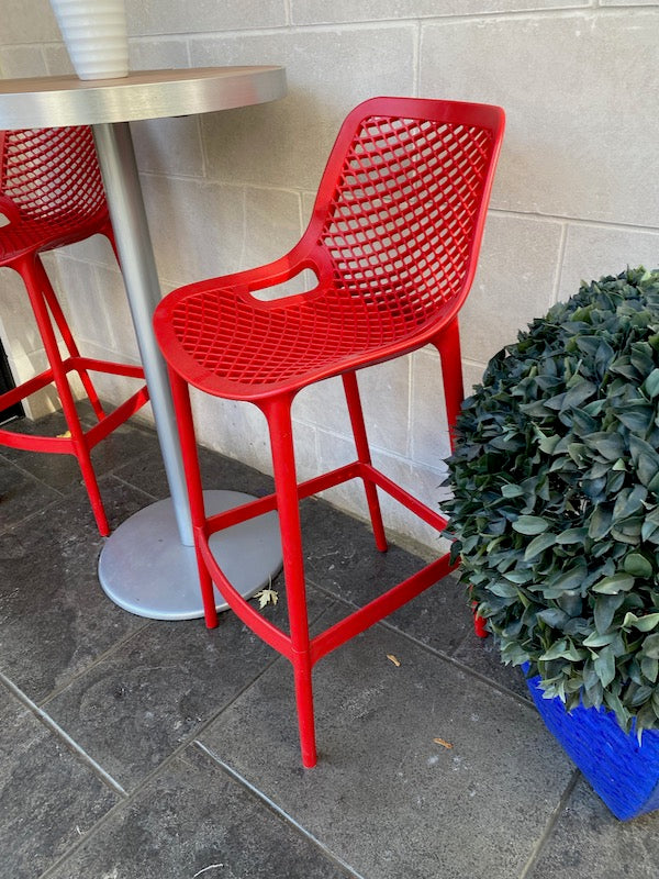 2 Red Siesta Air Bar Stools + Round Cruiser Table.