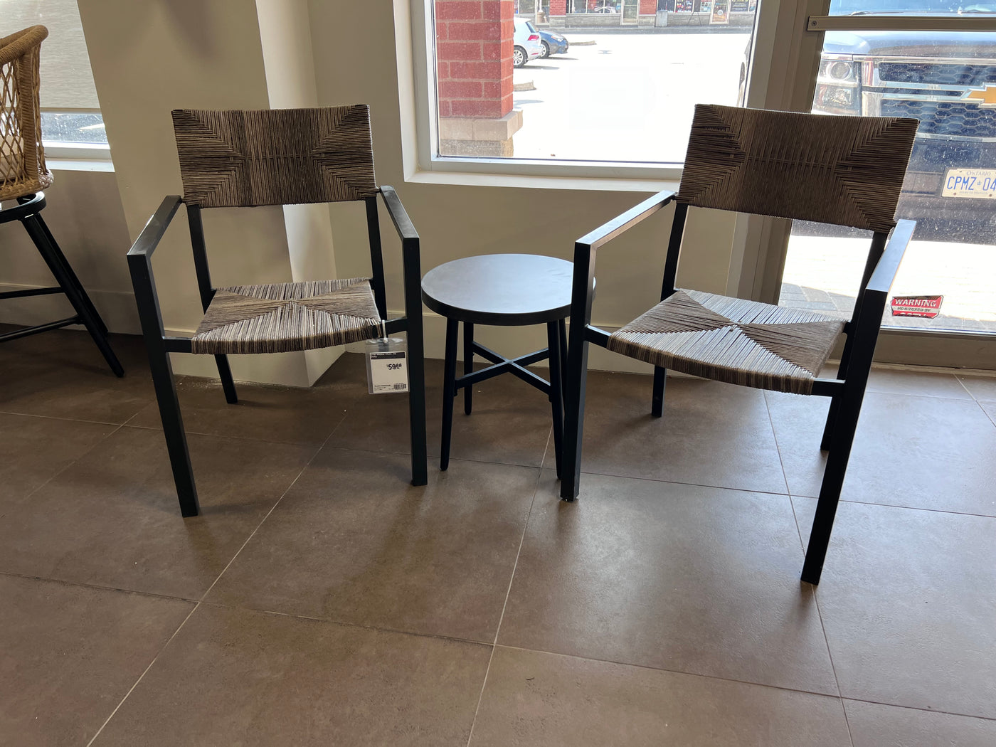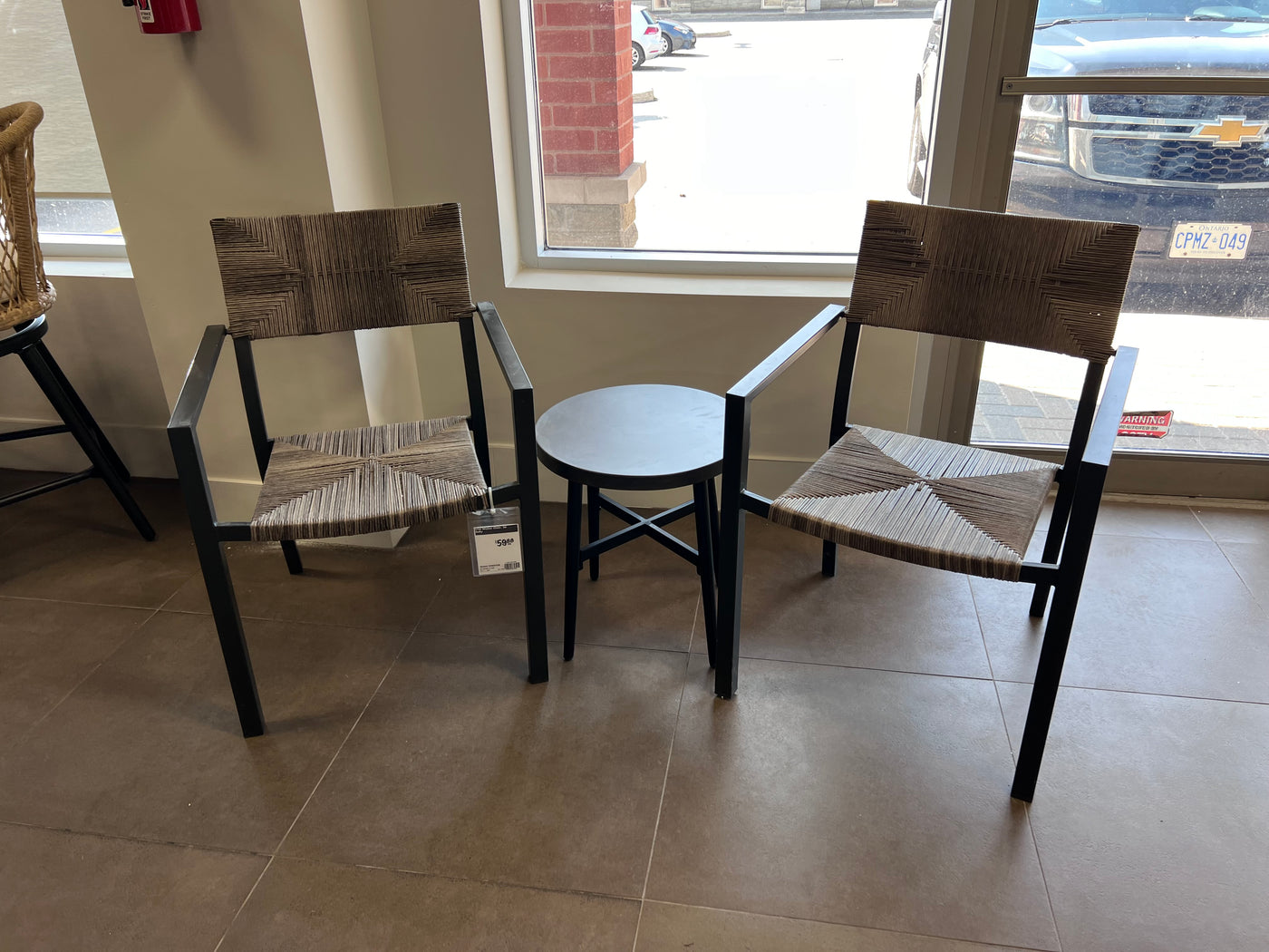 3 pc Set- 2 Wicker Chairs + Black Steel Side Table.