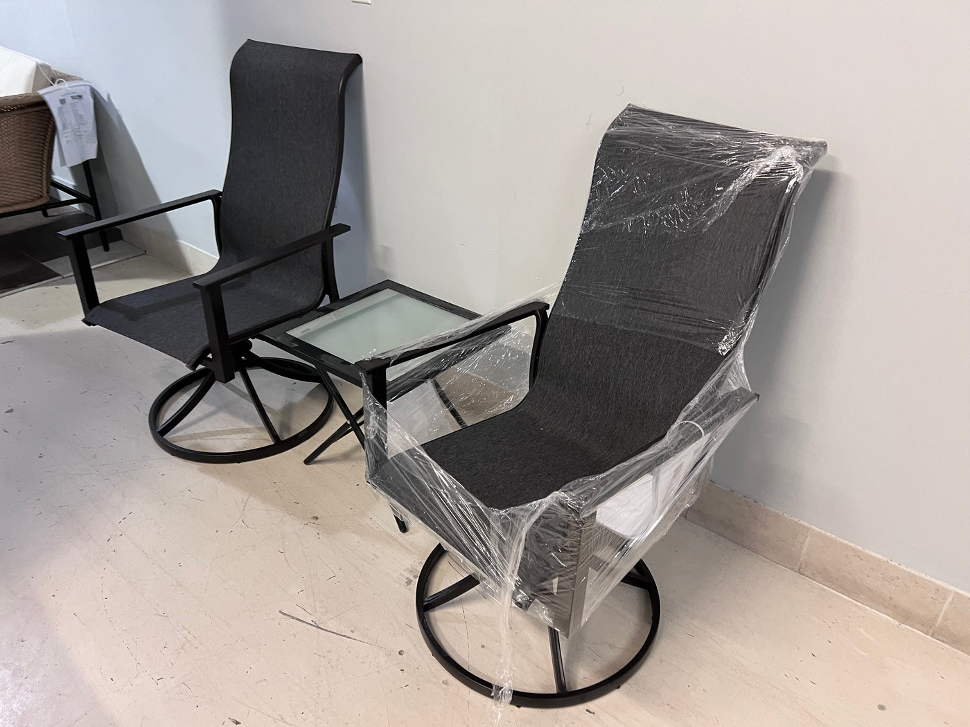 2 Black Sling Swivel Chairs + Folding Side Table.