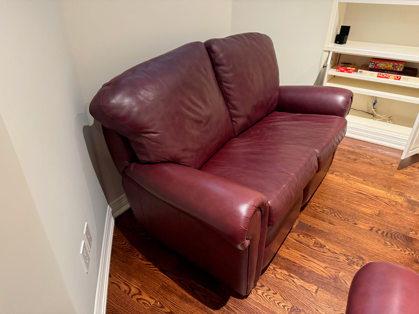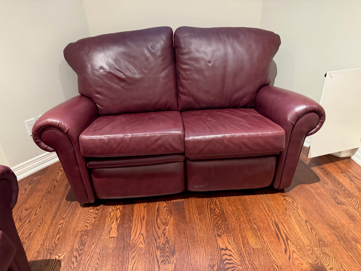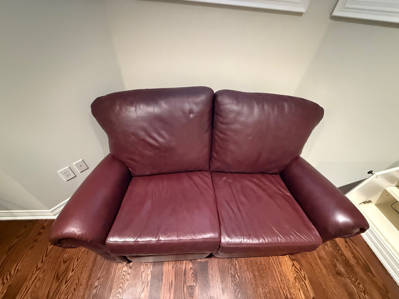 Red Leather Love Seat. Creases and indents in the cushions consistent with age and use. No stain or rips.