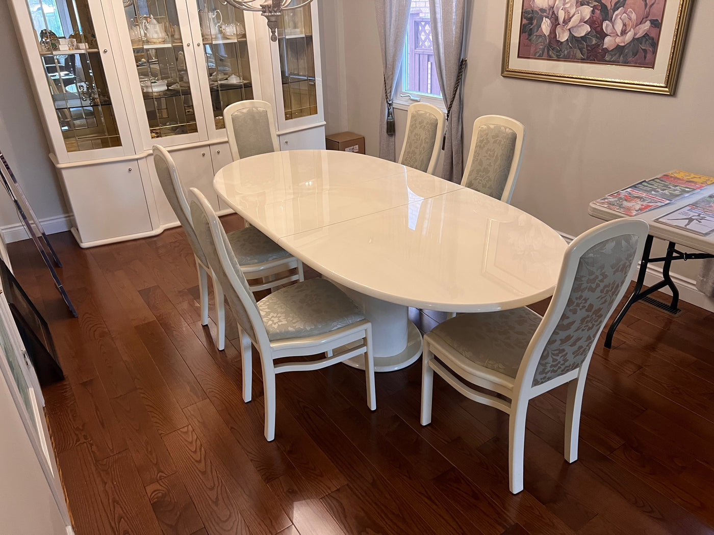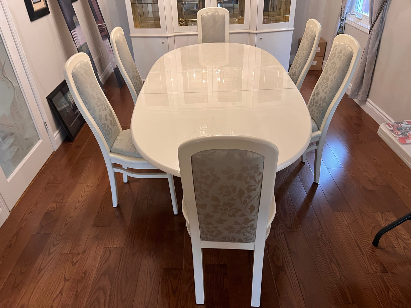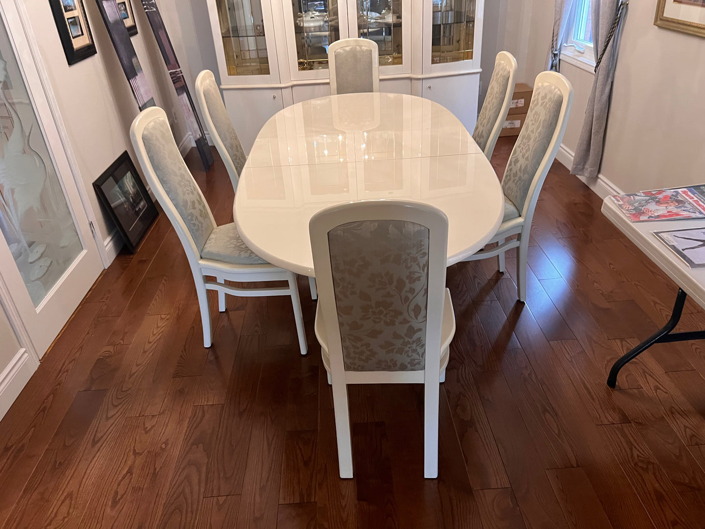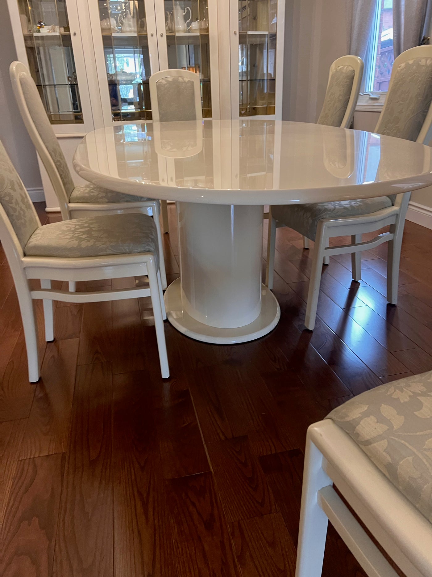 Vintage Italian White Lacquered Dining Table + 6 Chairs with Matching Hutch/Display Cabinet