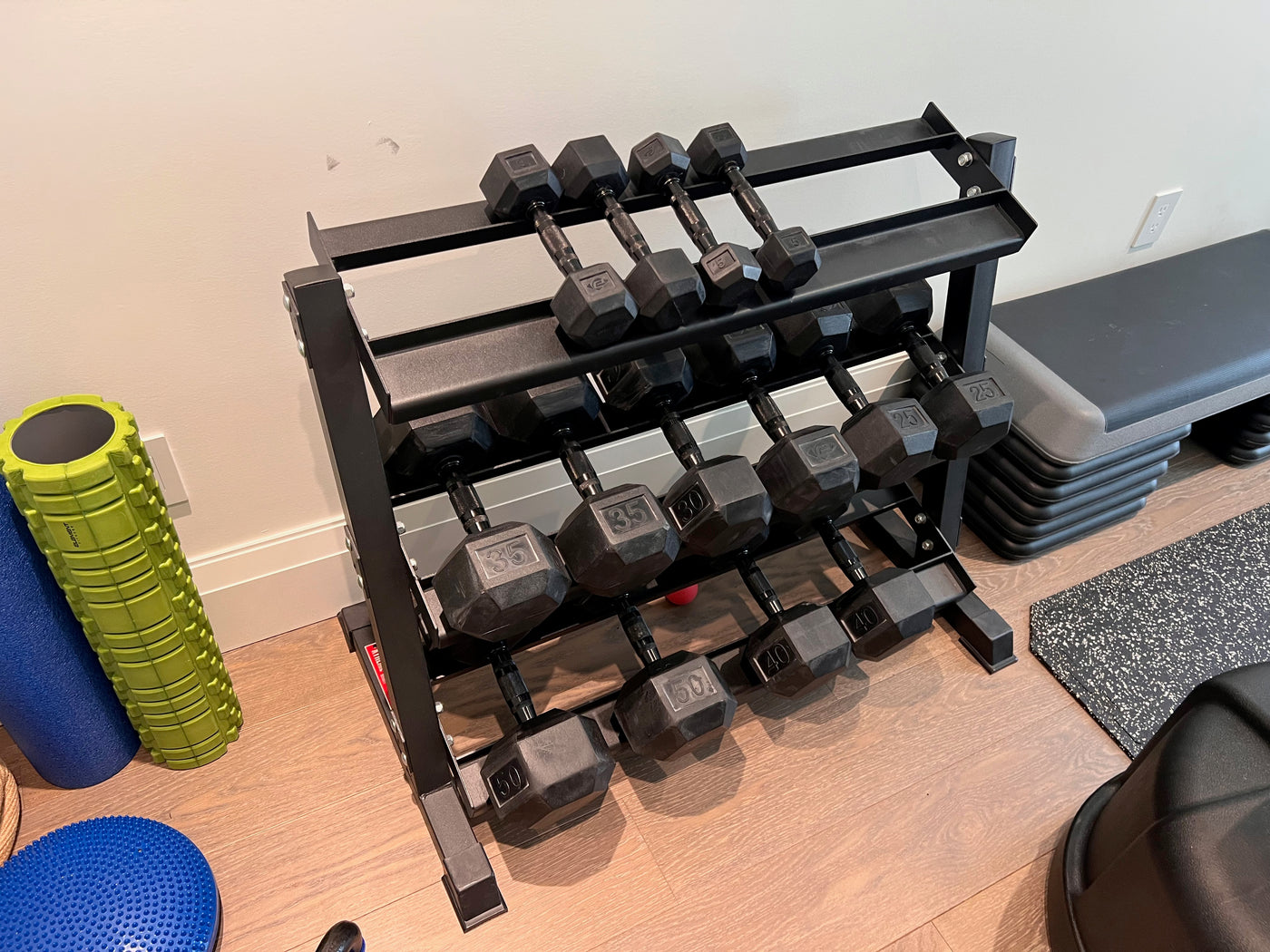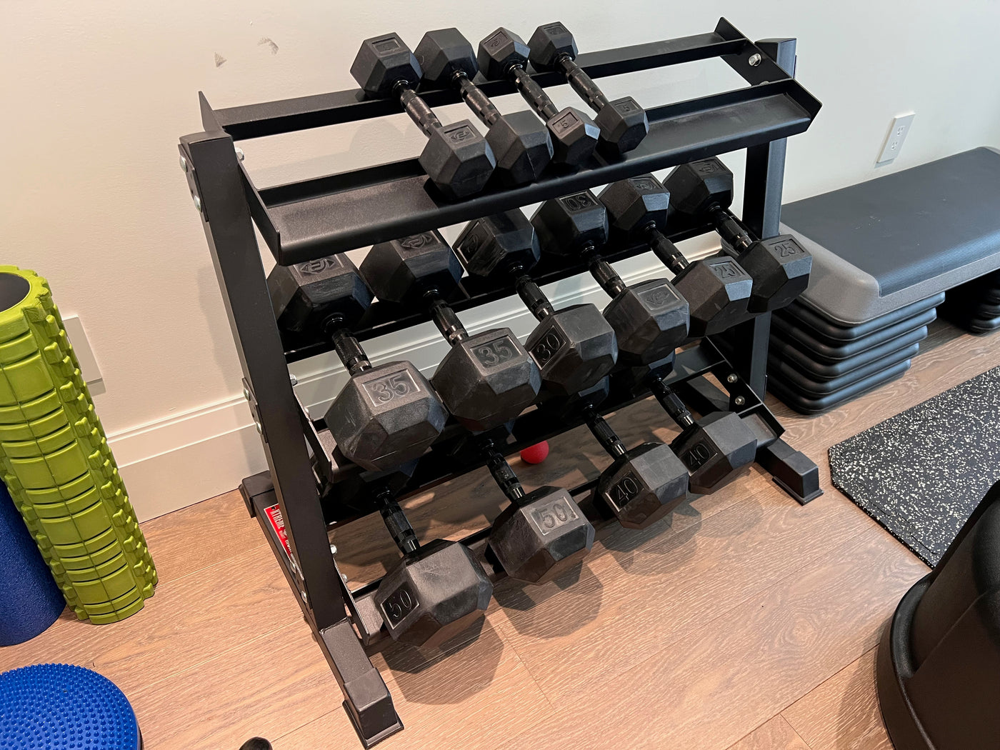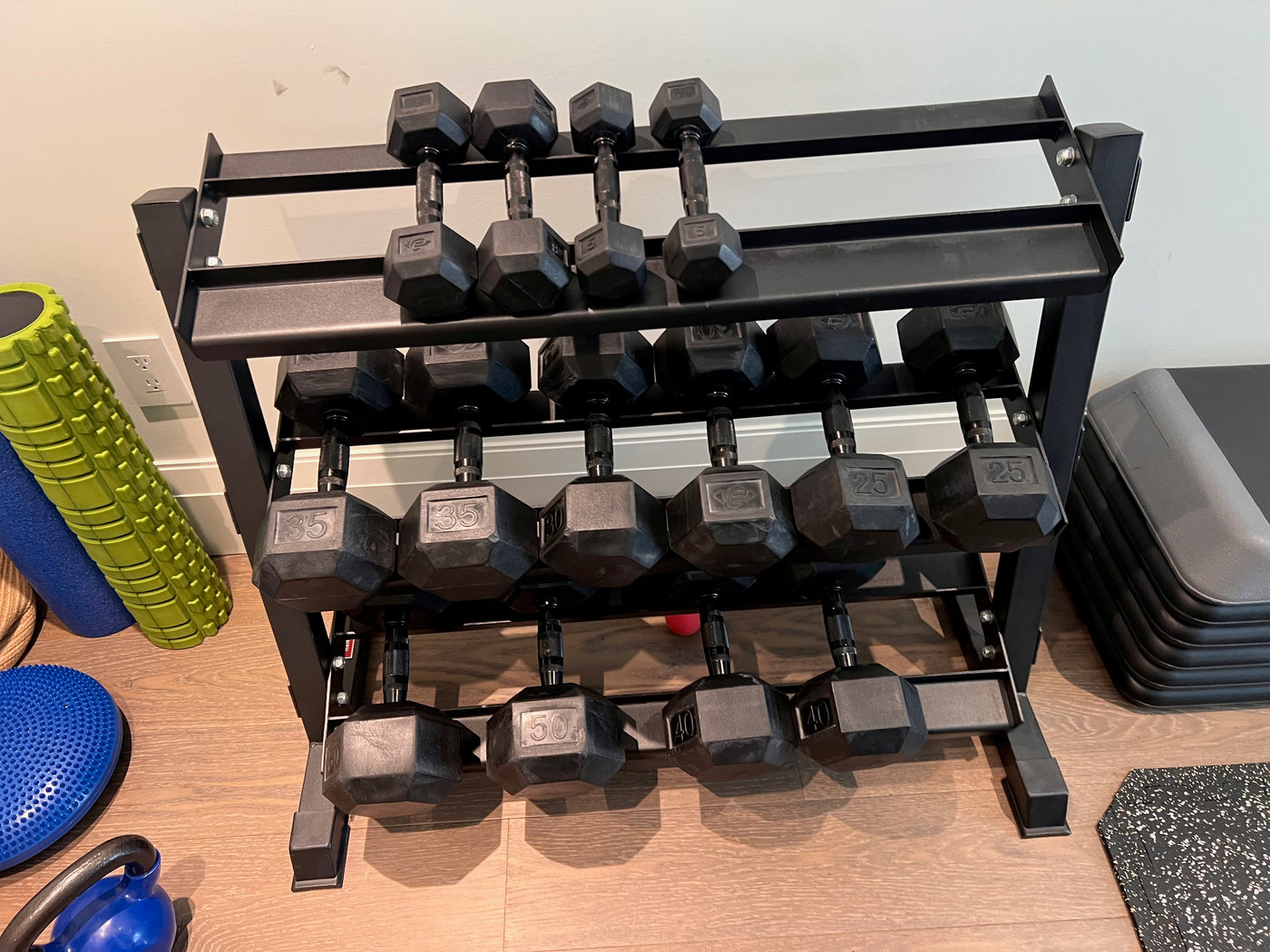 This lot includes:Xtreme Monkey dumbbell rack2 x 5lb2 x 8lb2 x 25lb2 x 30lb2 x 35lb2 x 40lb2 x 50lb