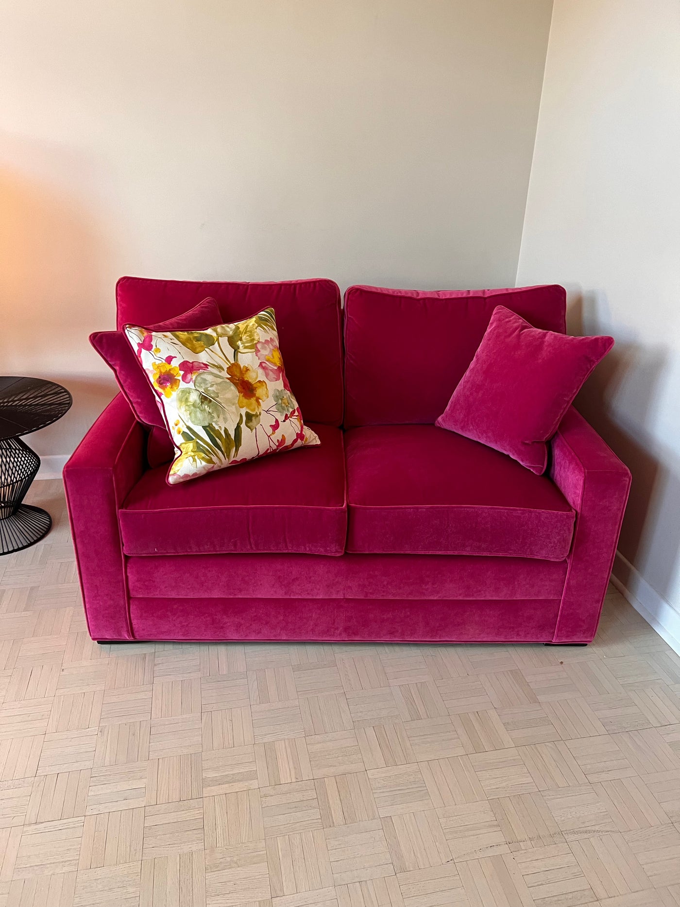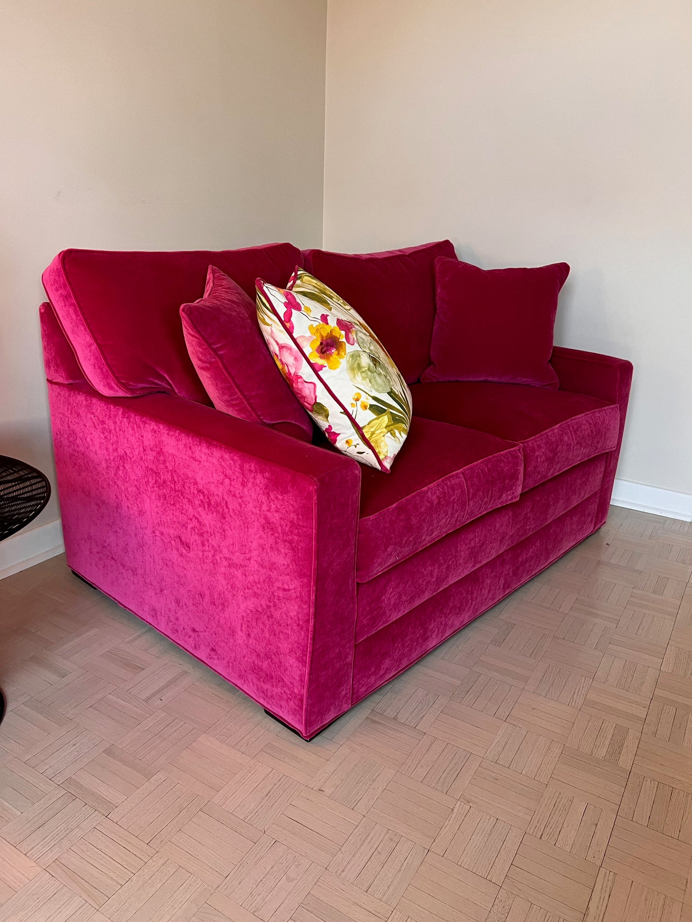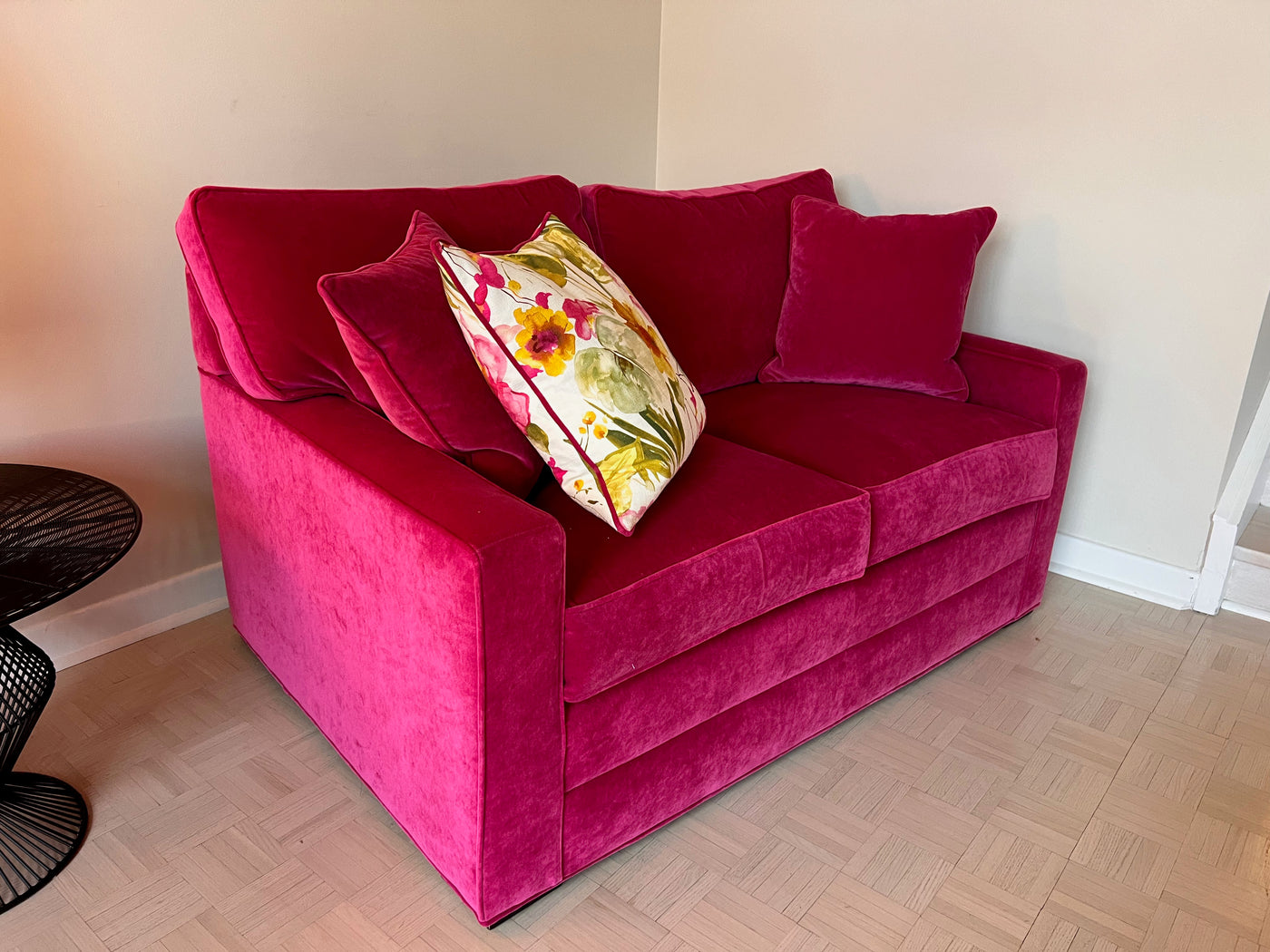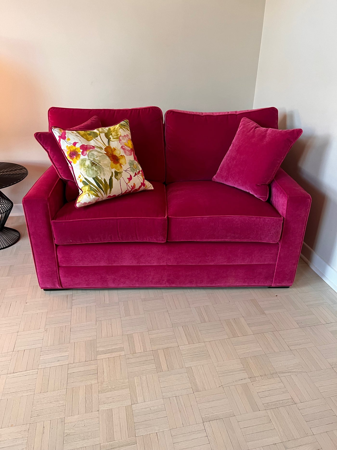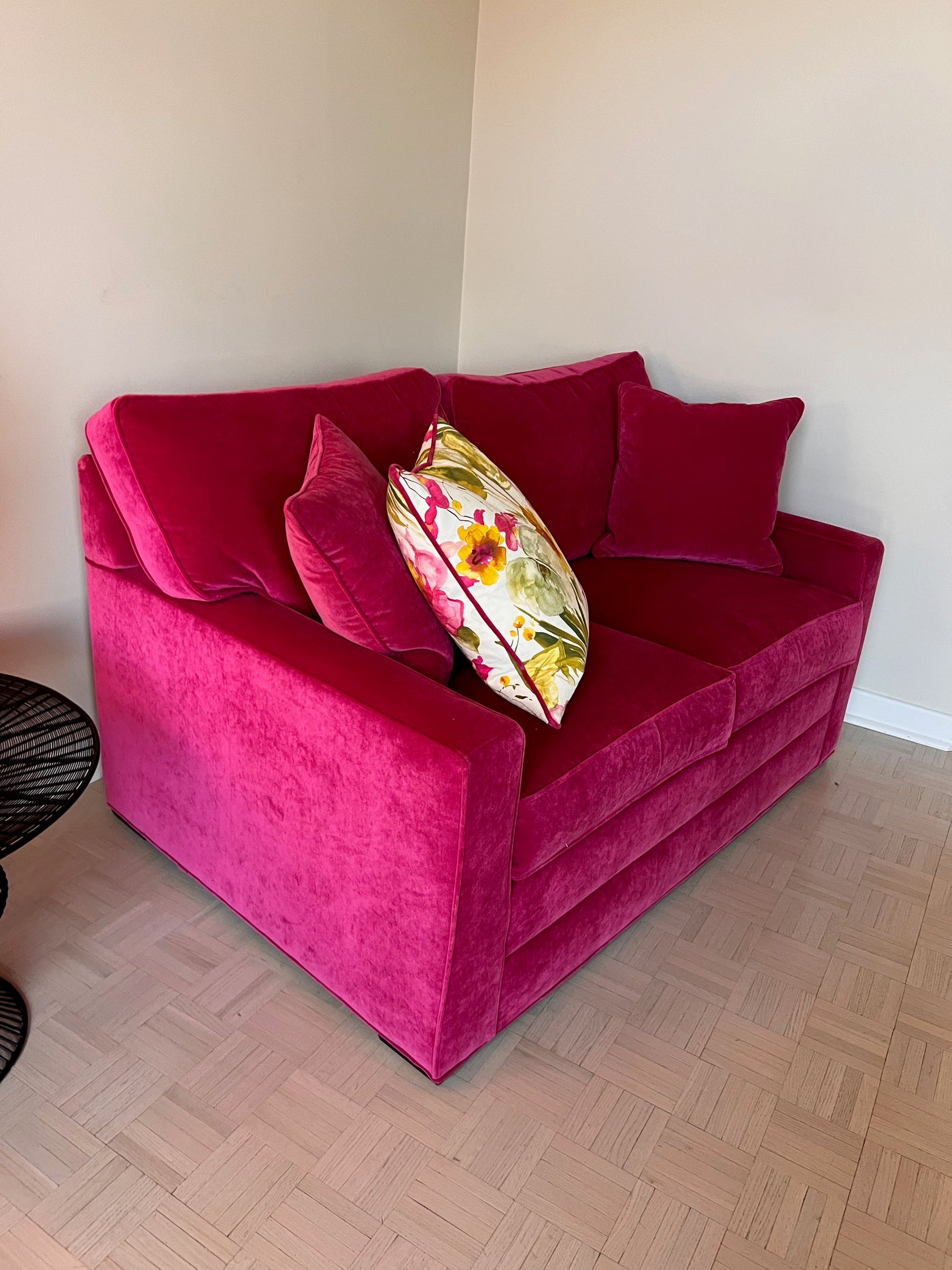 Ethan Allen Pink Love Seat. Fabric is velvet. All accent pillows shown are included.
