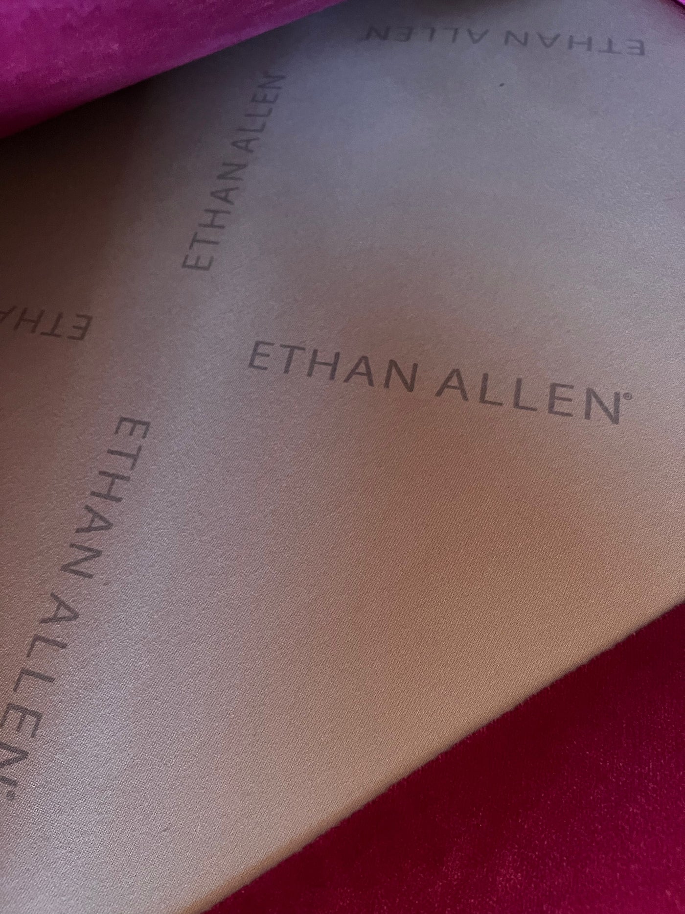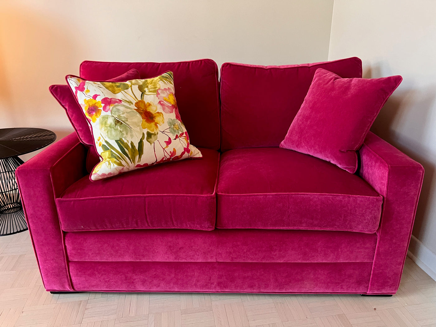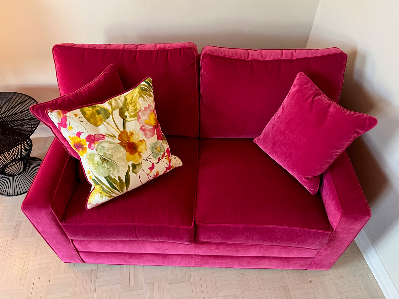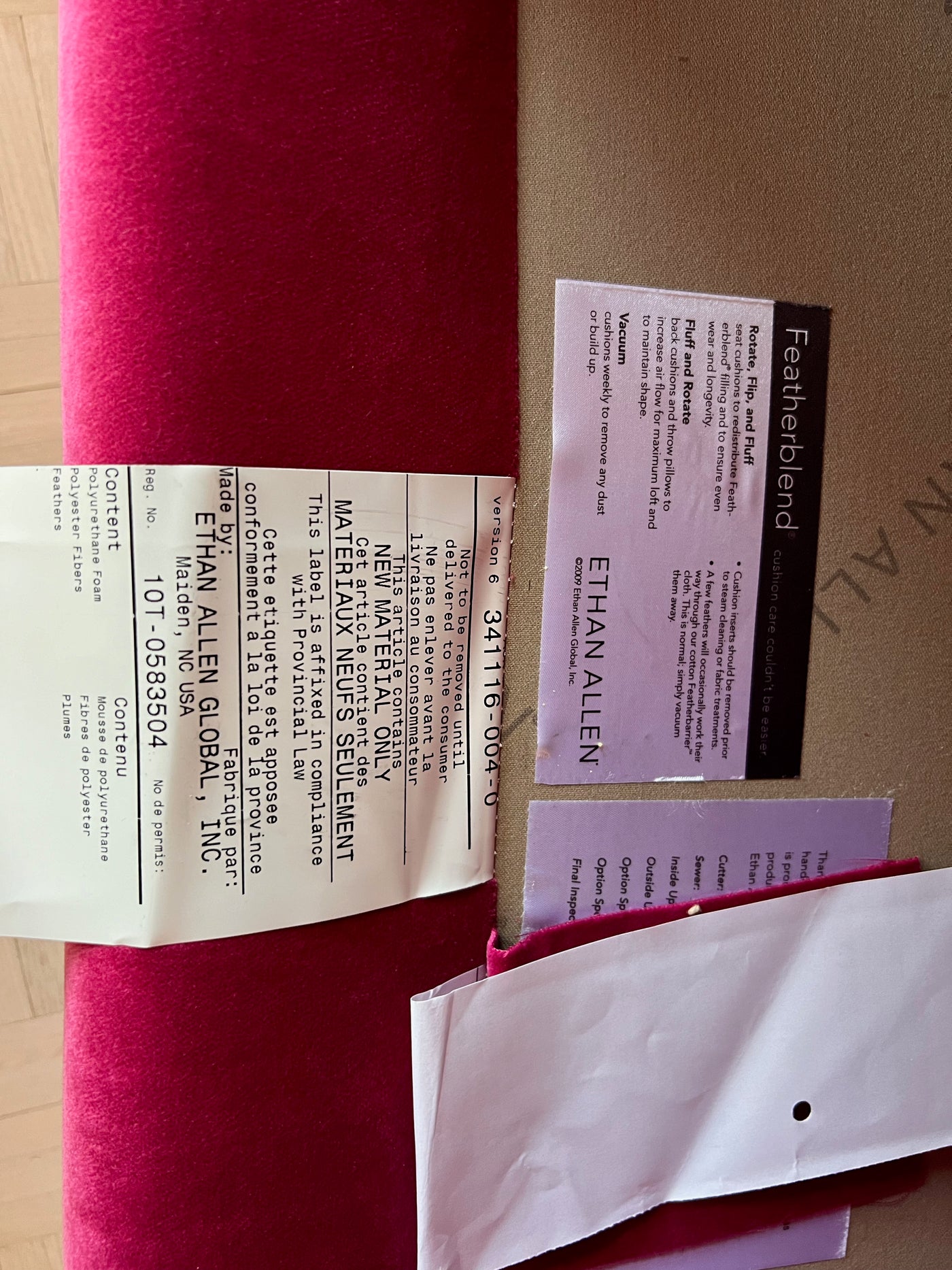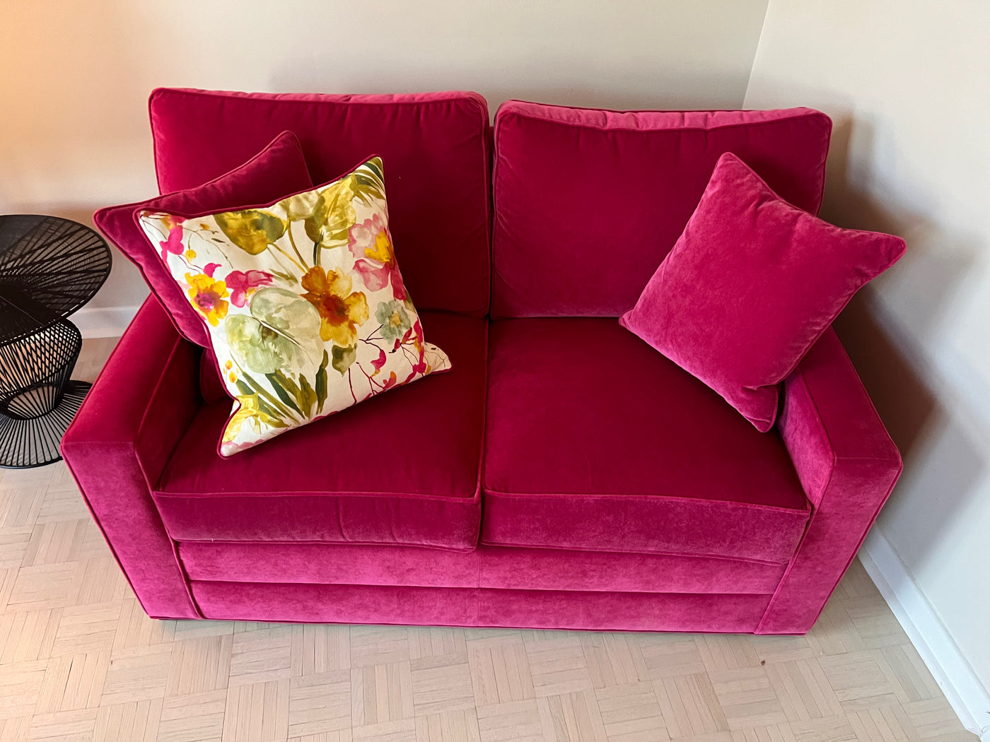 Ethan Allen Pink Love Seat. Fabric is velvet. All accent pillows shown are included.