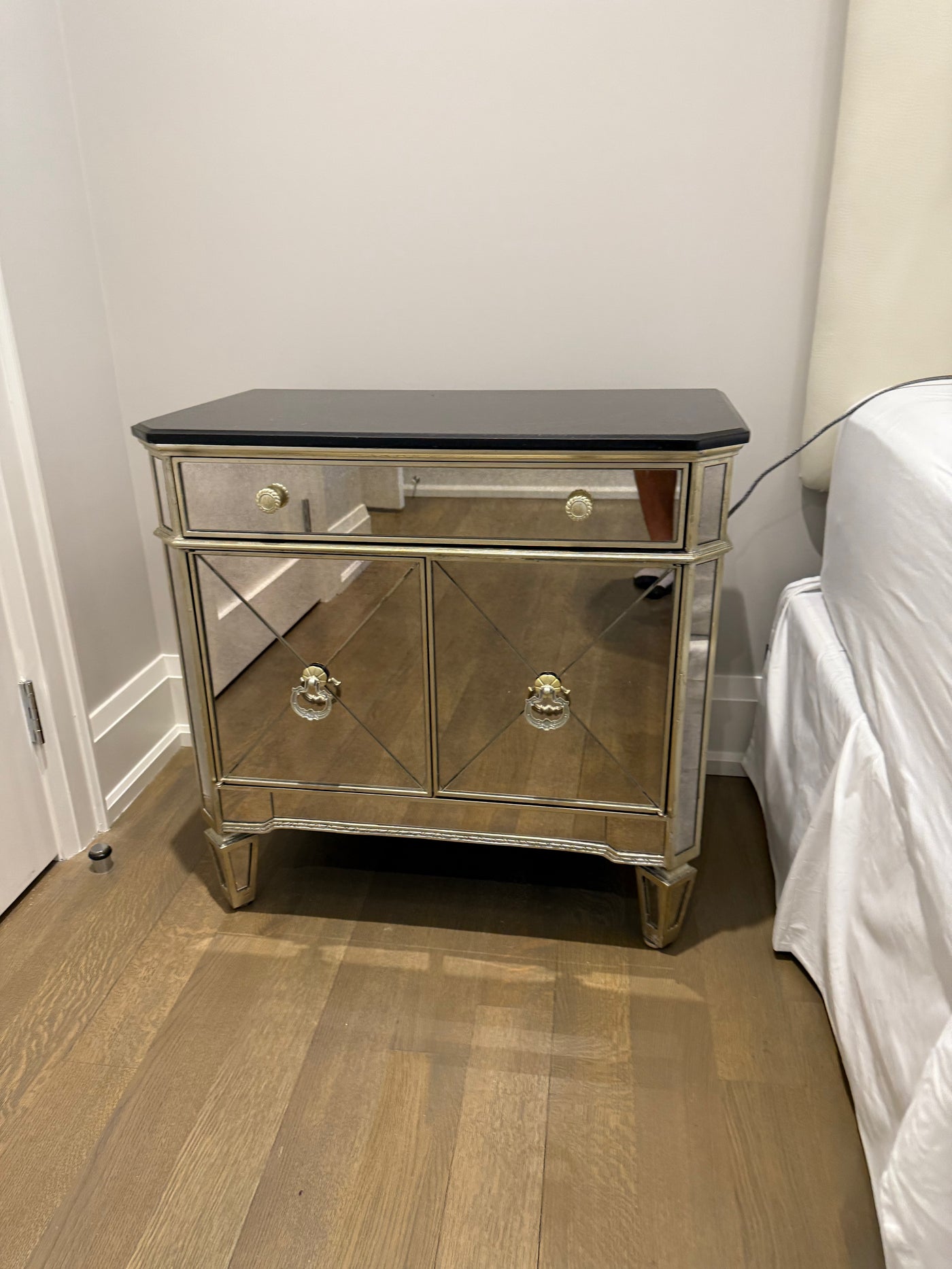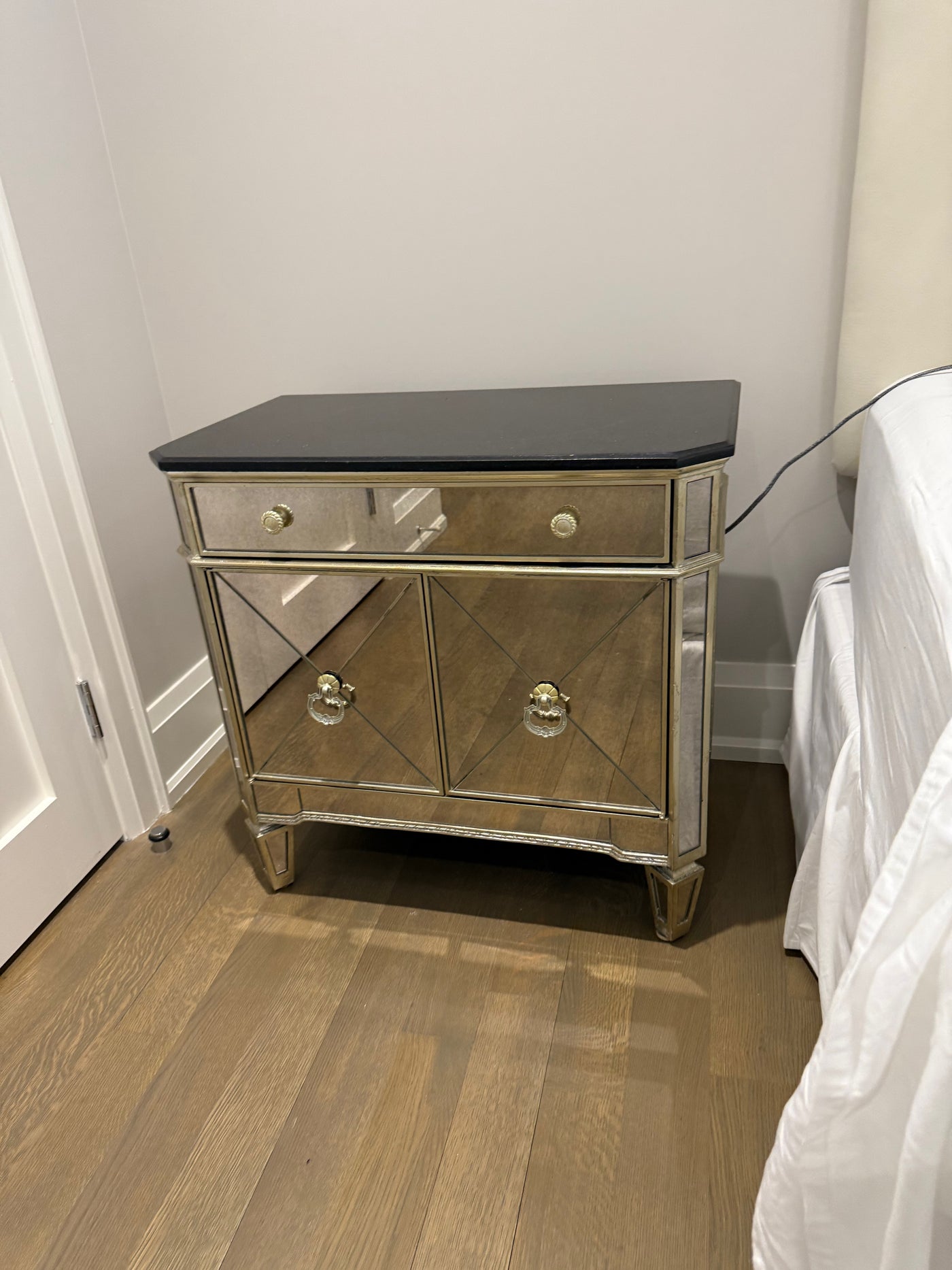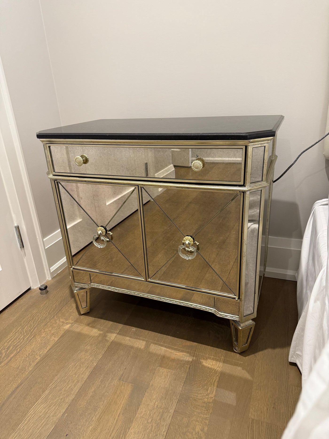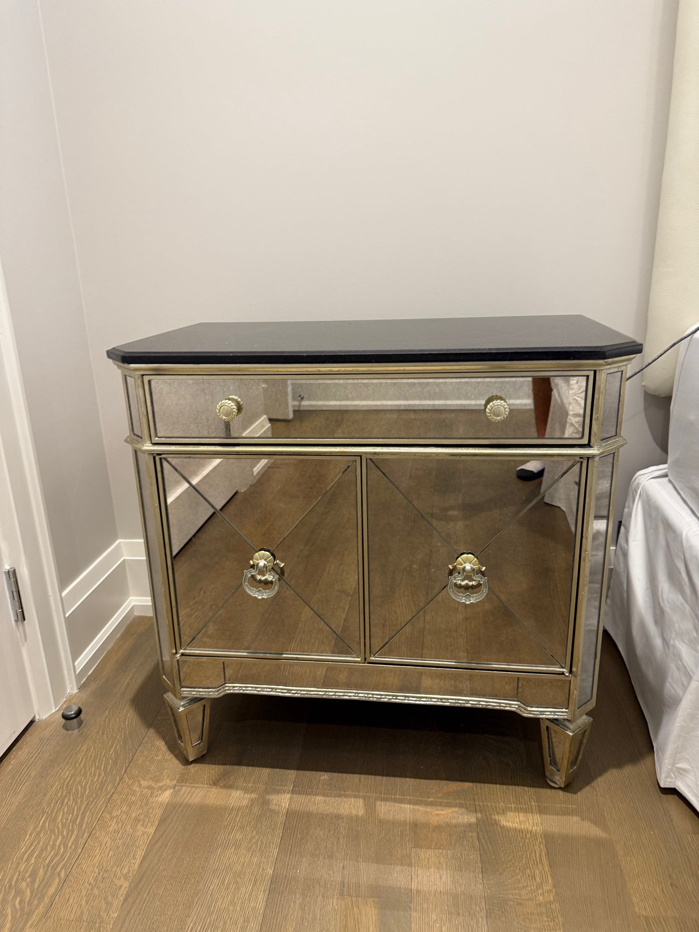 Pair of HomeSense Mirrored End Tables with Marble Tops (*retail $600/pair)