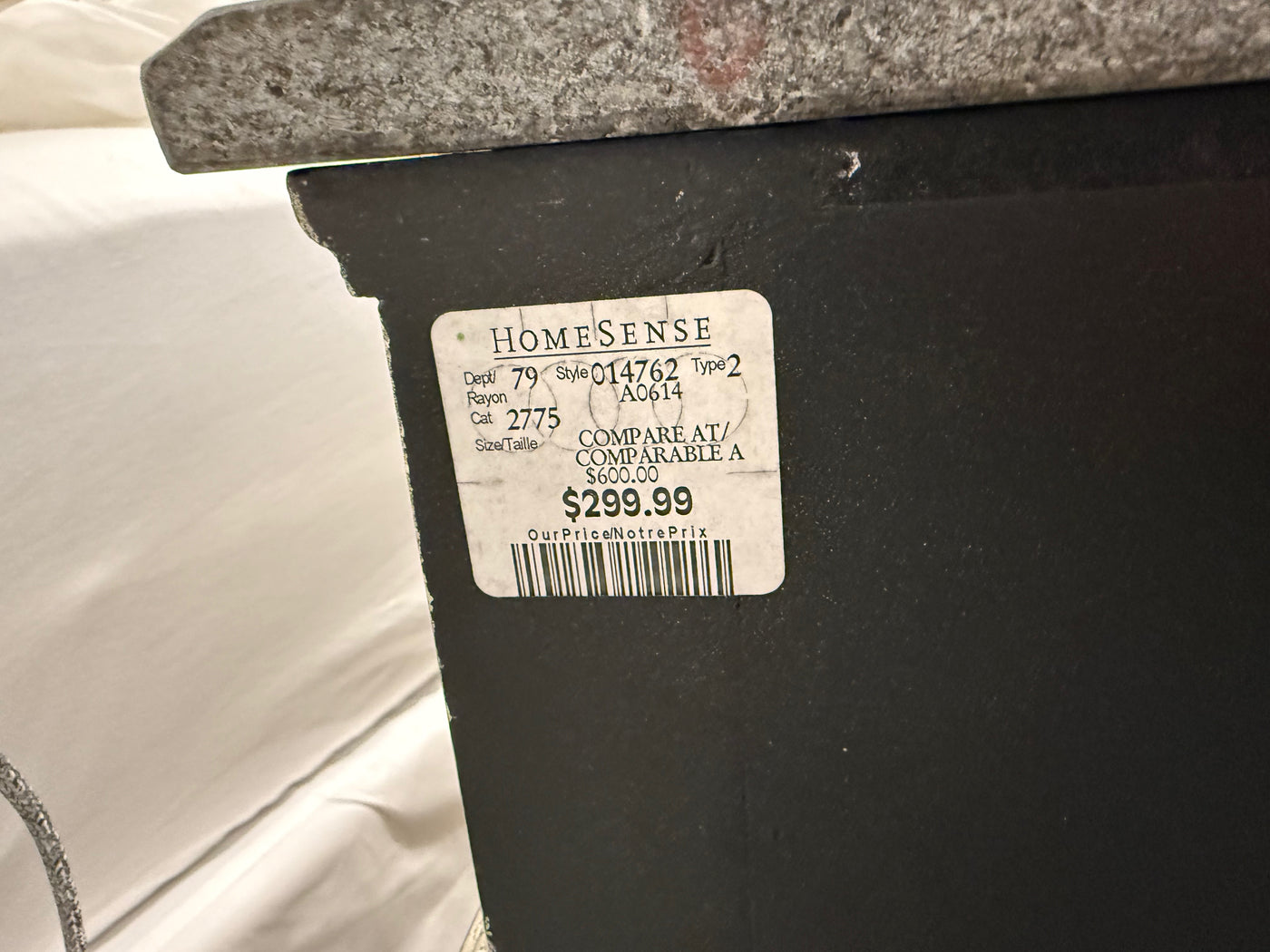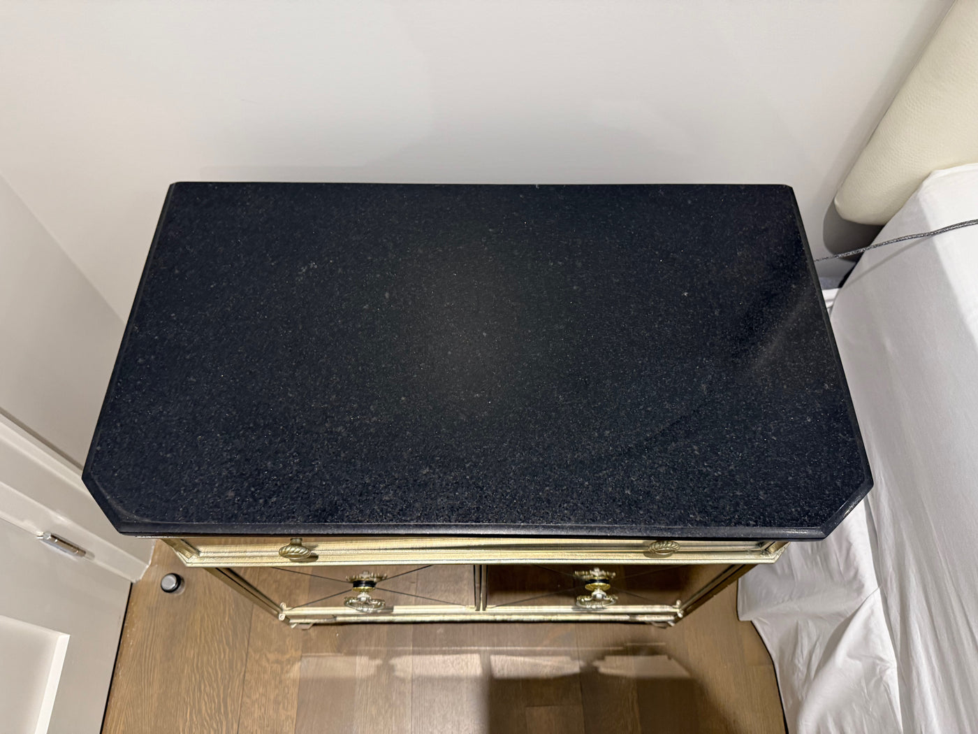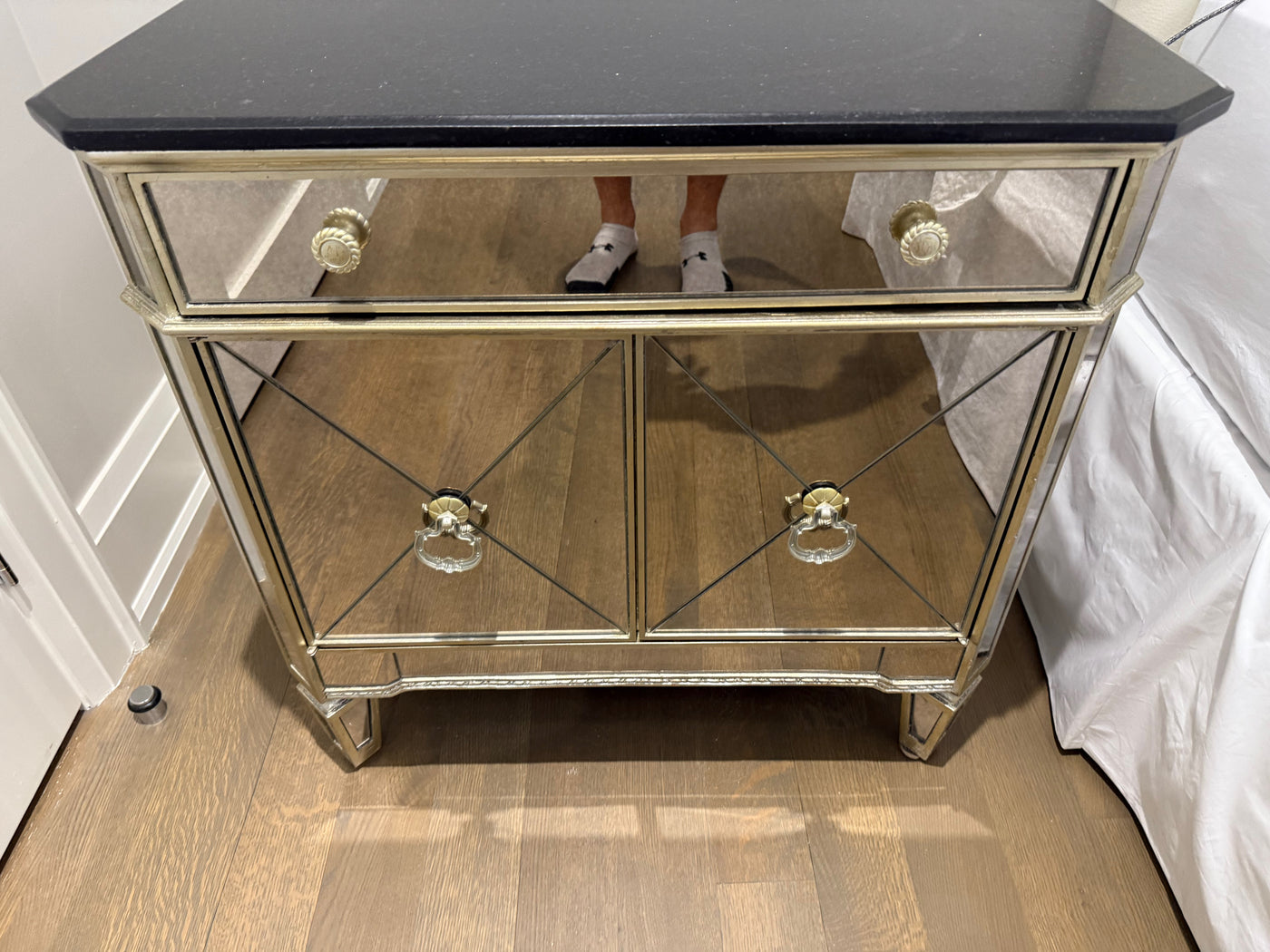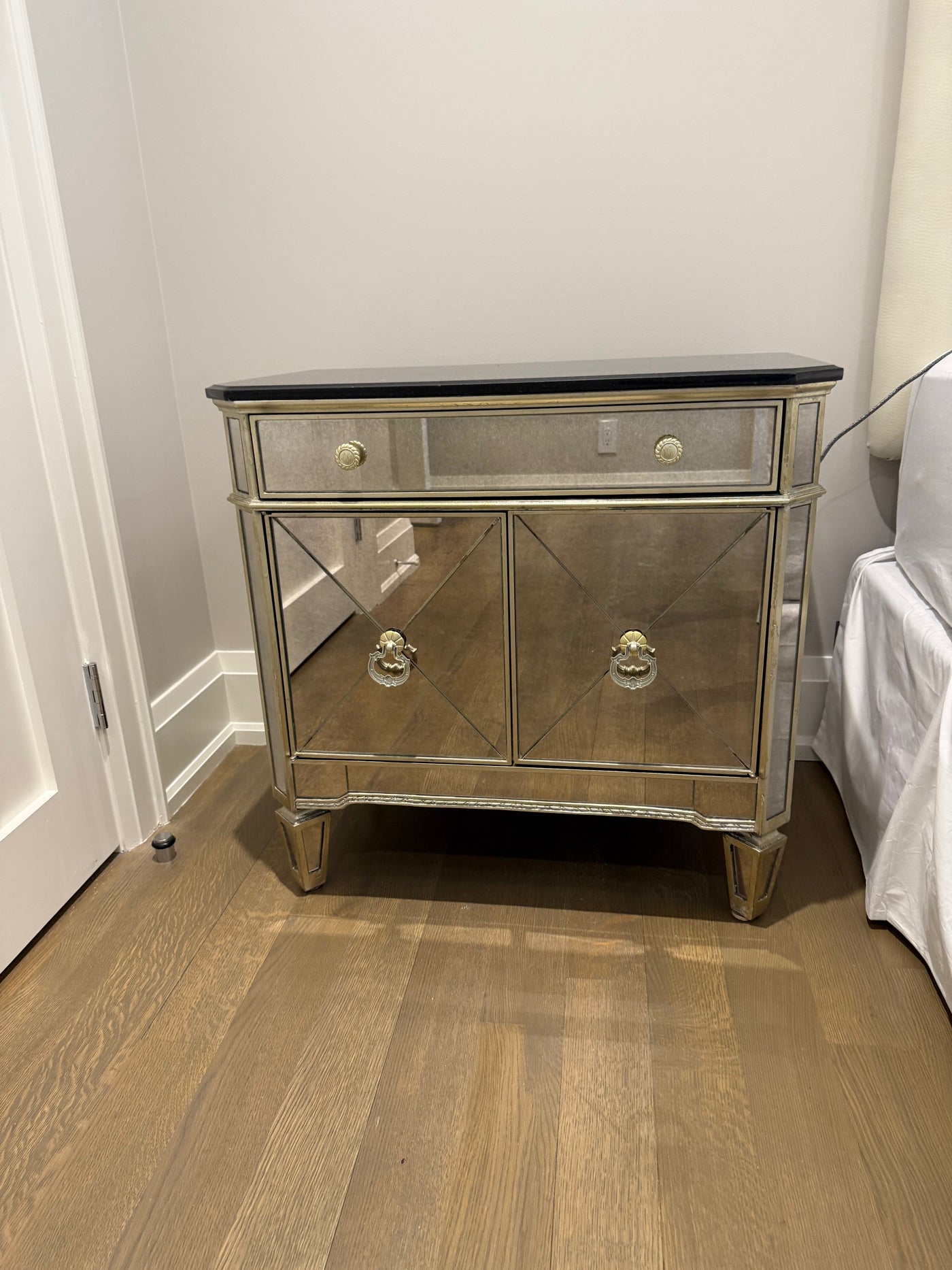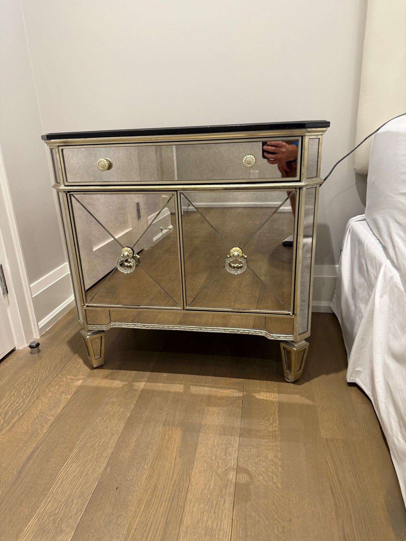 Pair of HomeSense Mirrored End Tables with Marble Tops (*retail $600/pair)