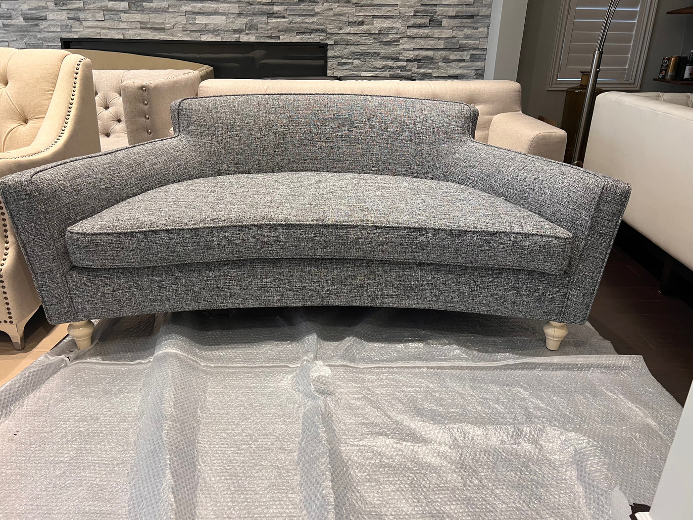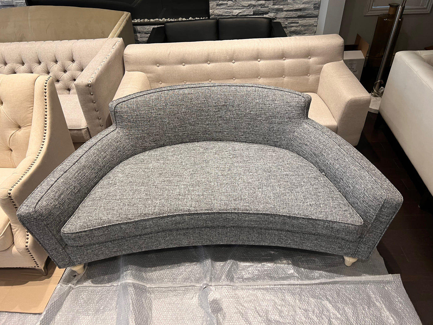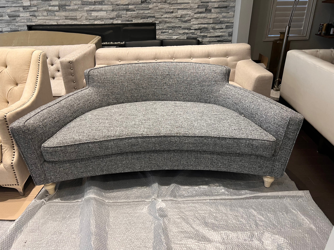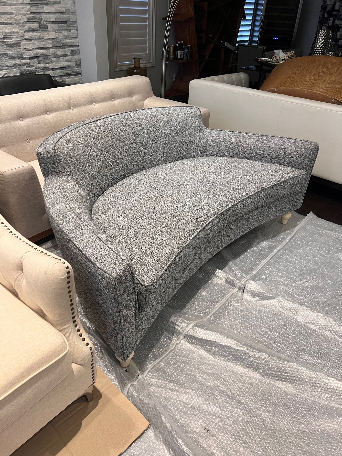 Grey Upholstered Curved Sofa/Bench.