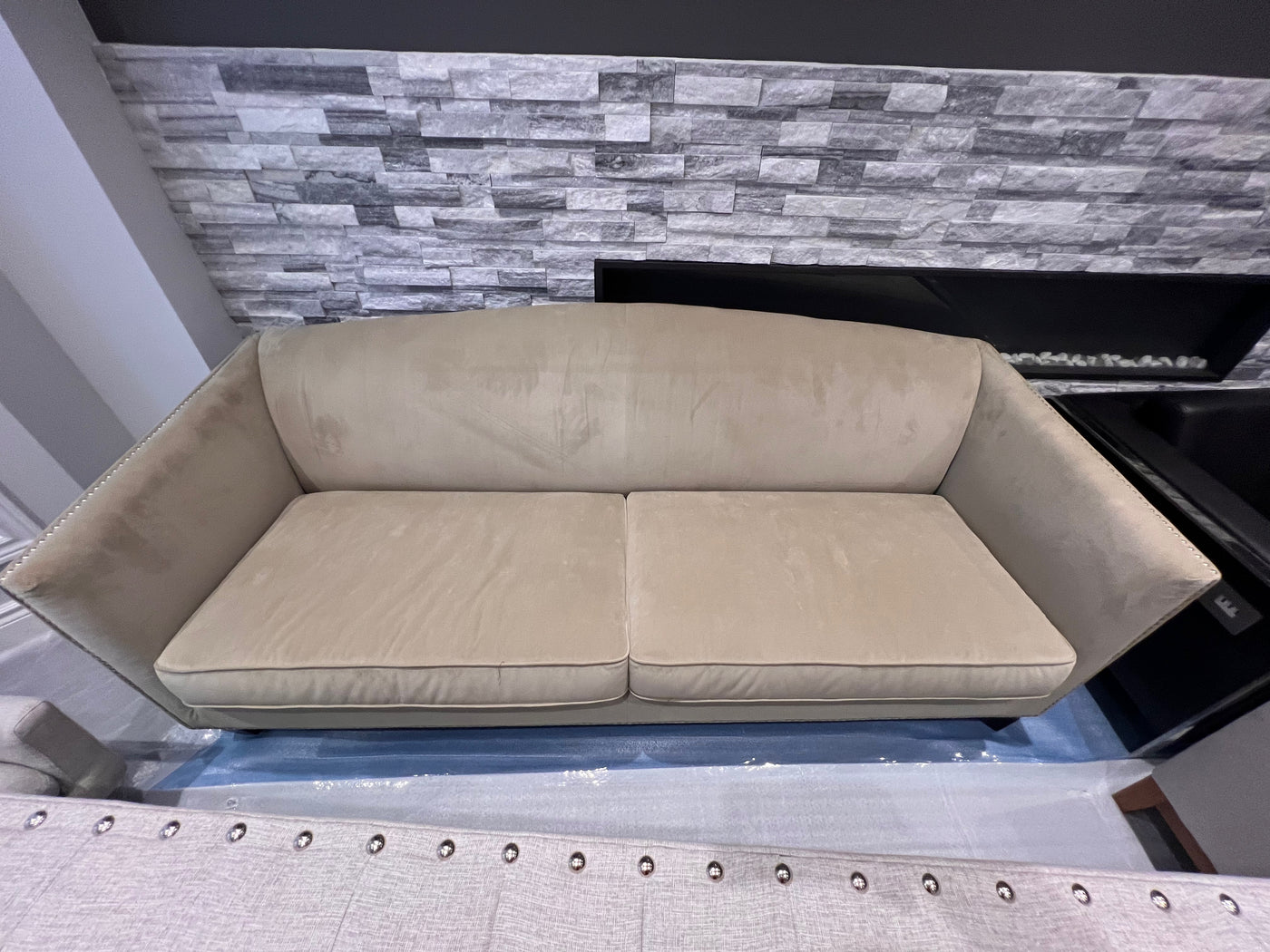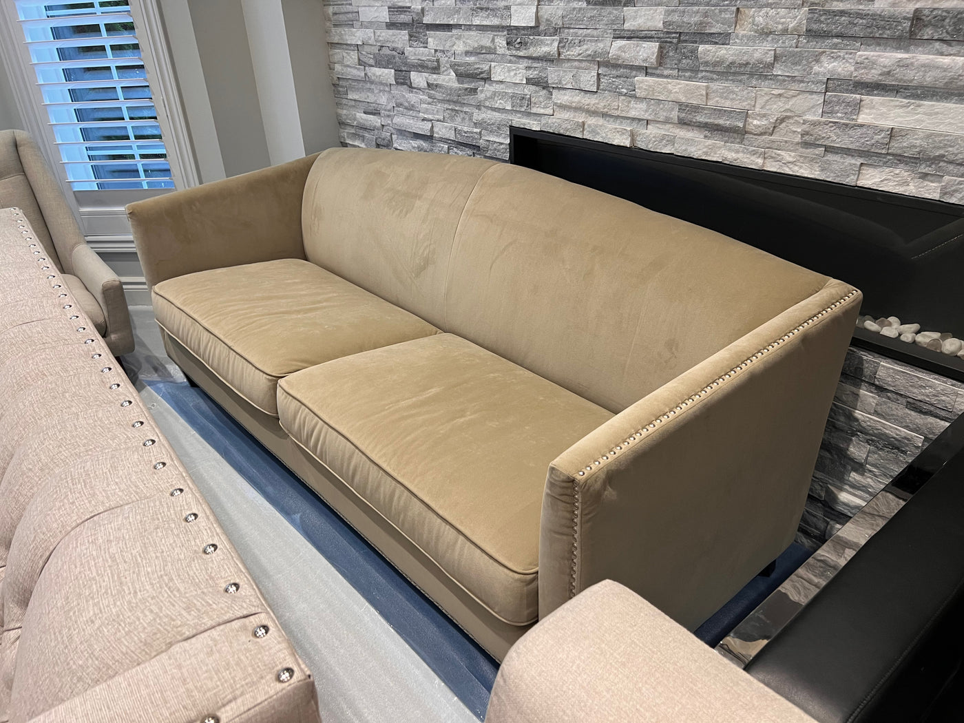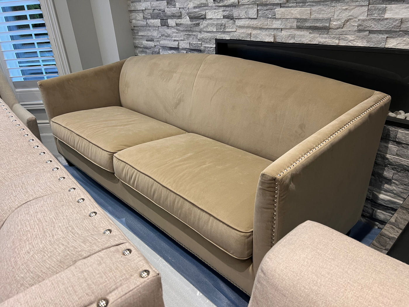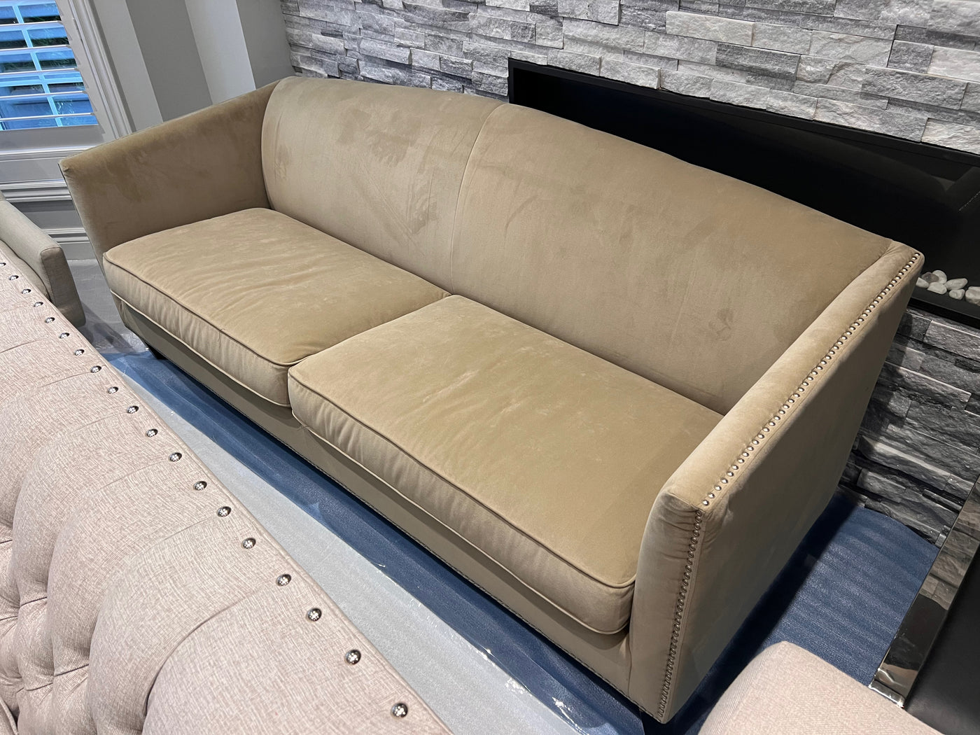 Sunpan Beige Microsuede Sofa with Nailhead Trim (*retail $2,500)