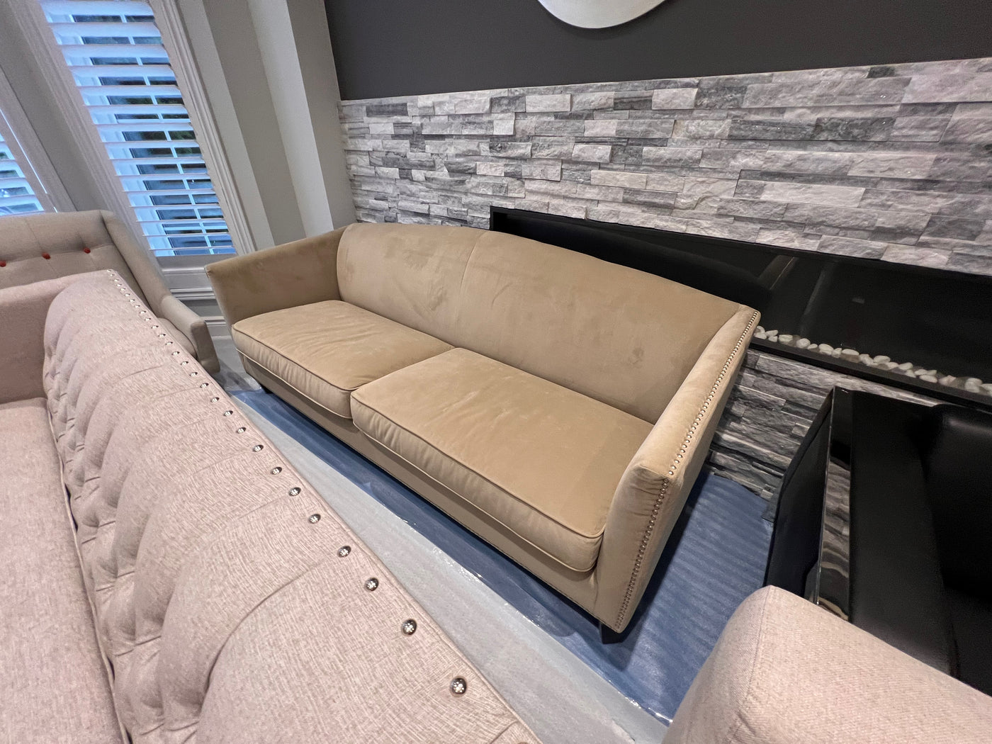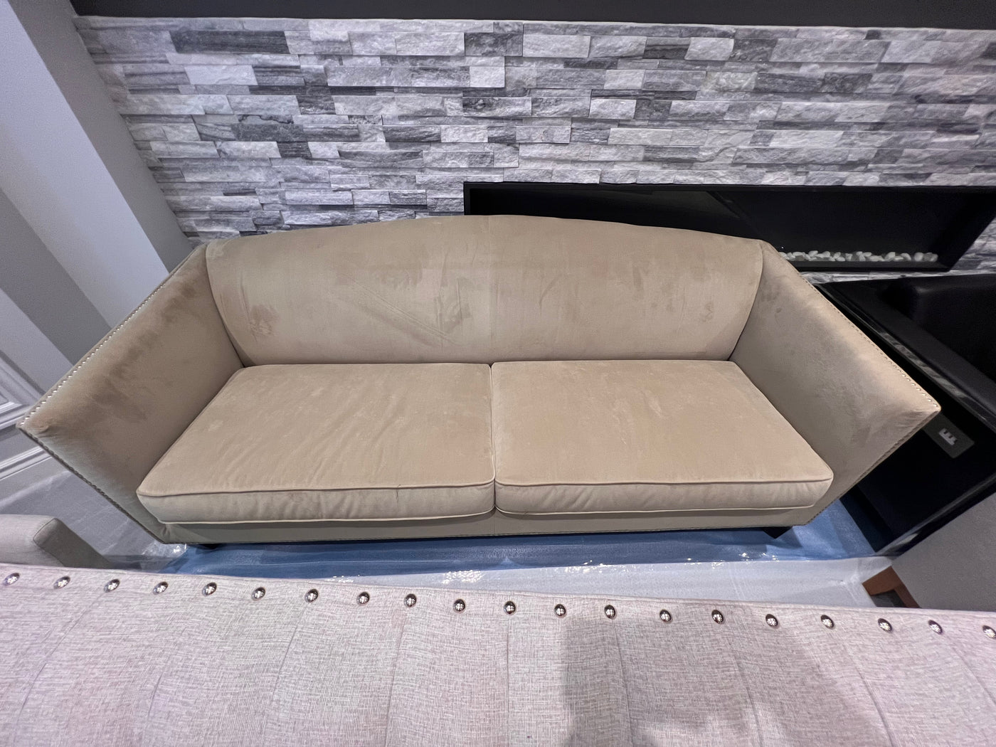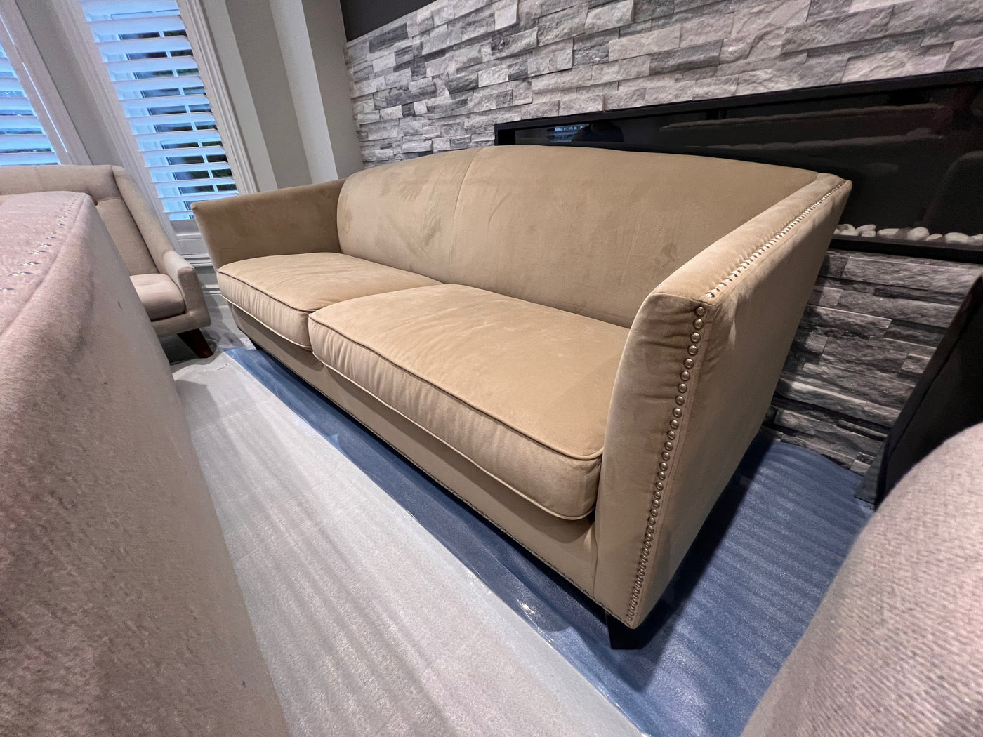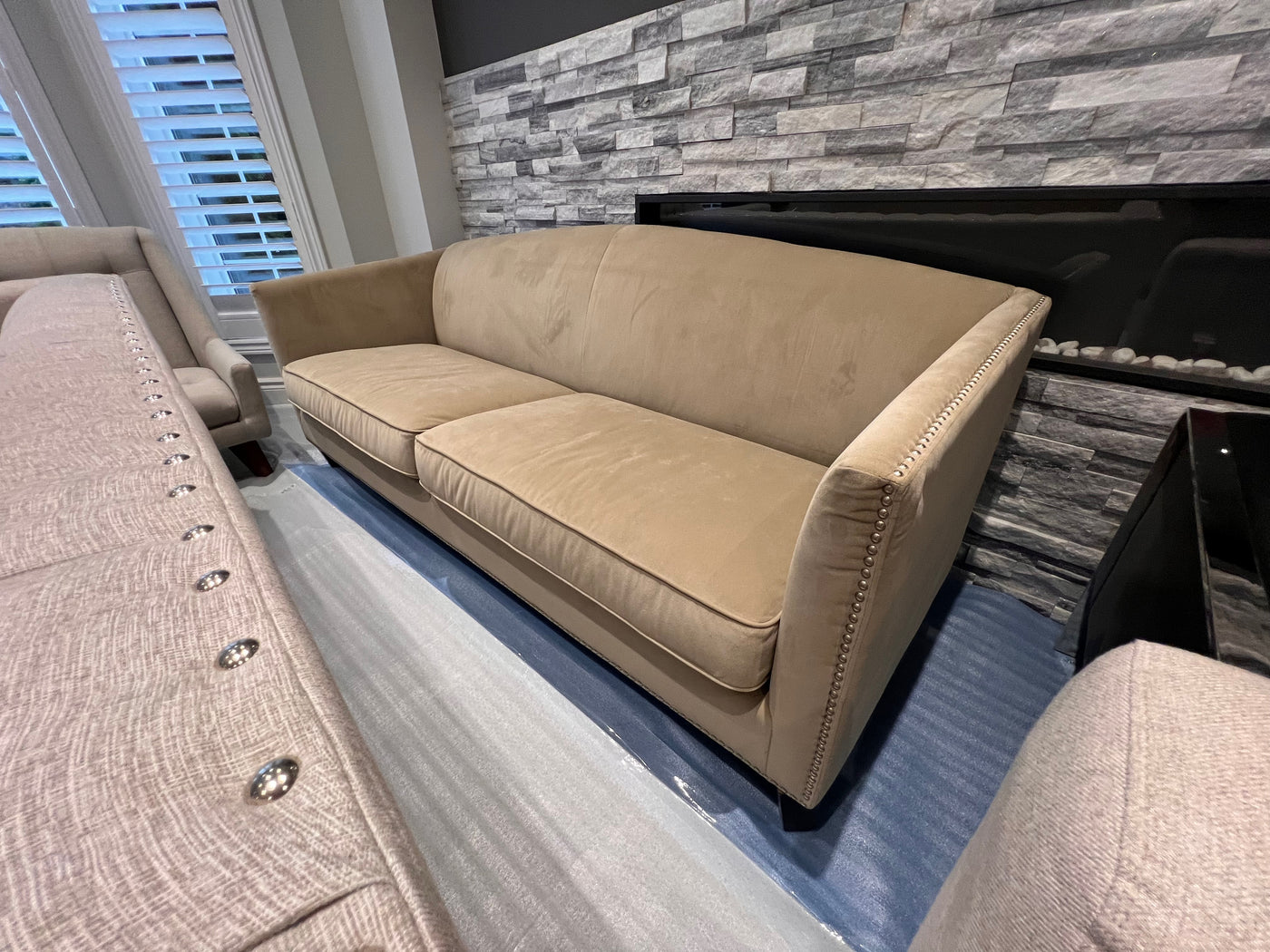 Sunpan Beige Microsuede Sofa with Nailhead Trim (*retail $2,500)