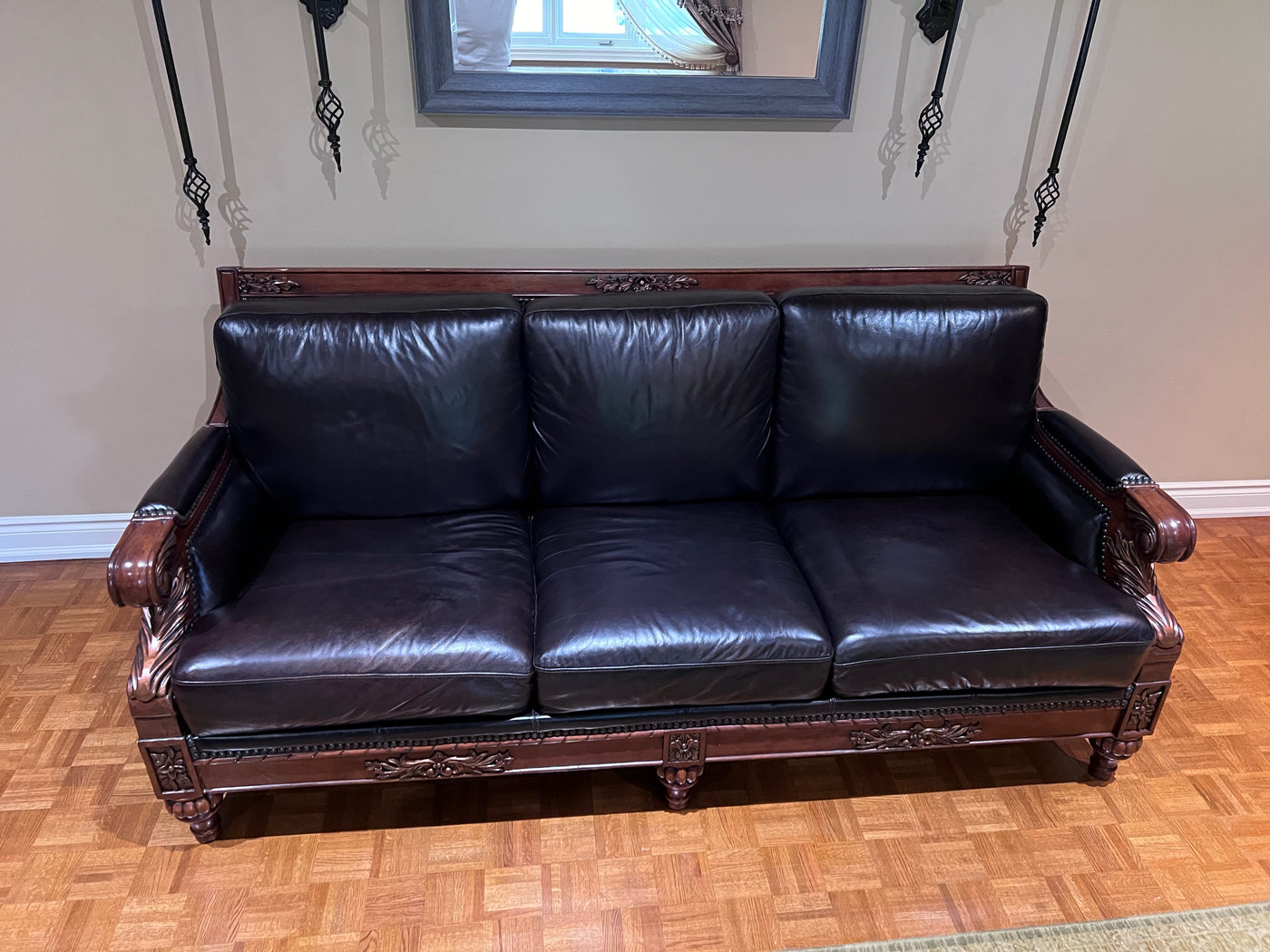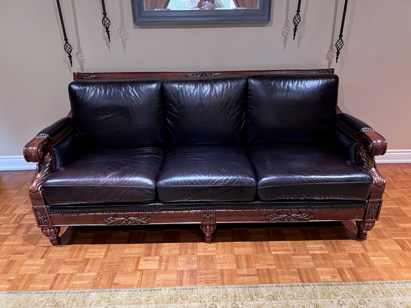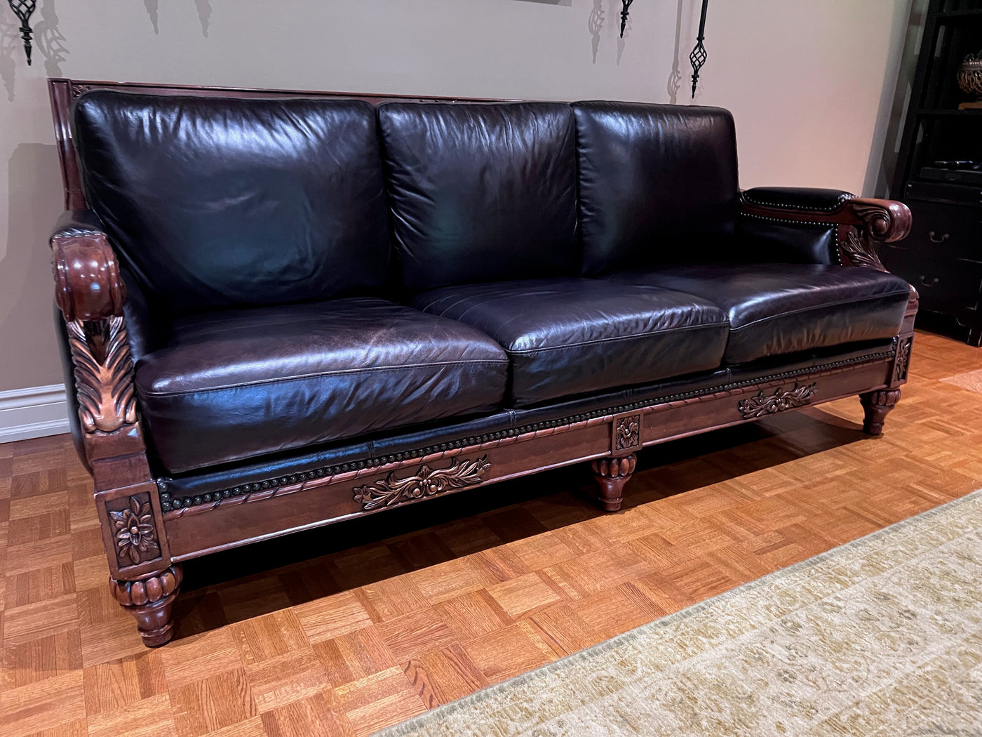 Dark Brown Leather Sofa, Wood Carved Frame.