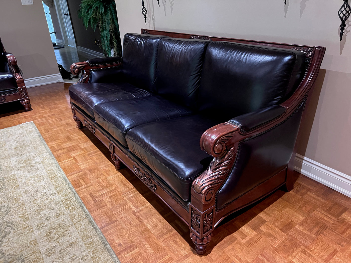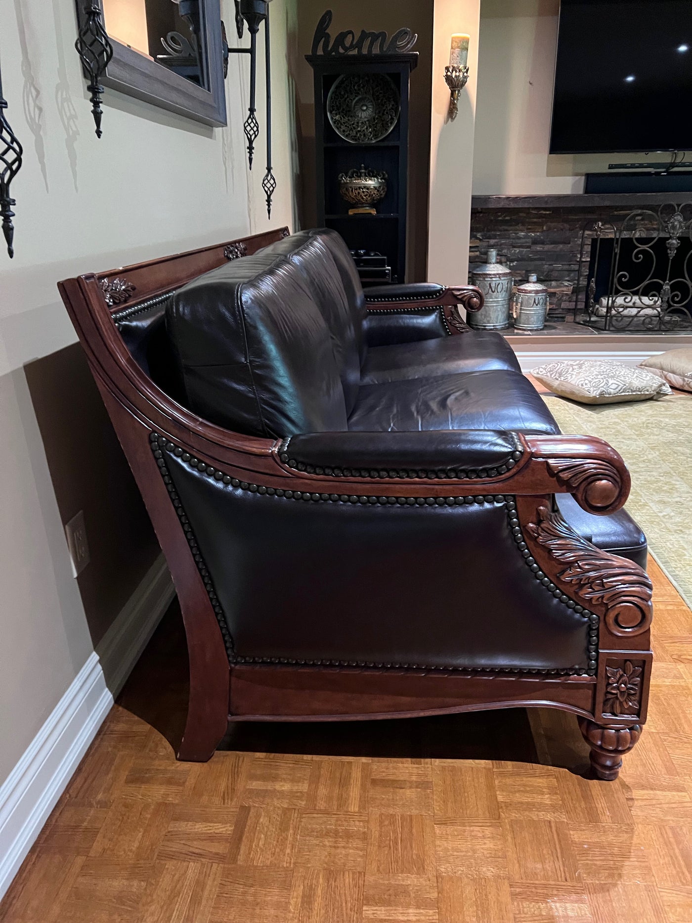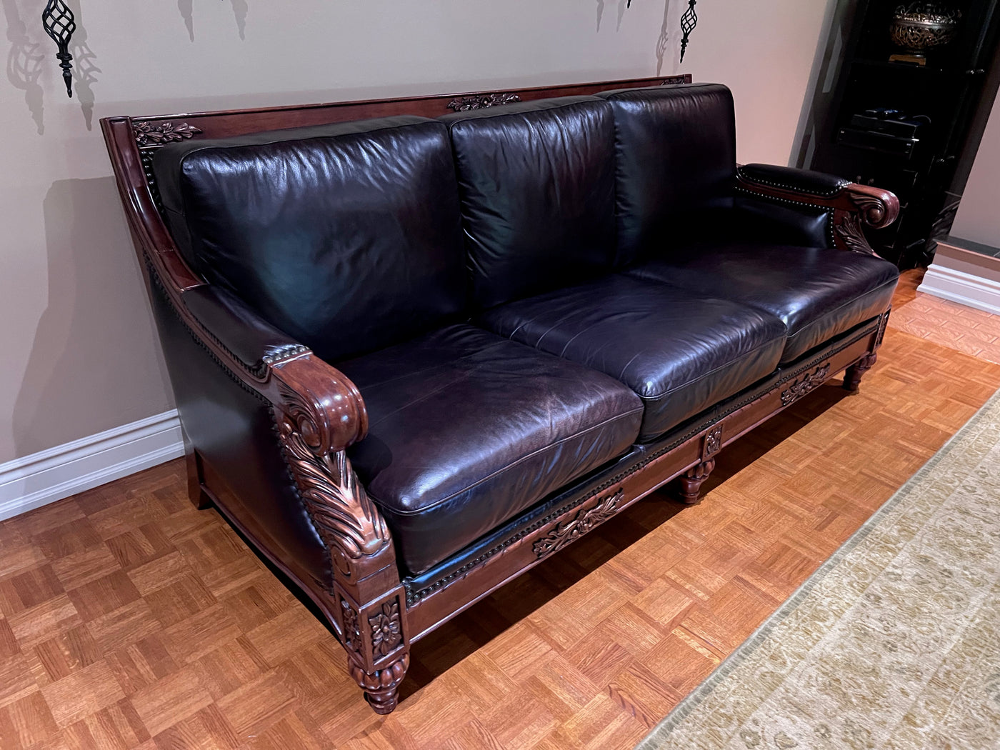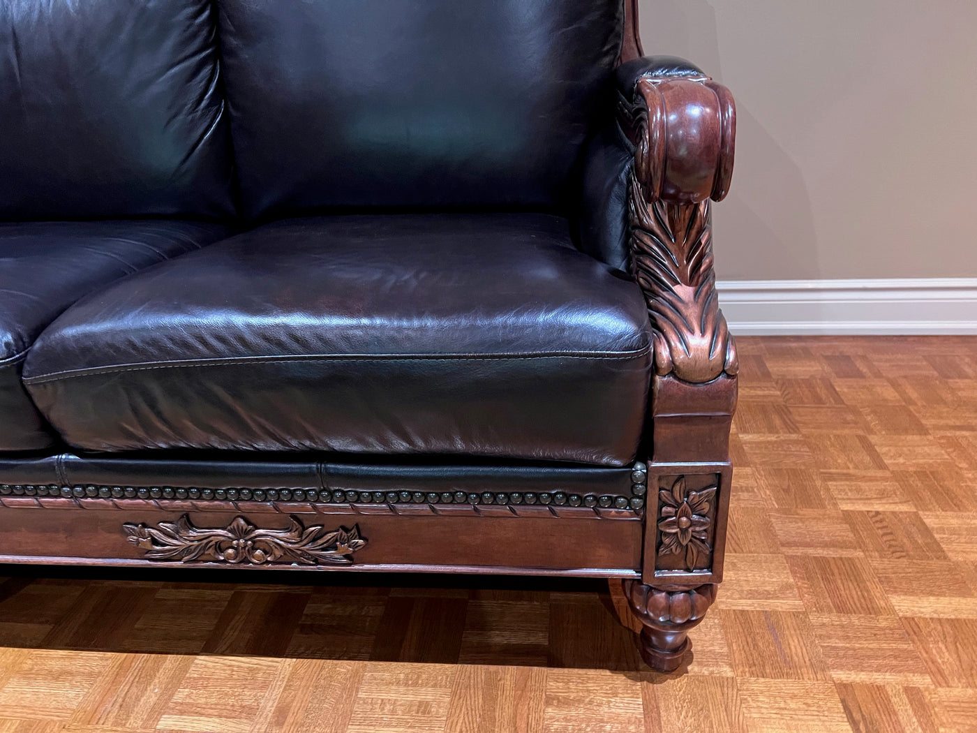 Dark Brown Leather Sofa, Wood Carved Frame.
