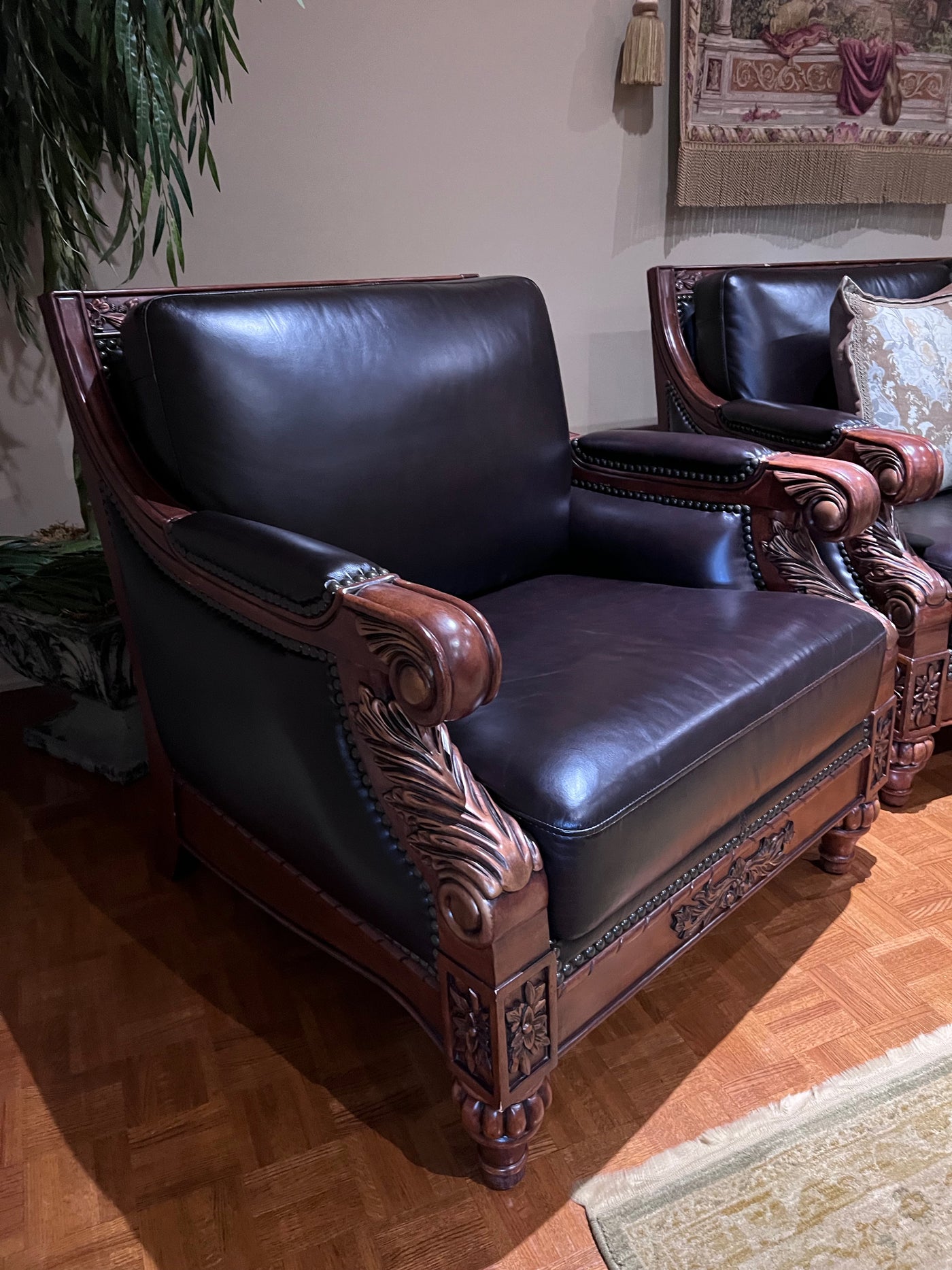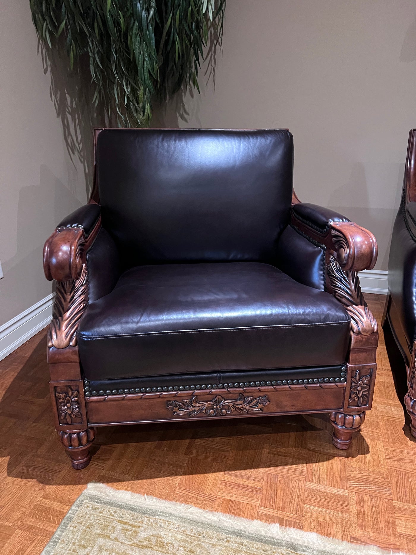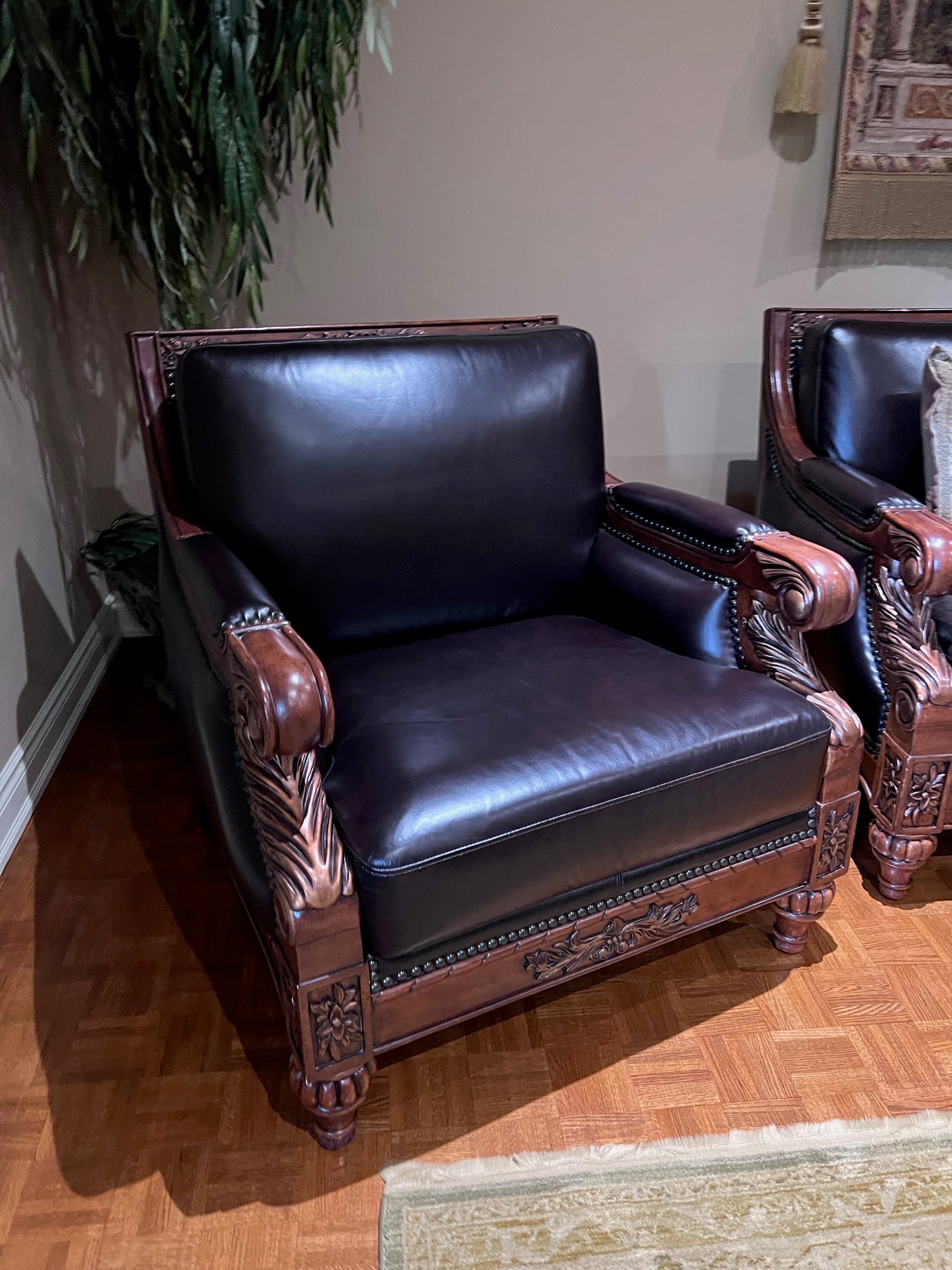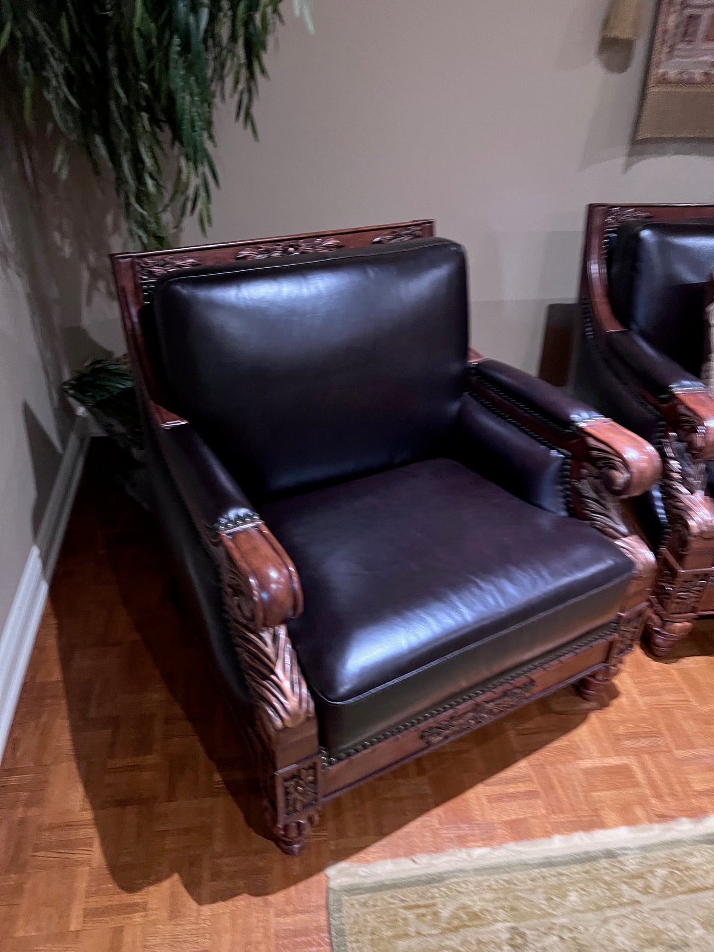 Dark Brown Leather Armchair, Wood Carved Frame.