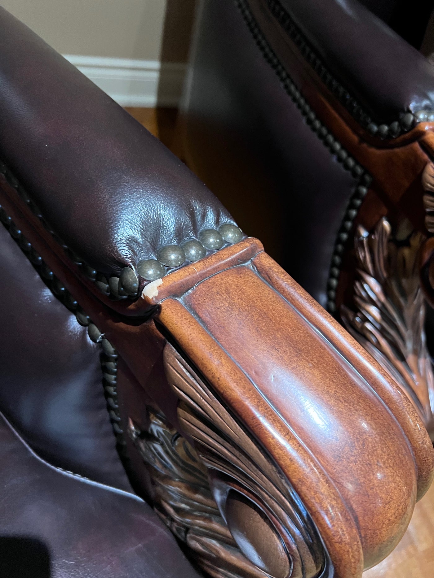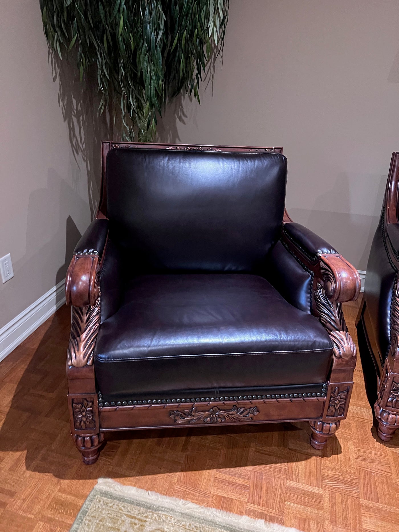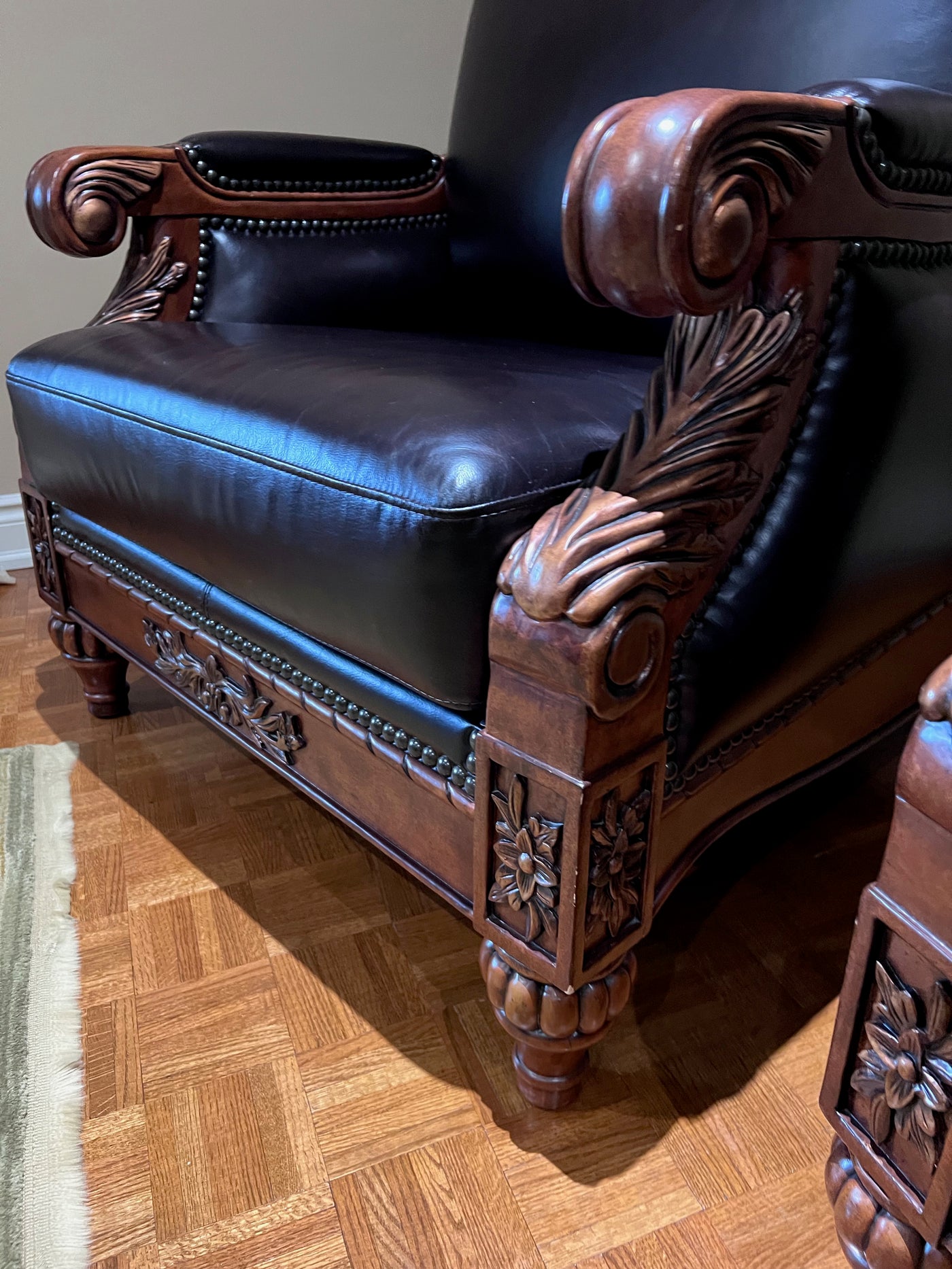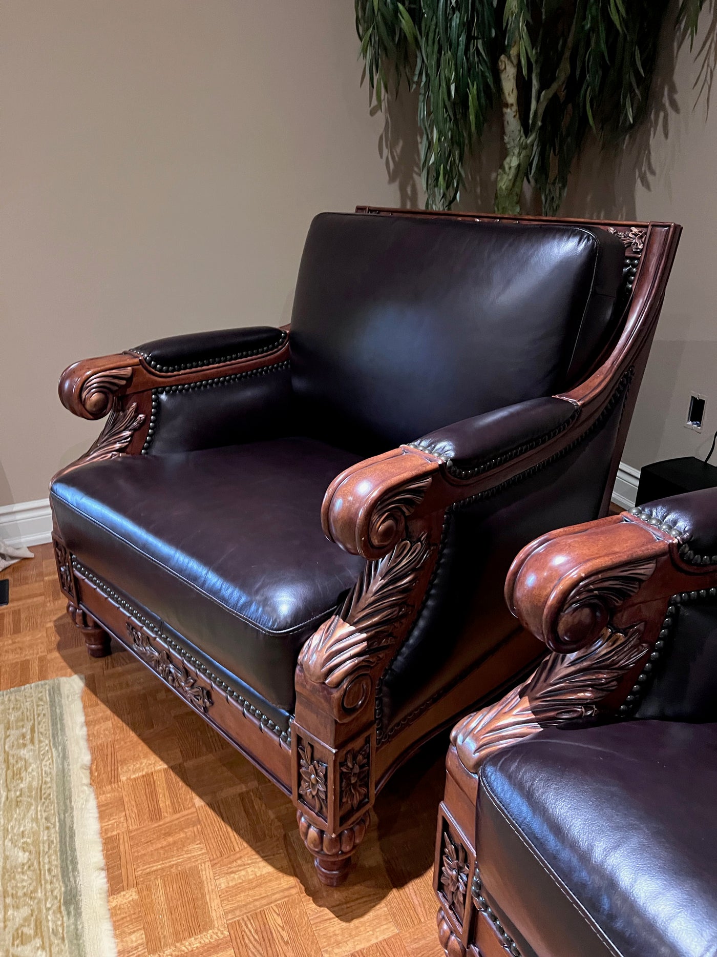Dark Brown Leather Armchair, Wood Carved Frame.