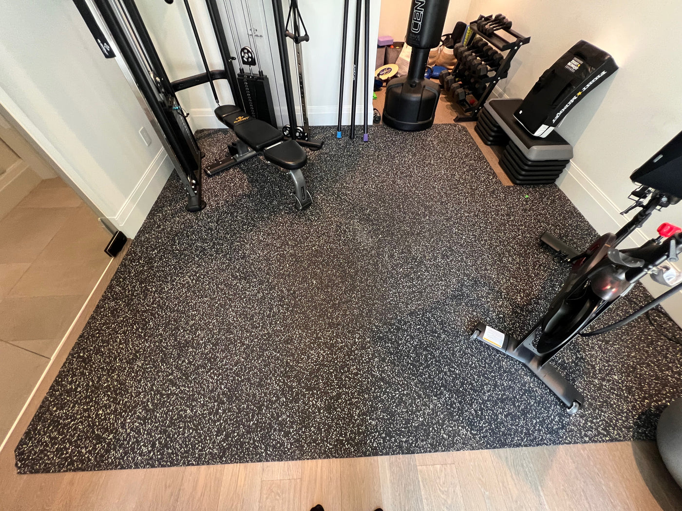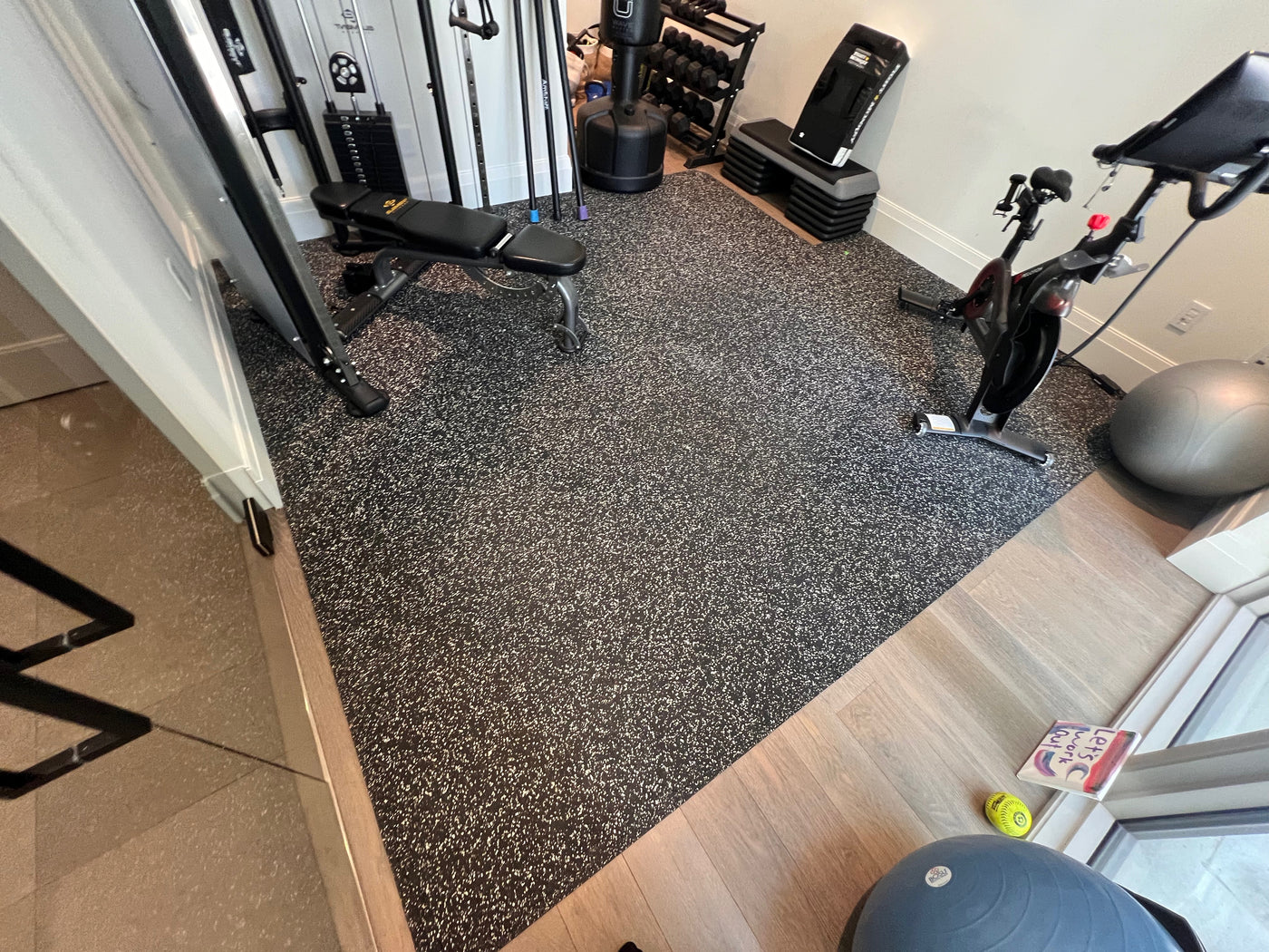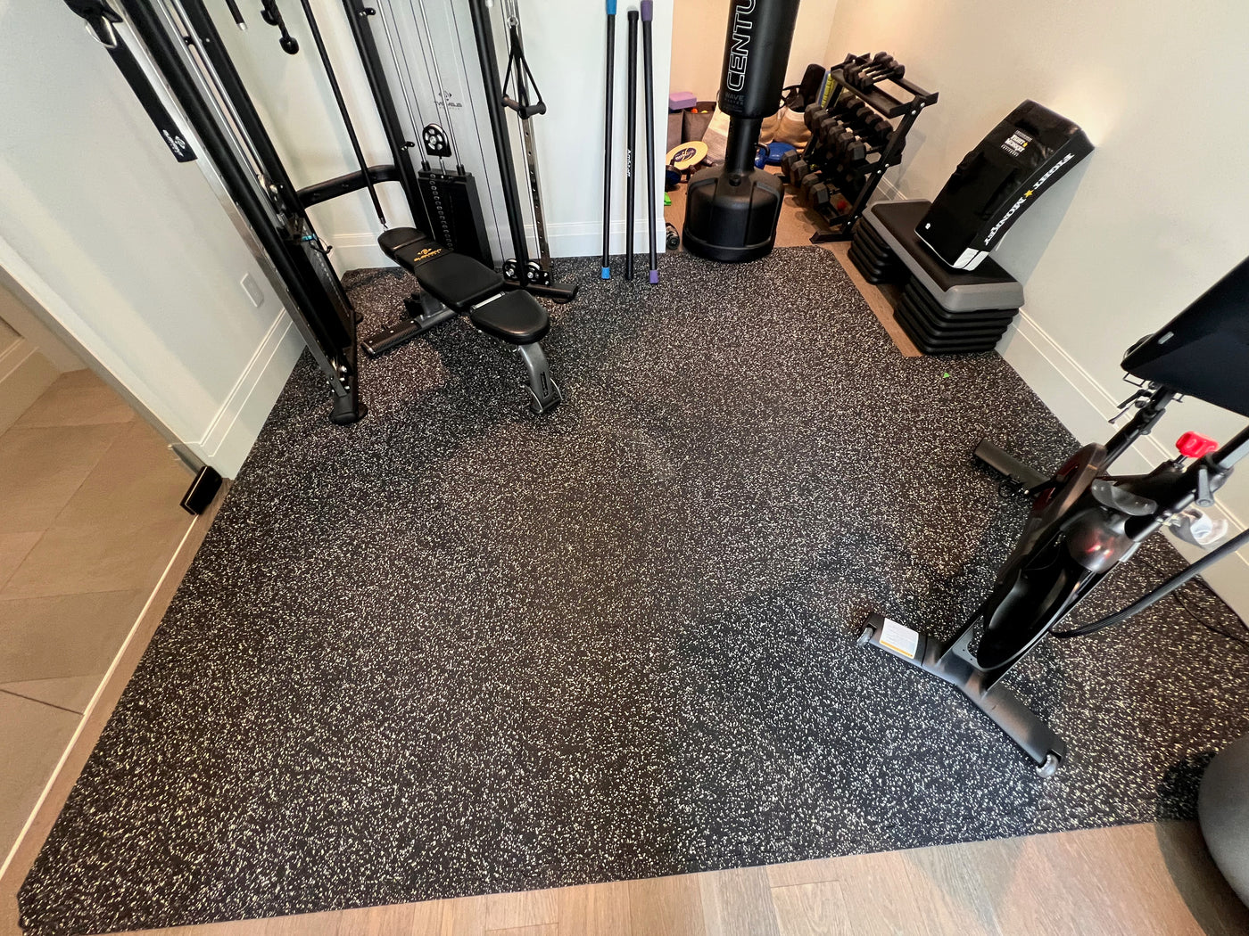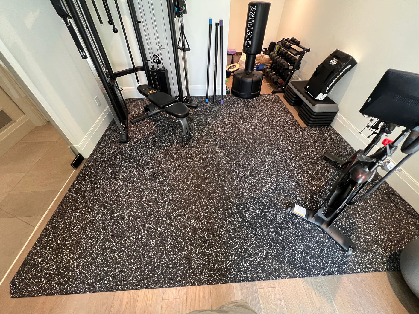 Gym Flooring. Includes all rubber flooring tiles as shown in the pictures. The overall dimensions as shown in the current configuration are: 123" x 143"