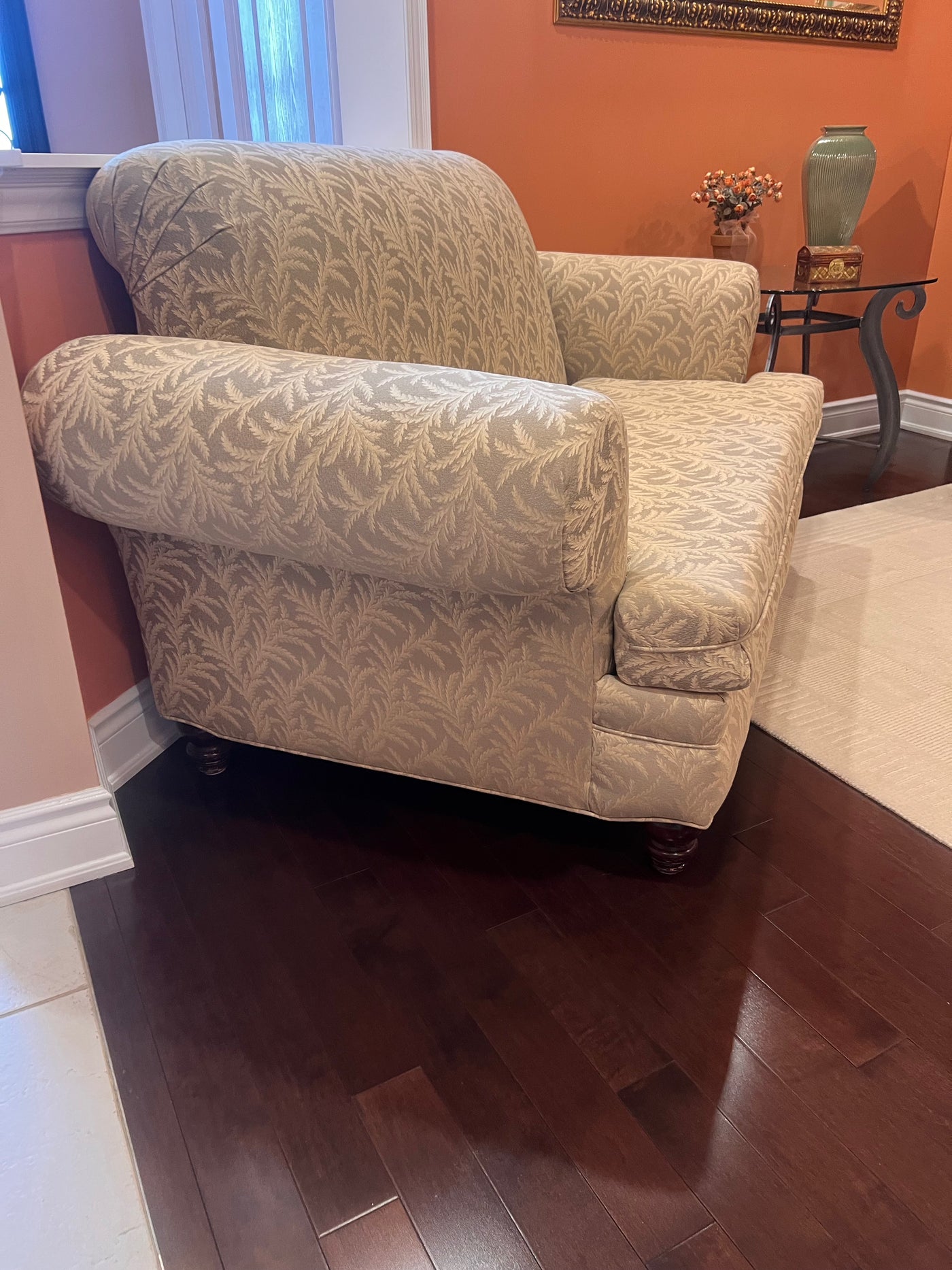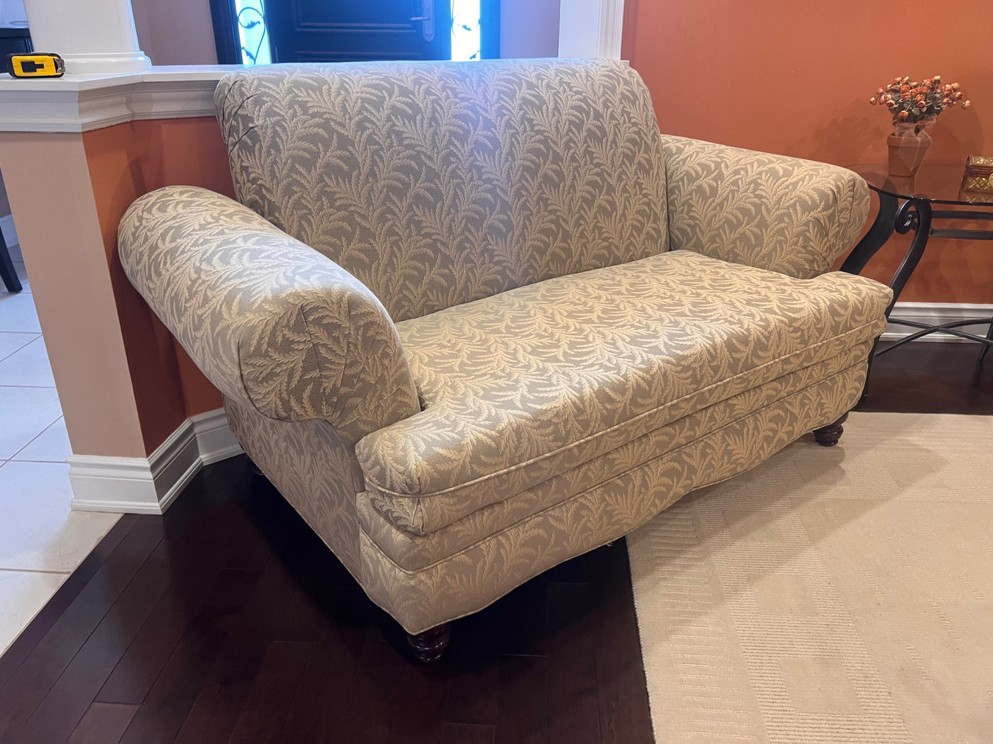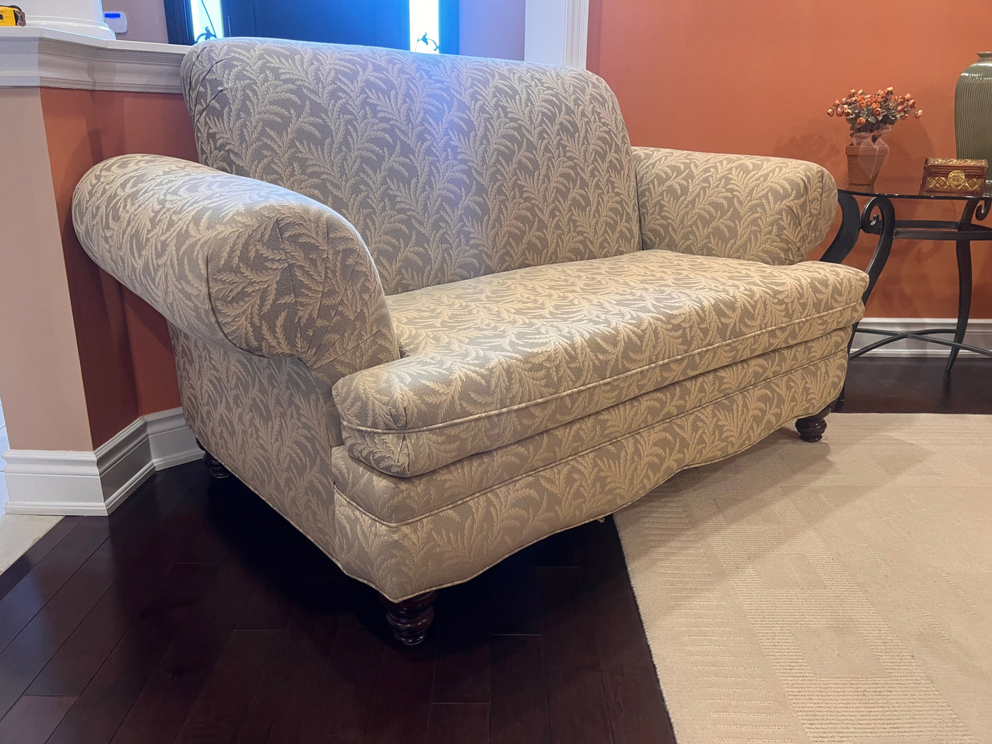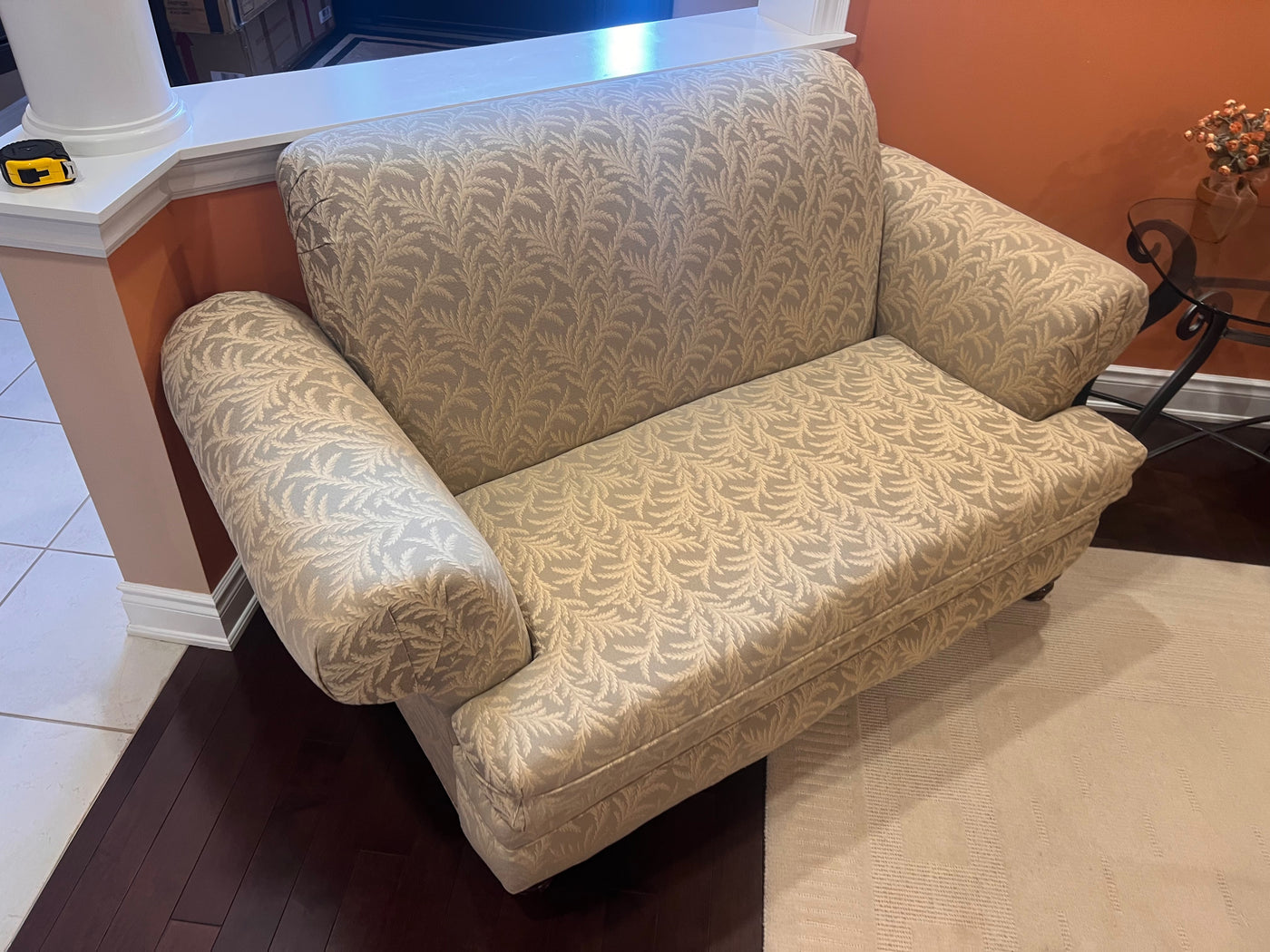 Upholstered Love Seat/Oversized Armchair. In good condition overall!
