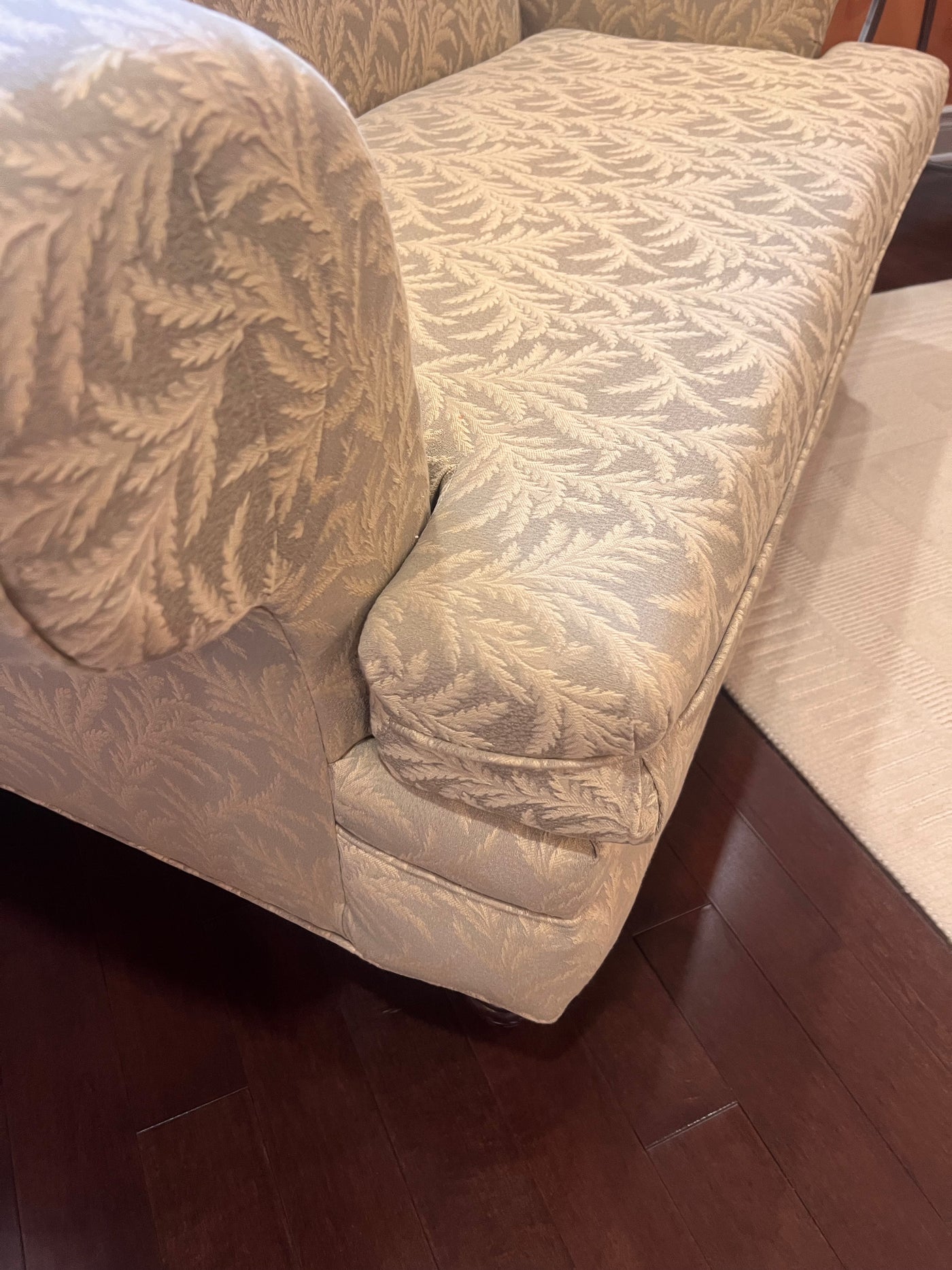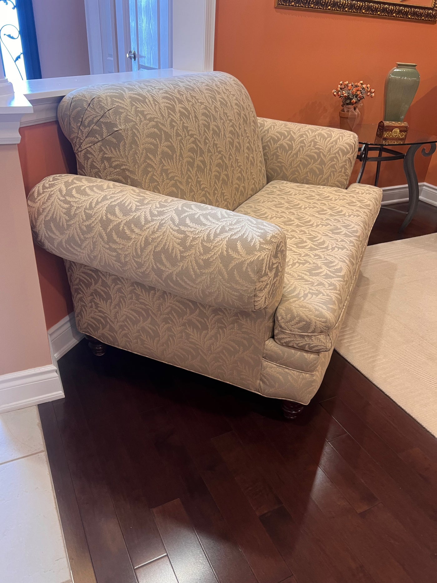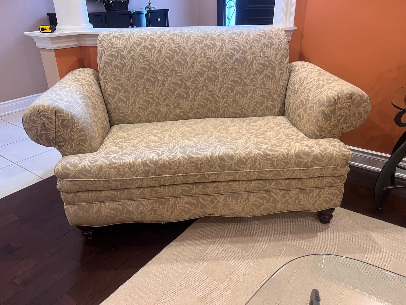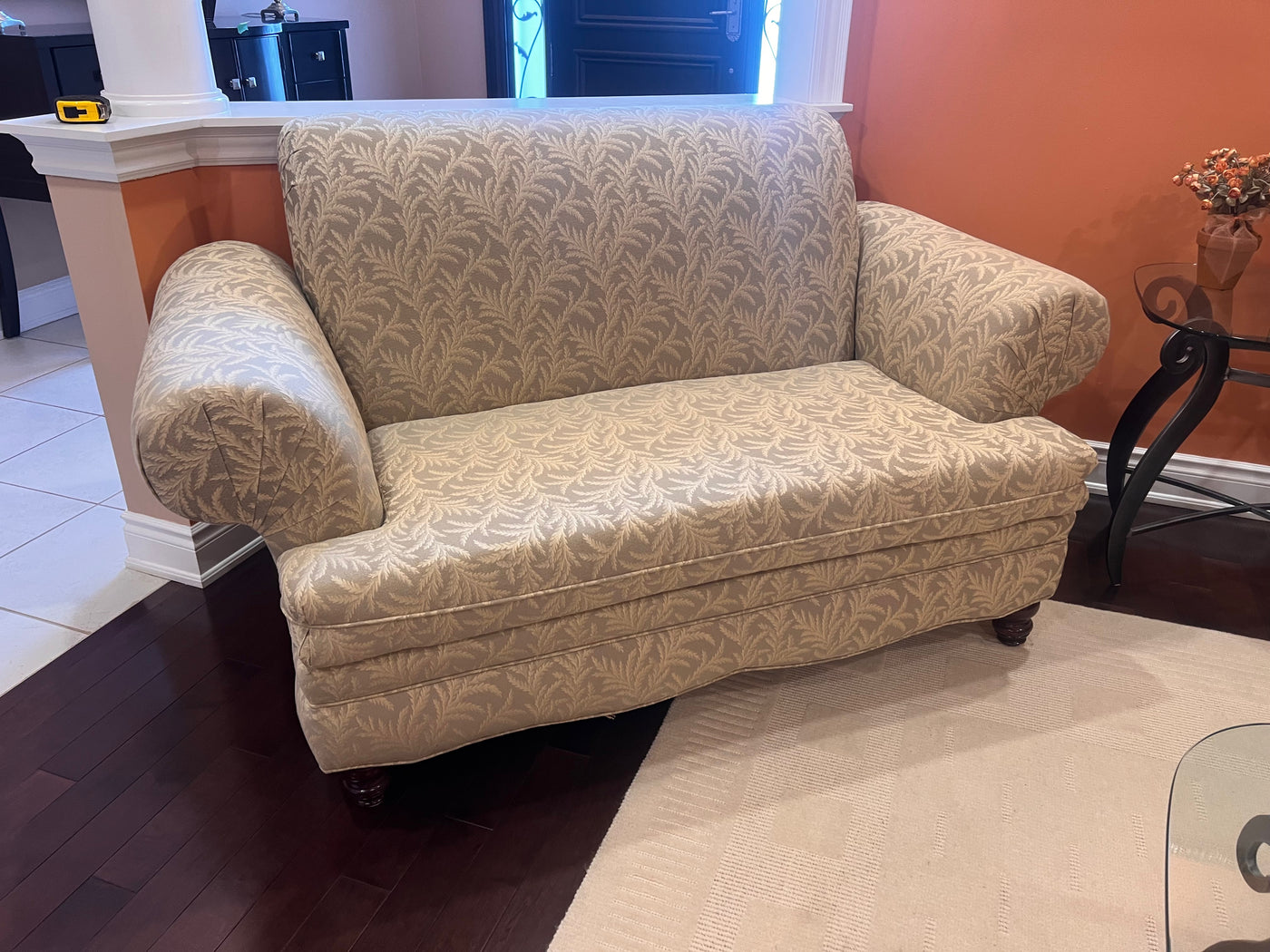 Upholstered Love Seat/Oversized Armchair. In good condition overall!