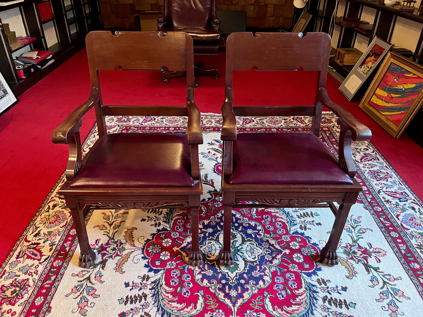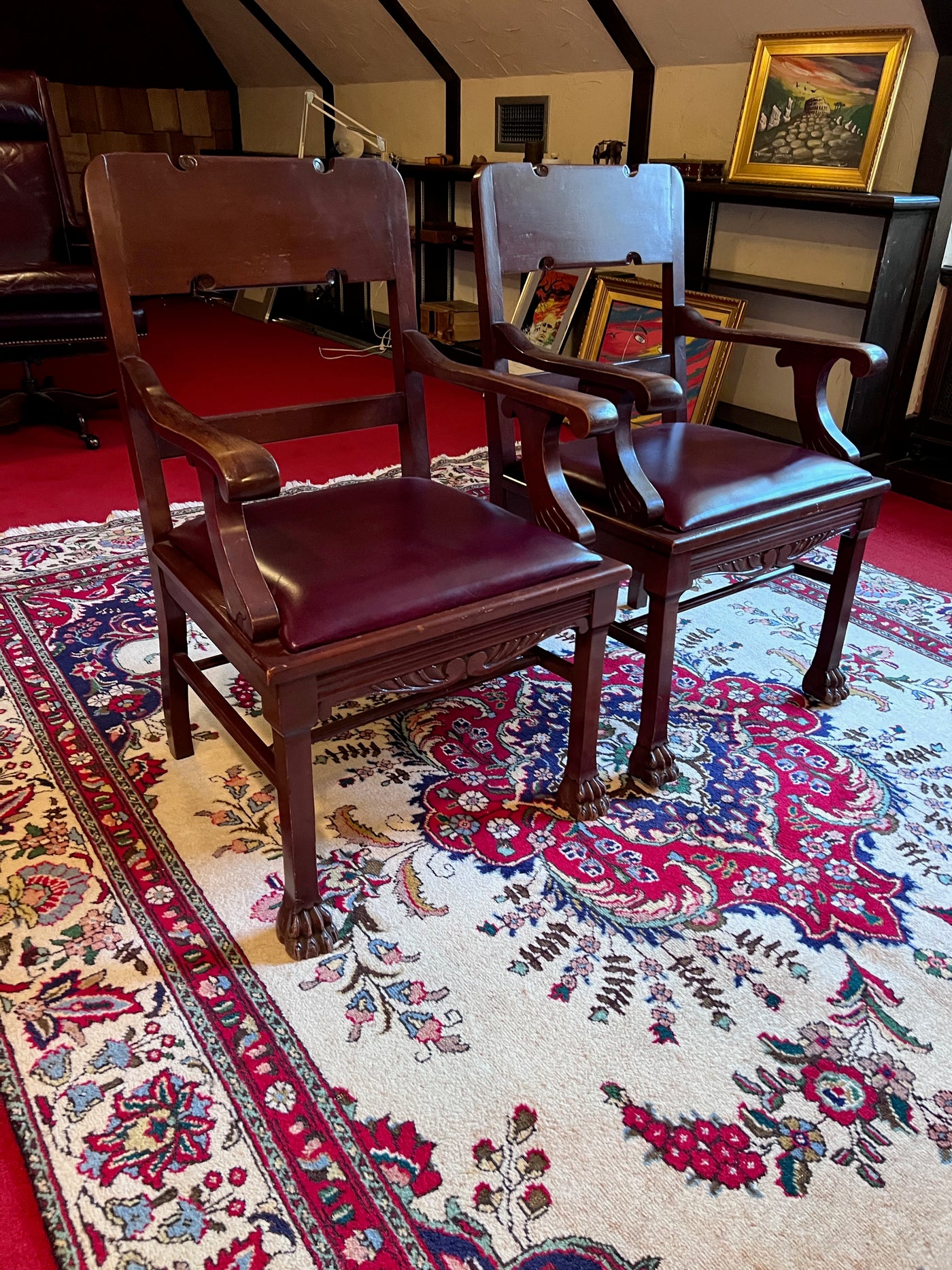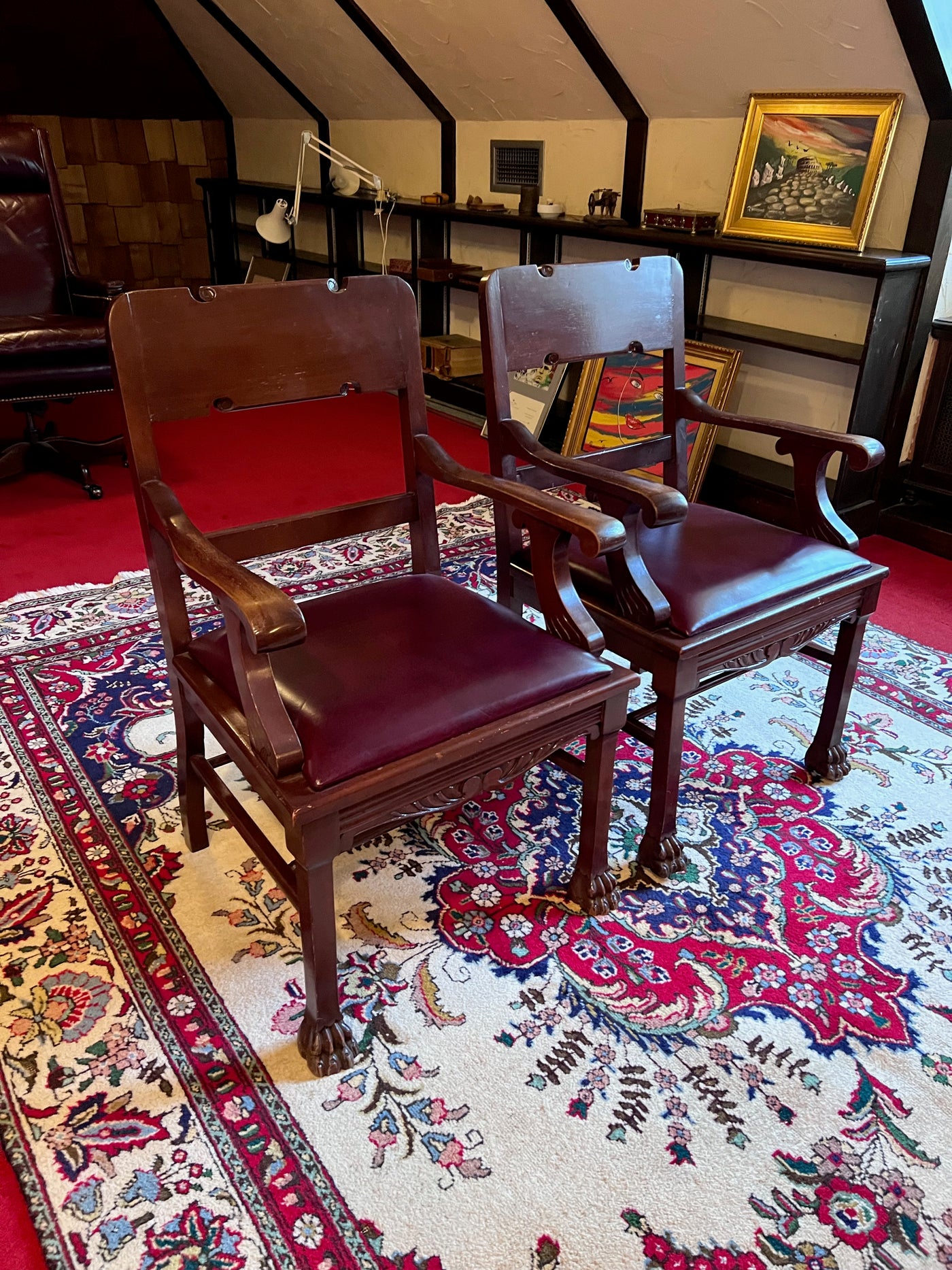 Pair of Antique Chairs, Red Leather Seats with Clawed Feet