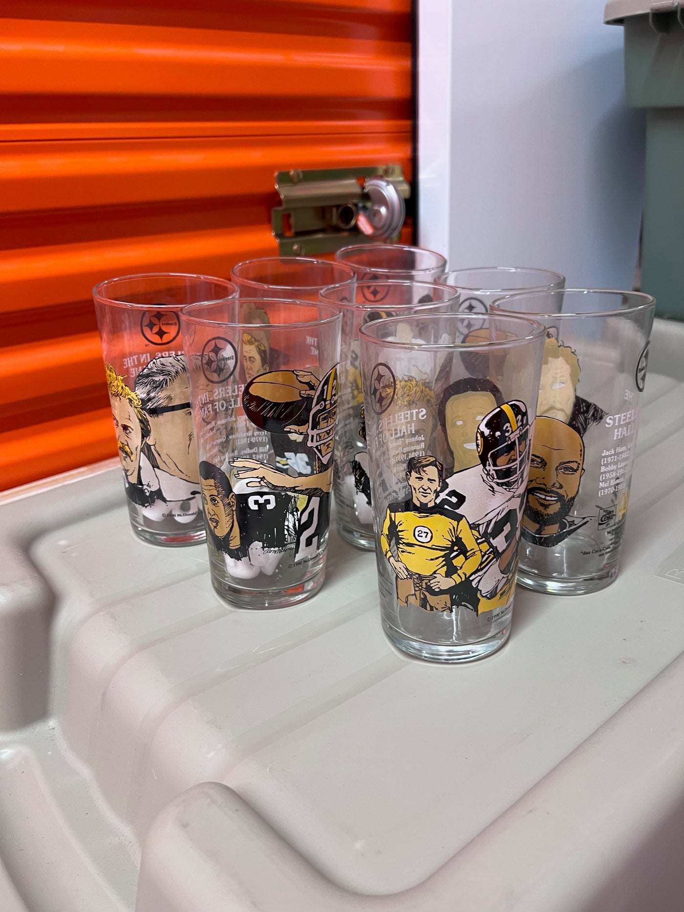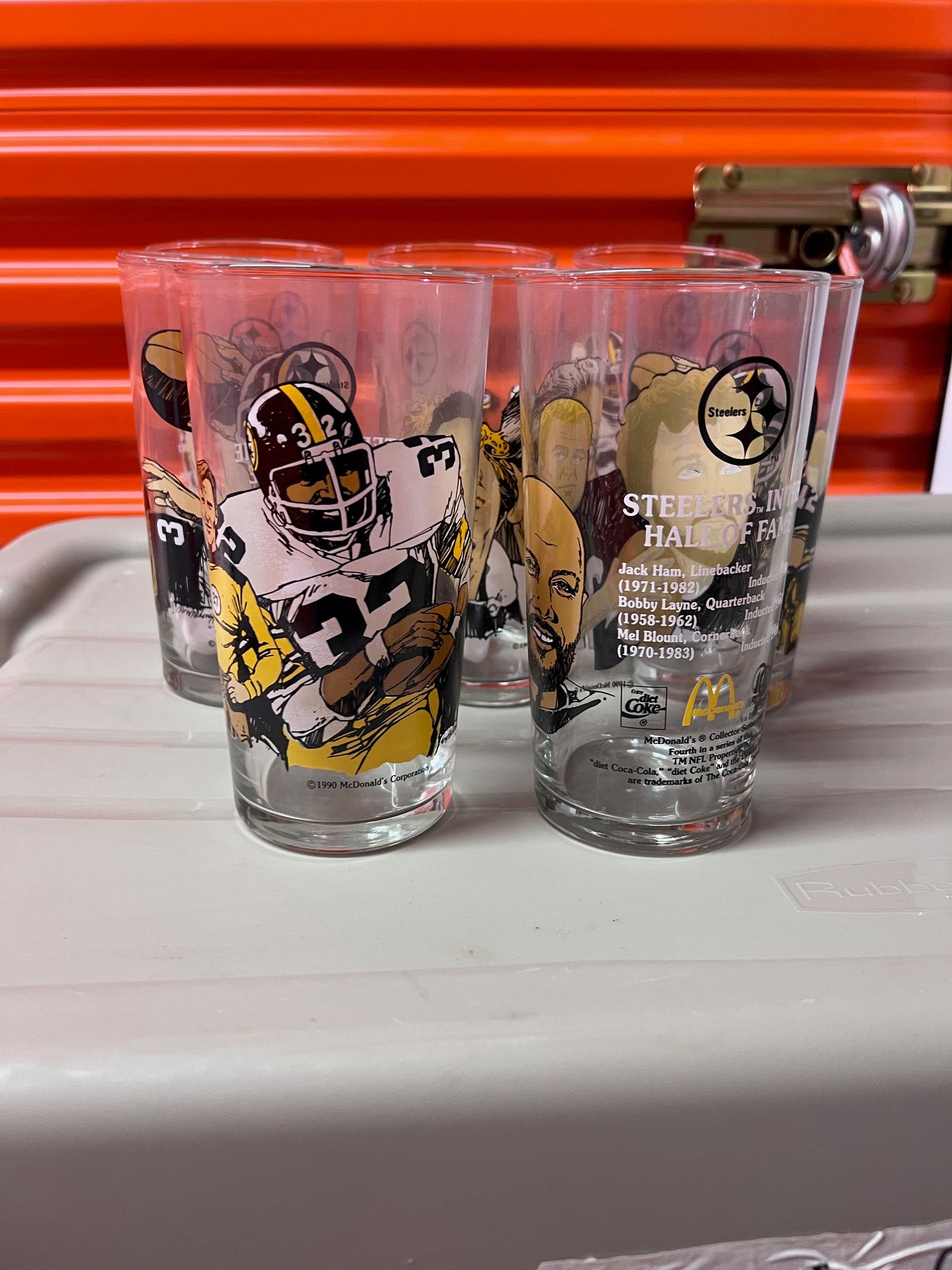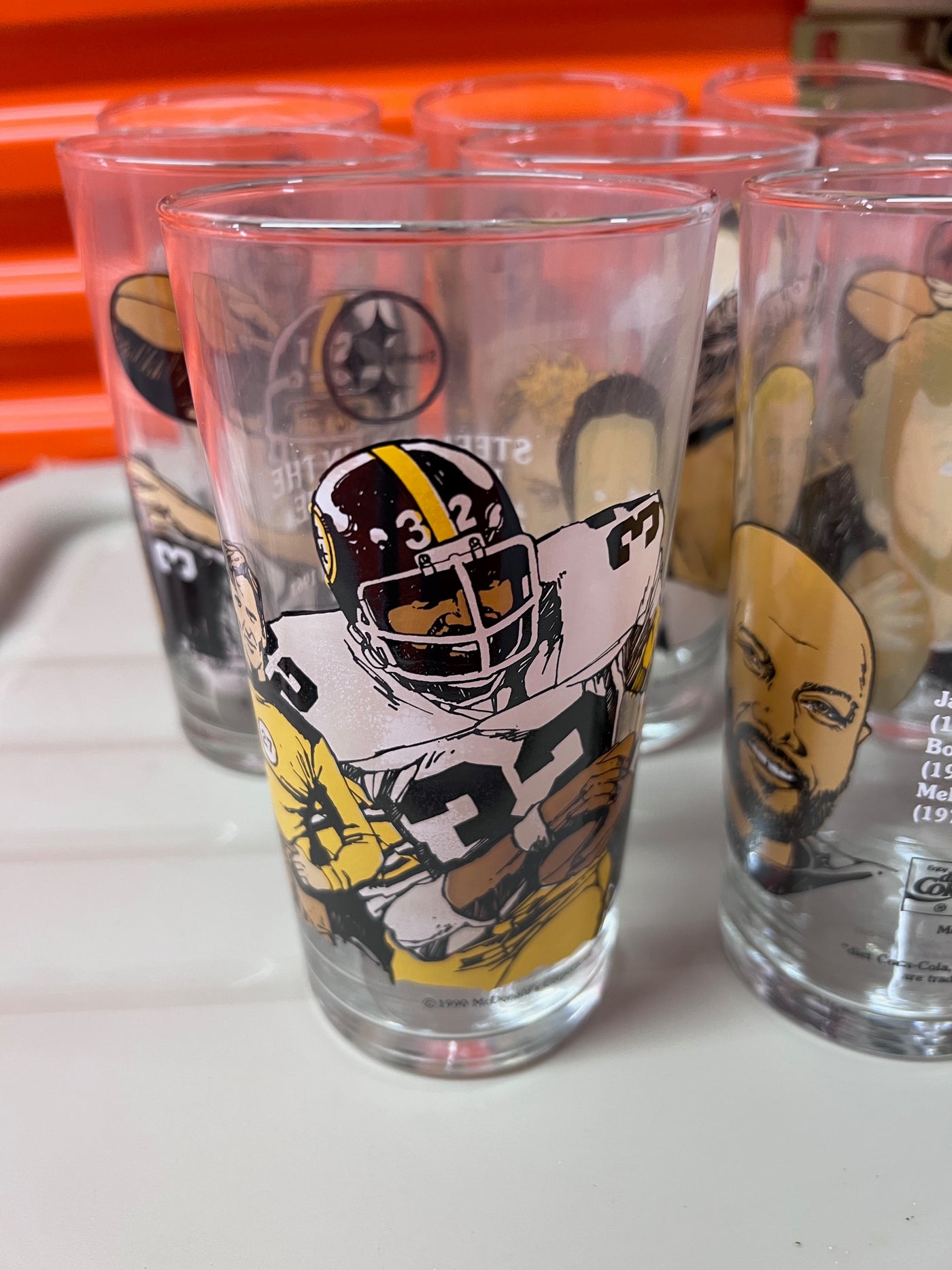 8 Vintage 1990 Pittsburgh Steelers in the Hall of Fame McDonalds Coca-Cola Glasses.