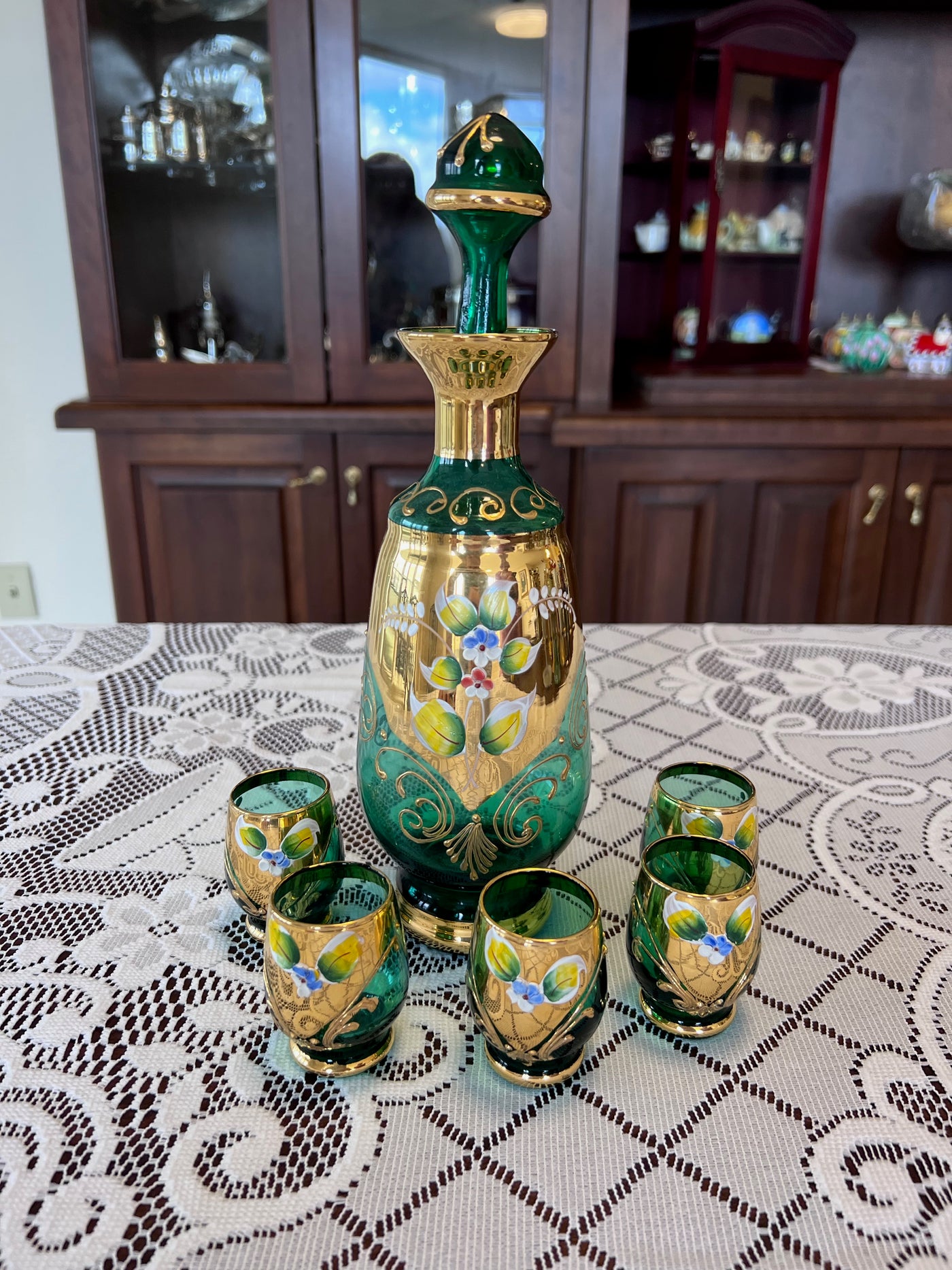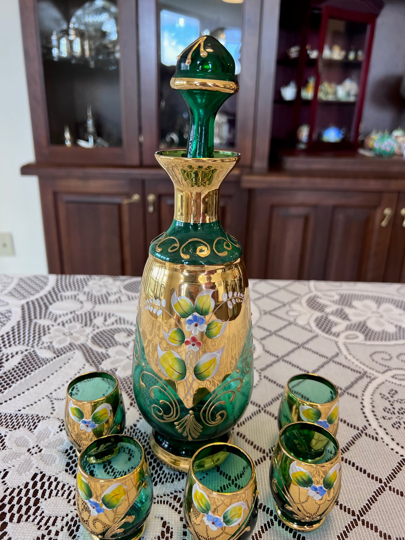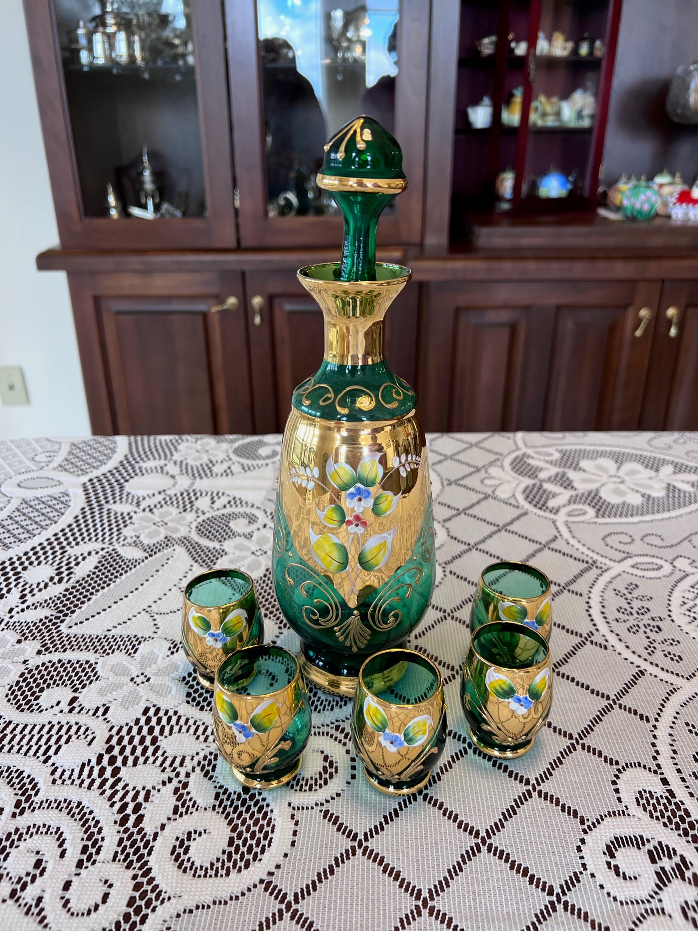 Vintage Murano Made in Italy Green Art Glass Decanter + 5 Shot Glasses