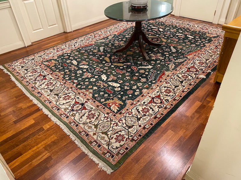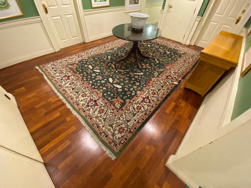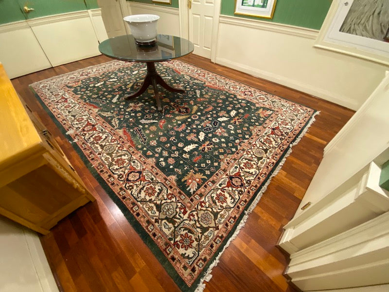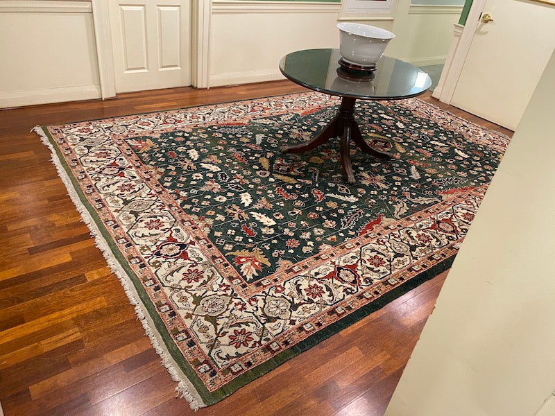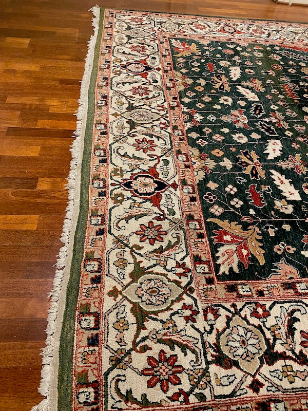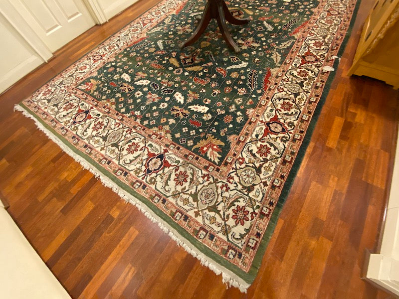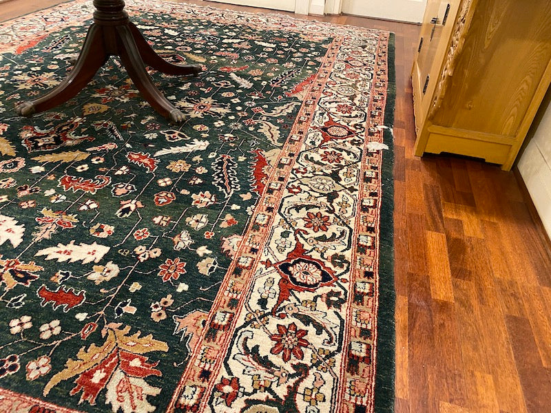“Mahindra” Hand knotted using 100% vegetable dyed, hand spun, wooden yarn- “Black Mountain Looms” Indian Rug- Green.