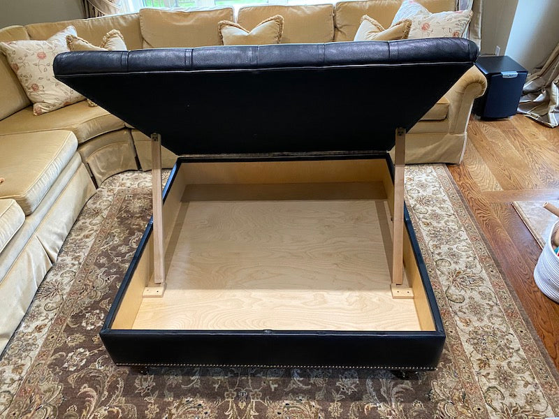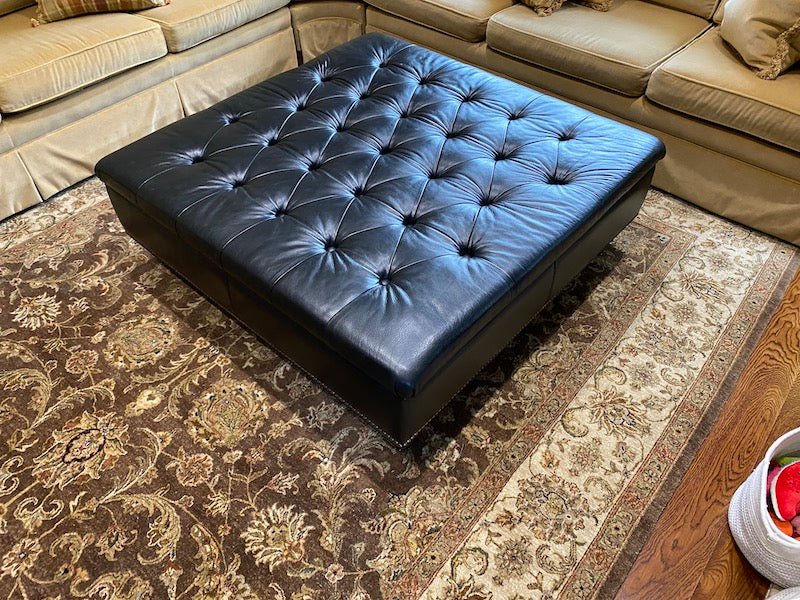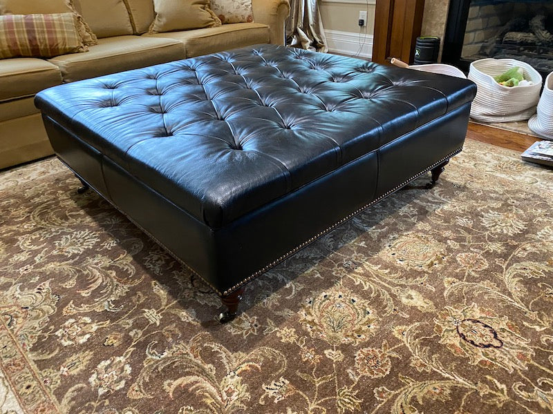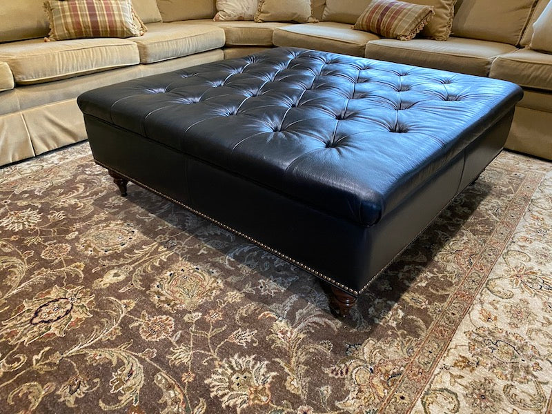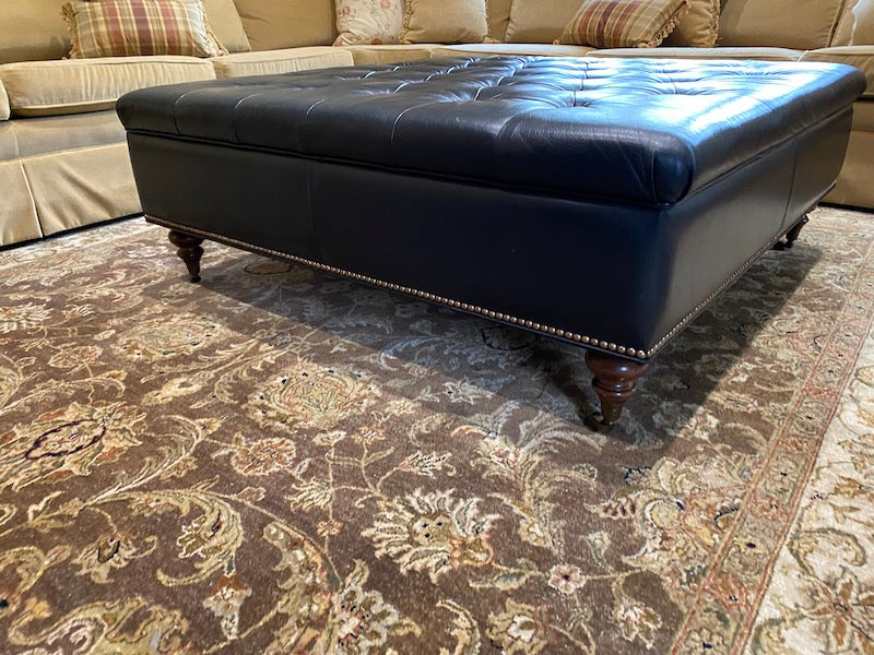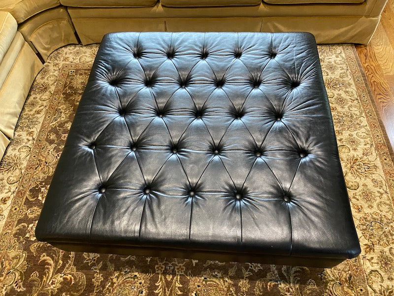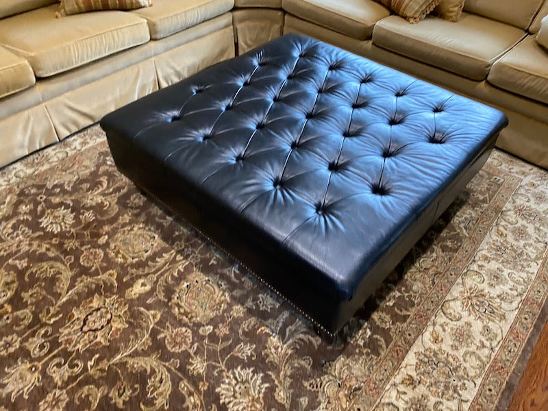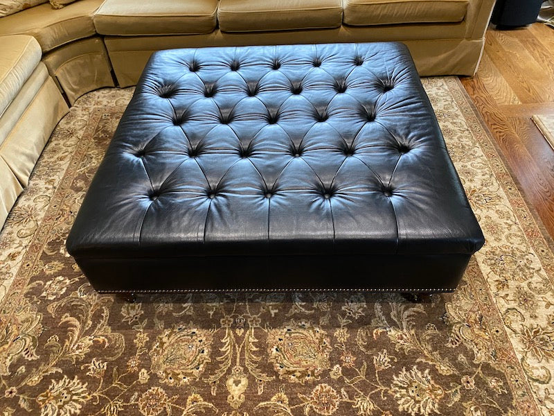 Cooper Bros Black Leather, Tufted Storage Ottoman on Casters.
