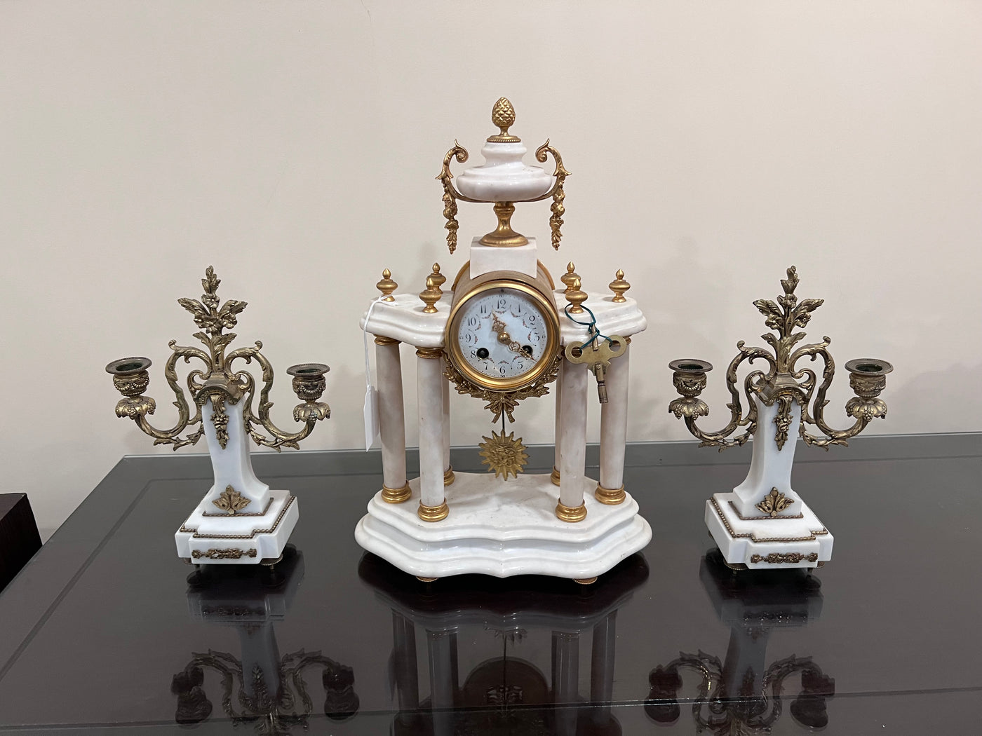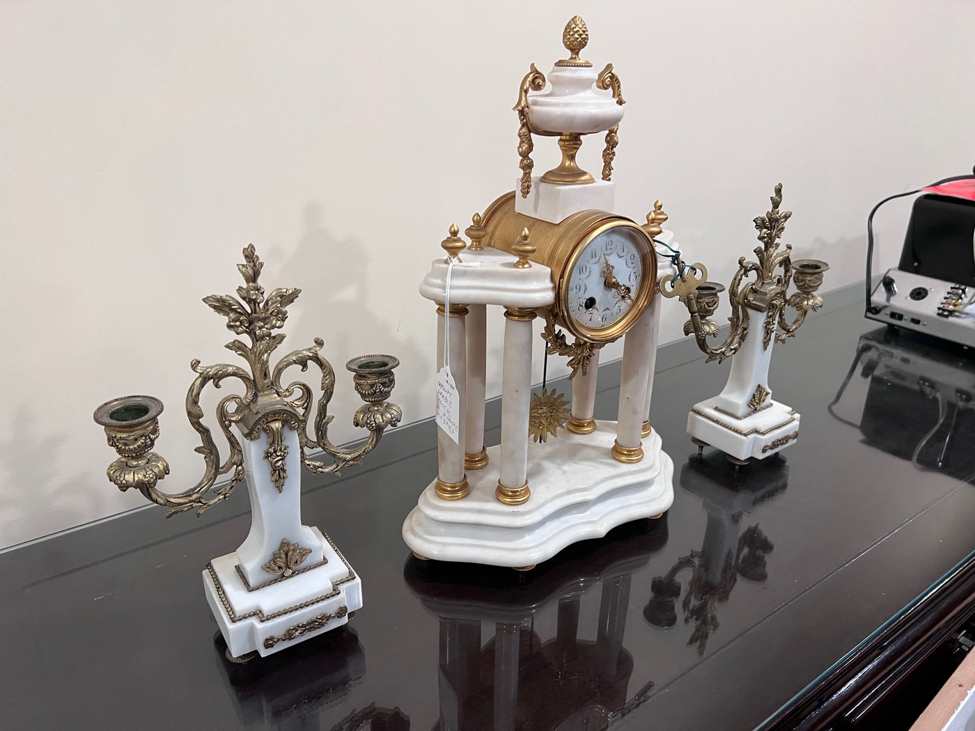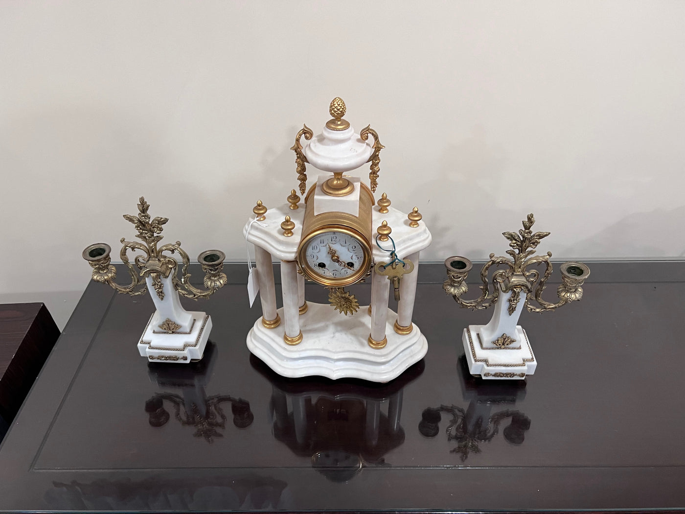 Antique French Marble Mantel Clock with 2 Candle Holders.