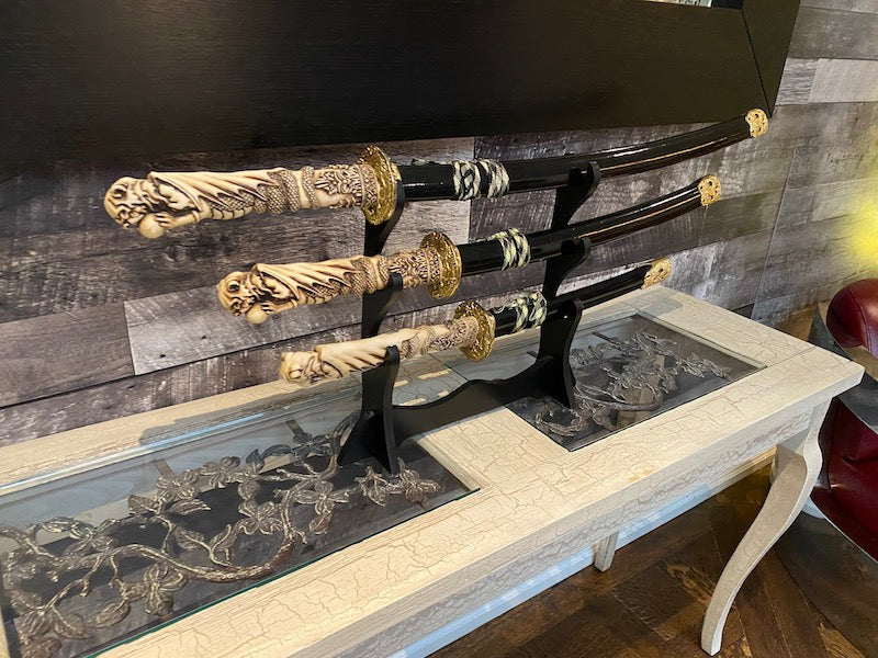 Set of 3 Steel Blade Samurai Swords on Stand, Decor.
