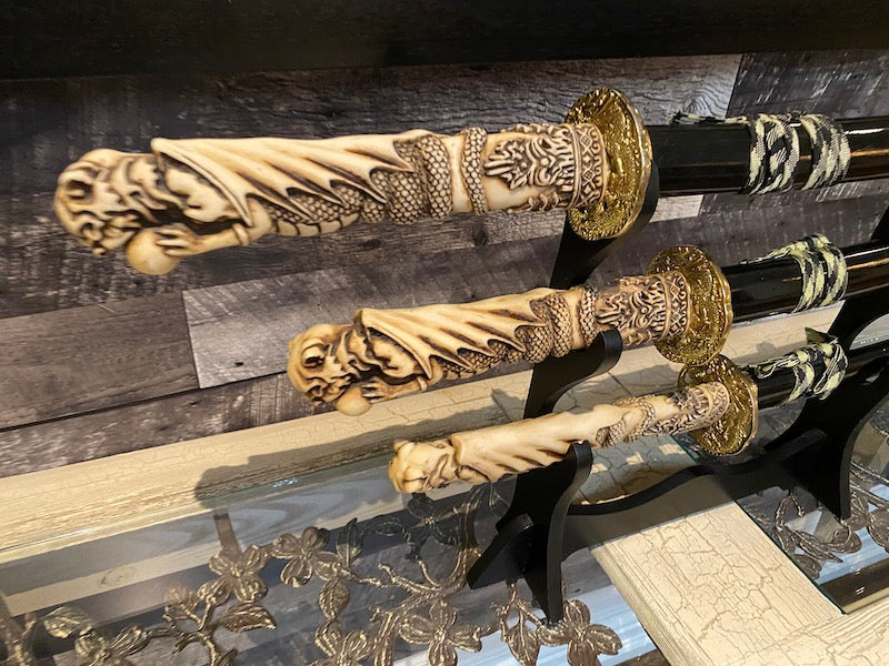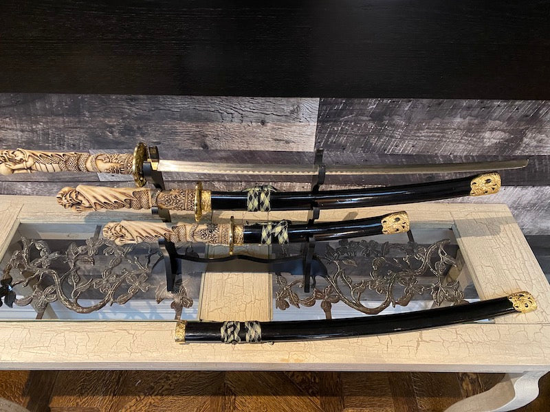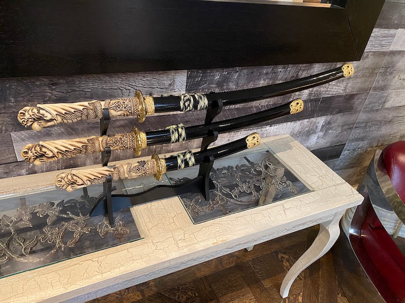 Set of 3 Steel Blade Samurai Swords on Stand, Decor