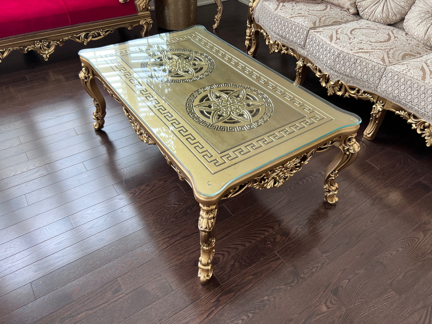 'Paradise Home Decor Furniture' Gold Wood Carved Glass Top Coffee Table.
