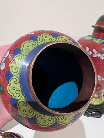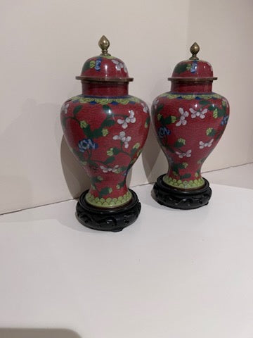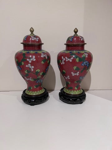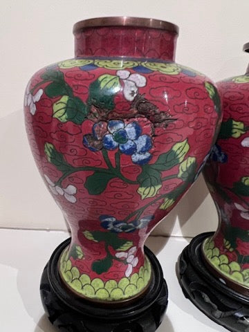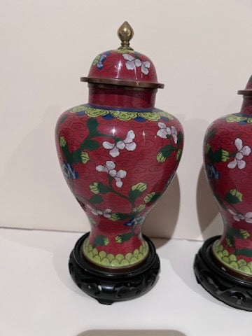 Pair of Chinese Red Cloisonné Lidded Vases, with Stands