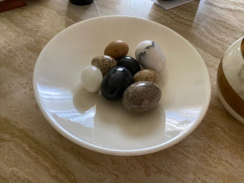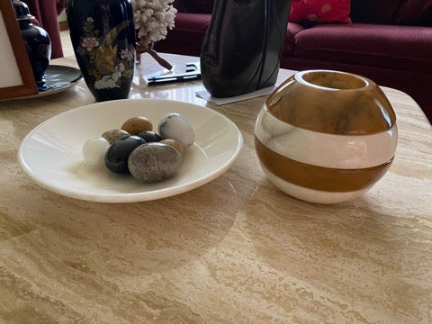 This lot includes a multi-level decorative vase and a large bowl with decorative stones.