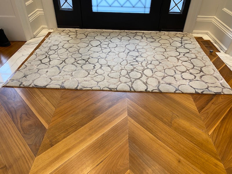 Condition: this rug has been heavily walked on and does have some wear and stains consistent with regular use. There is also 2 rips/pulls on the edges of the rug. PLEASE VIEW THE UP CLOSE PICTURES FOR FULL DISCLOSURE.