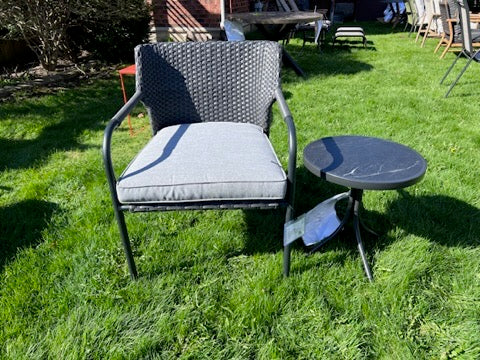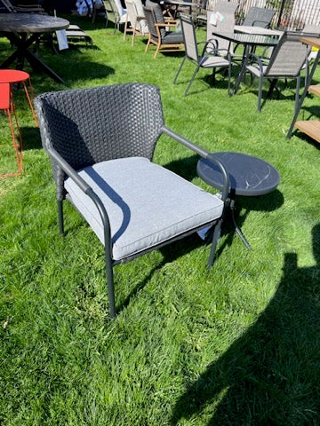 Wicker and Steel Armchair w/Grey Cushions + Side Table.