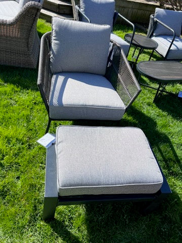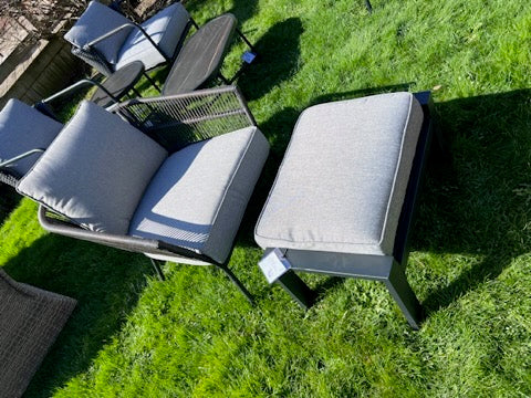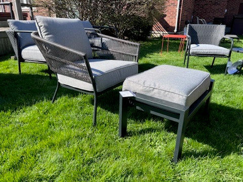 Wicker and Steel Chair + Ottoman w/Grey Cushions.