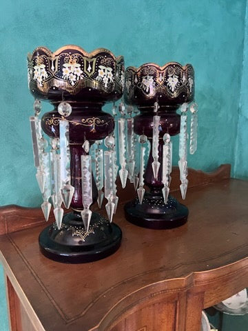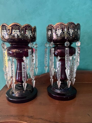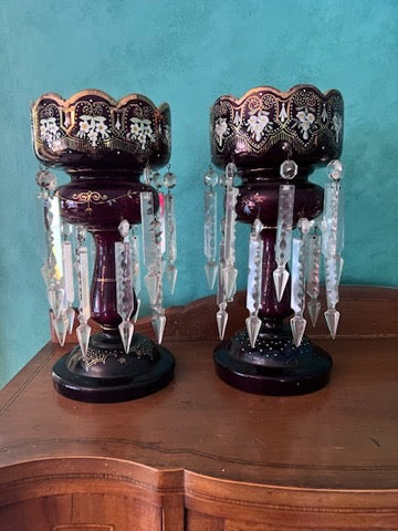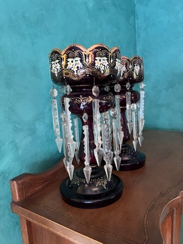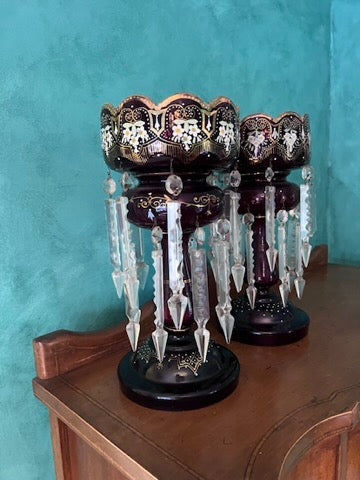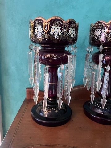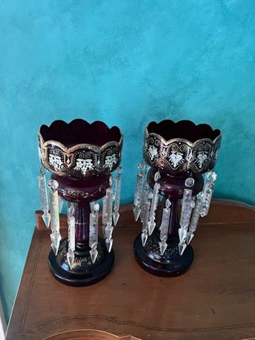 Pair of Antique Bohemian Ruby Mantel Lusters with Prisms.