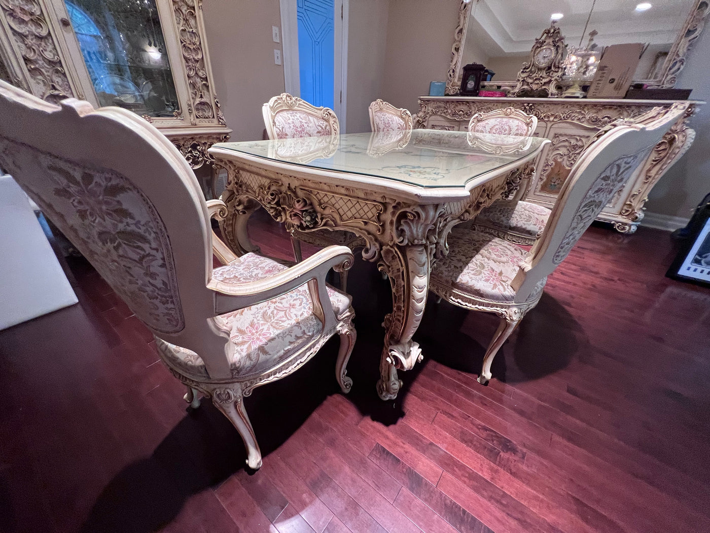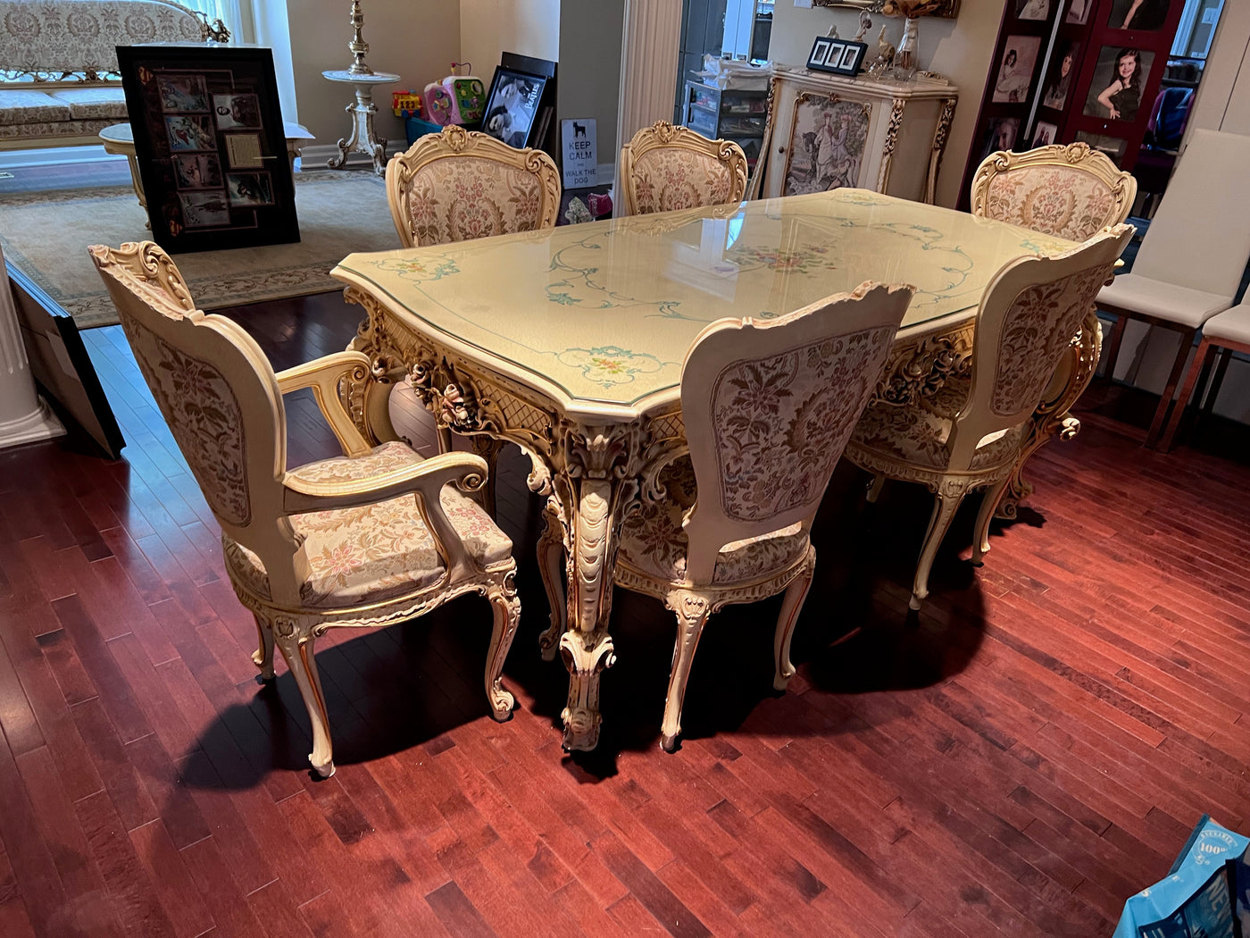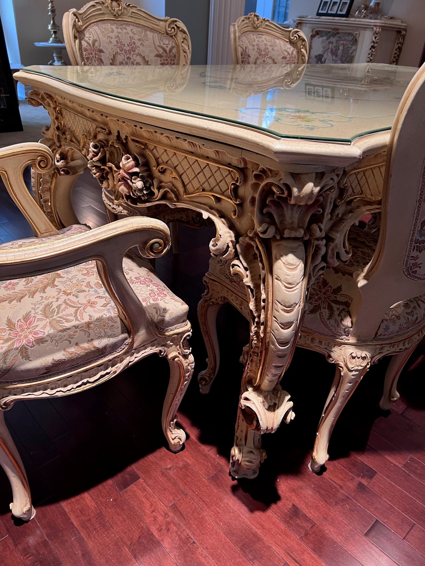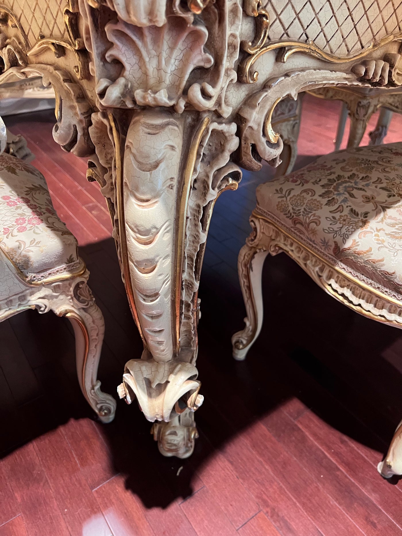 Antique French Regency White Carved Dining Table + 6 Chairs