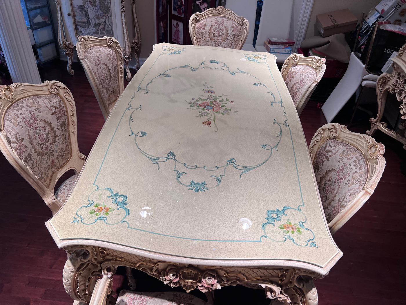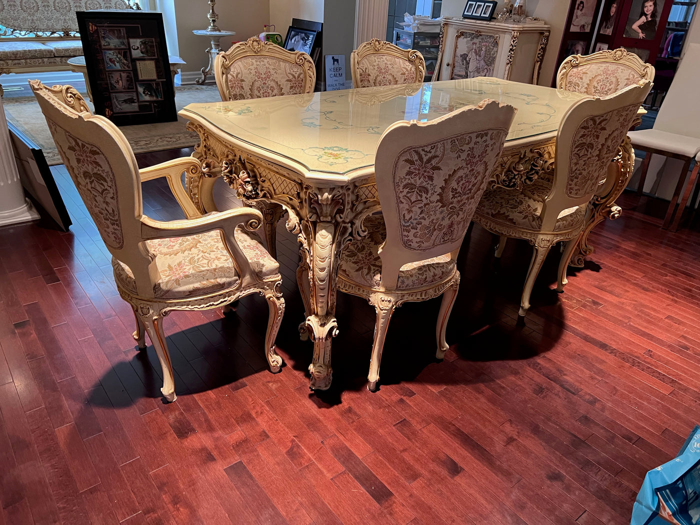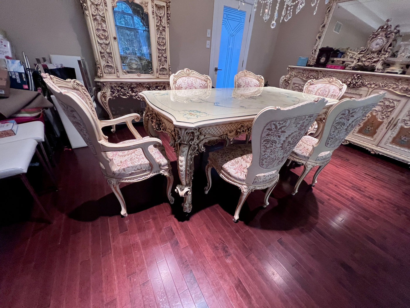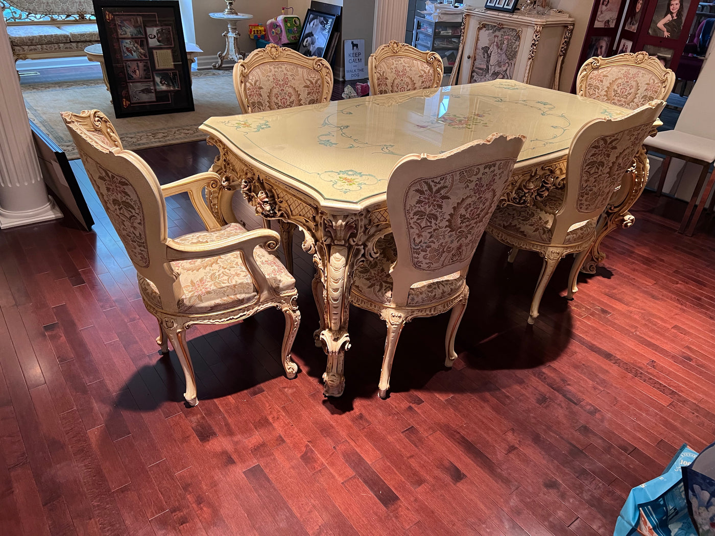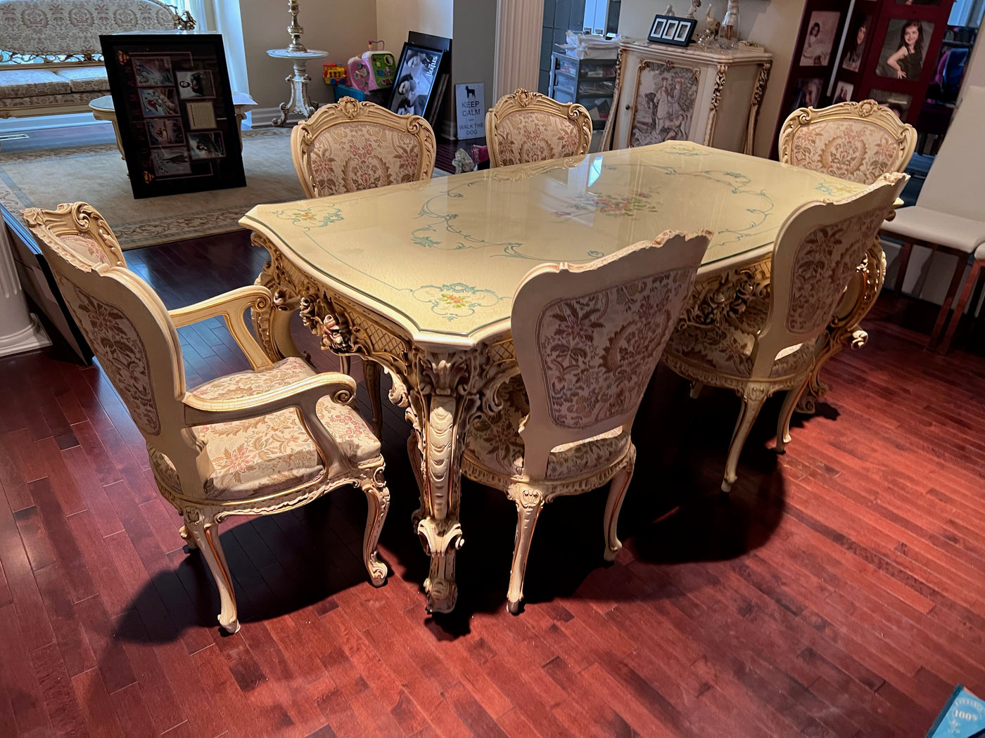 Antique French Regency White Carved Dining Table + 6 Chairs